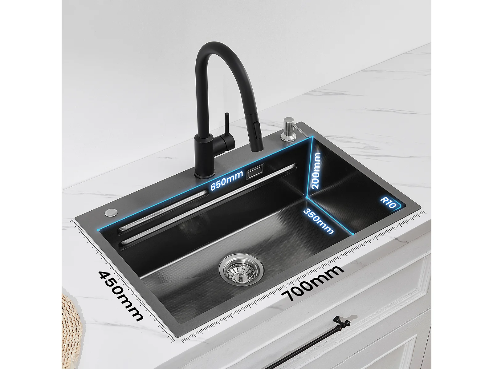 Évier de Cuisine 1 Cuve 70×45×21.5 cm + Egouttoir + Vasque + Distributeur de Savon + Mitigeur de Cuisine en Inox Brossé