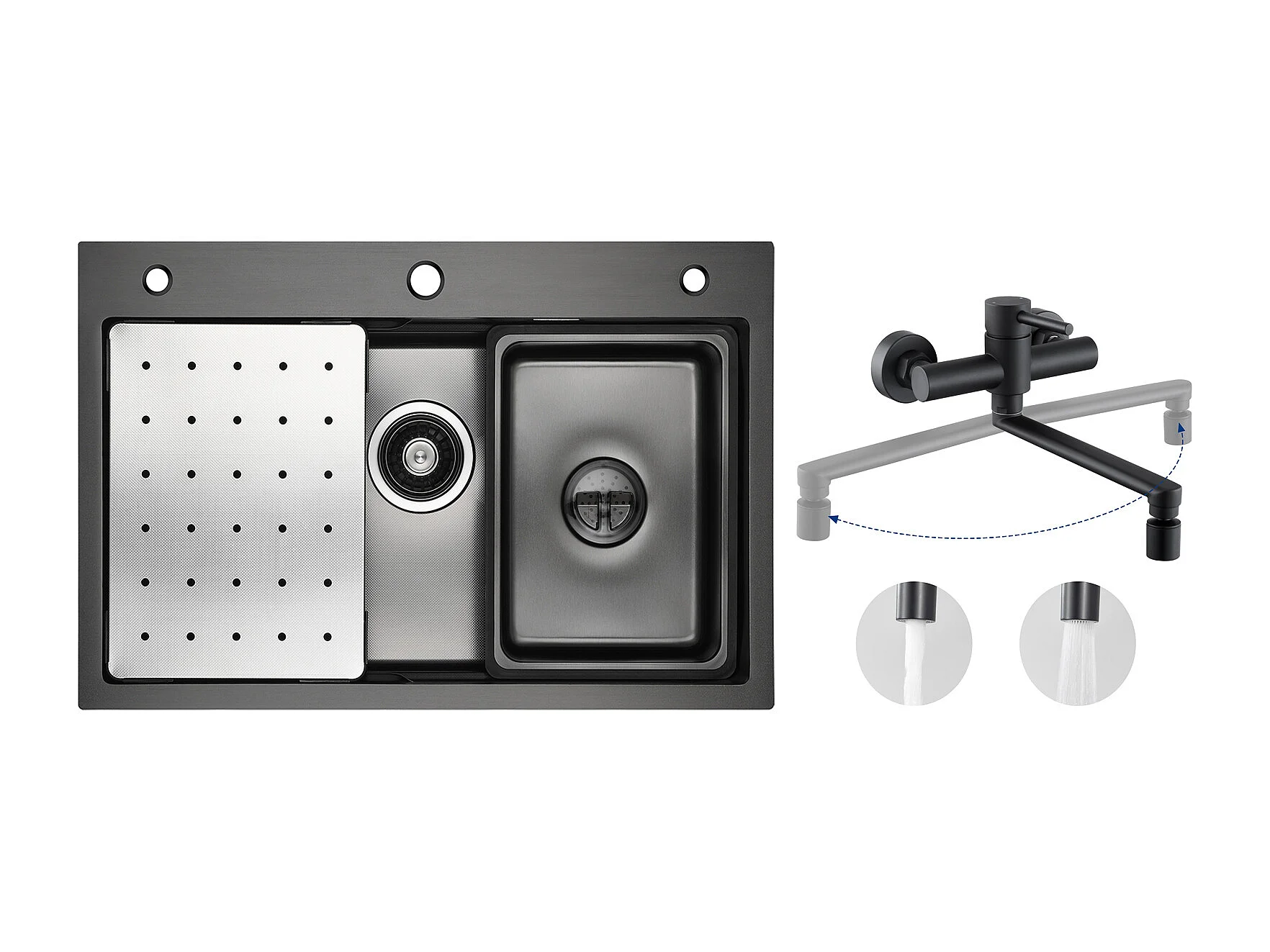 Évier de Cuisine 1 Cuve 70×45×21.5 cm + Egouttoir + Vasque + Distributeur de Savon + Mitigeur de Cuisine Mural avec 2 Jets Noir