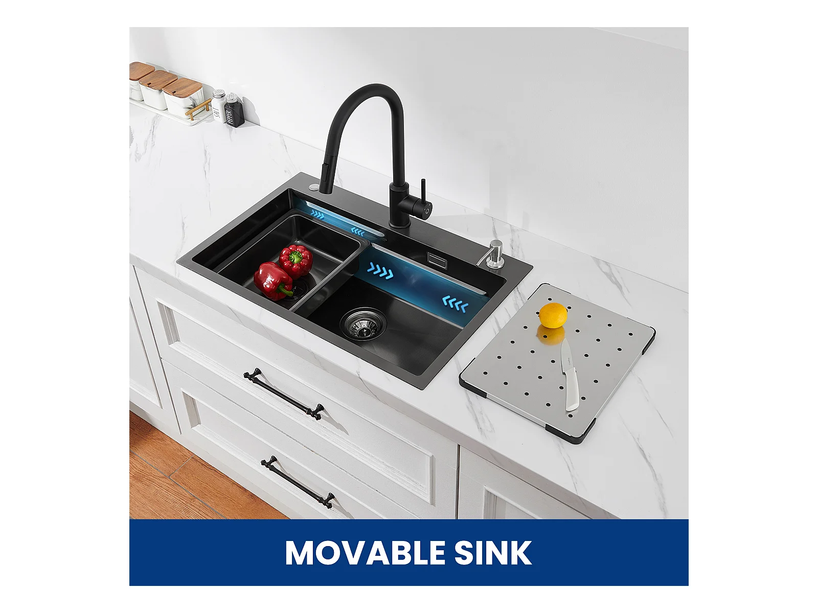 Évier de Cuisine 1 Cuve 70×45cm + Egouttoir + Vasque + Distributeur de Savon + Mitigeur de Cuisine en Inox Noir