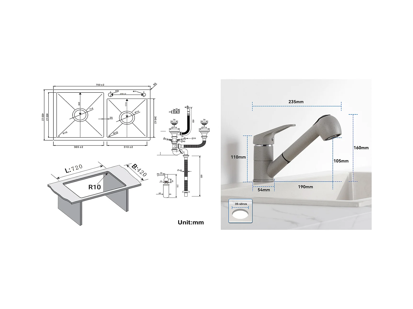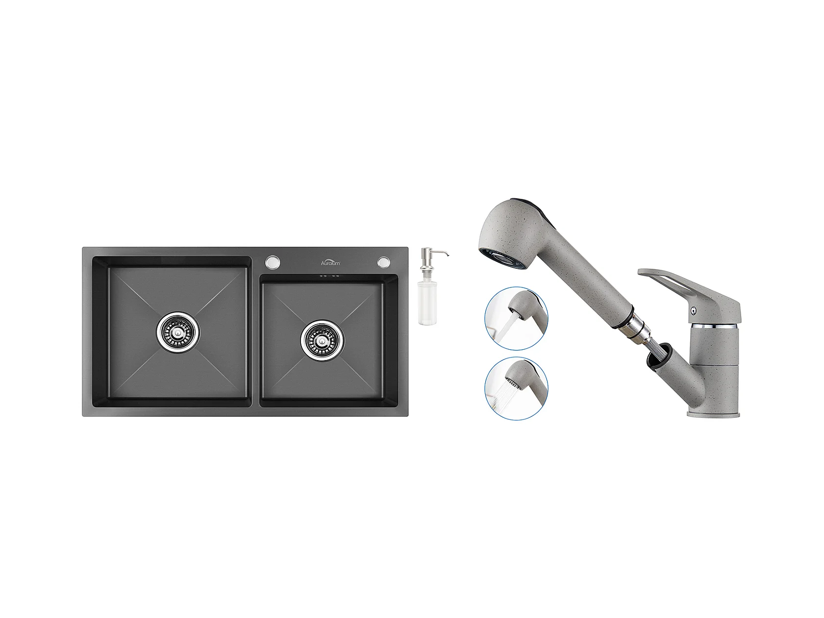 Évier de Cuisine 2 Bac Noir,75x45x19cm, Encastré/ à Poser avec Distributeur de Savon+Robinet Cuisine (Gris) avec Douchette Extractible 2 Jets