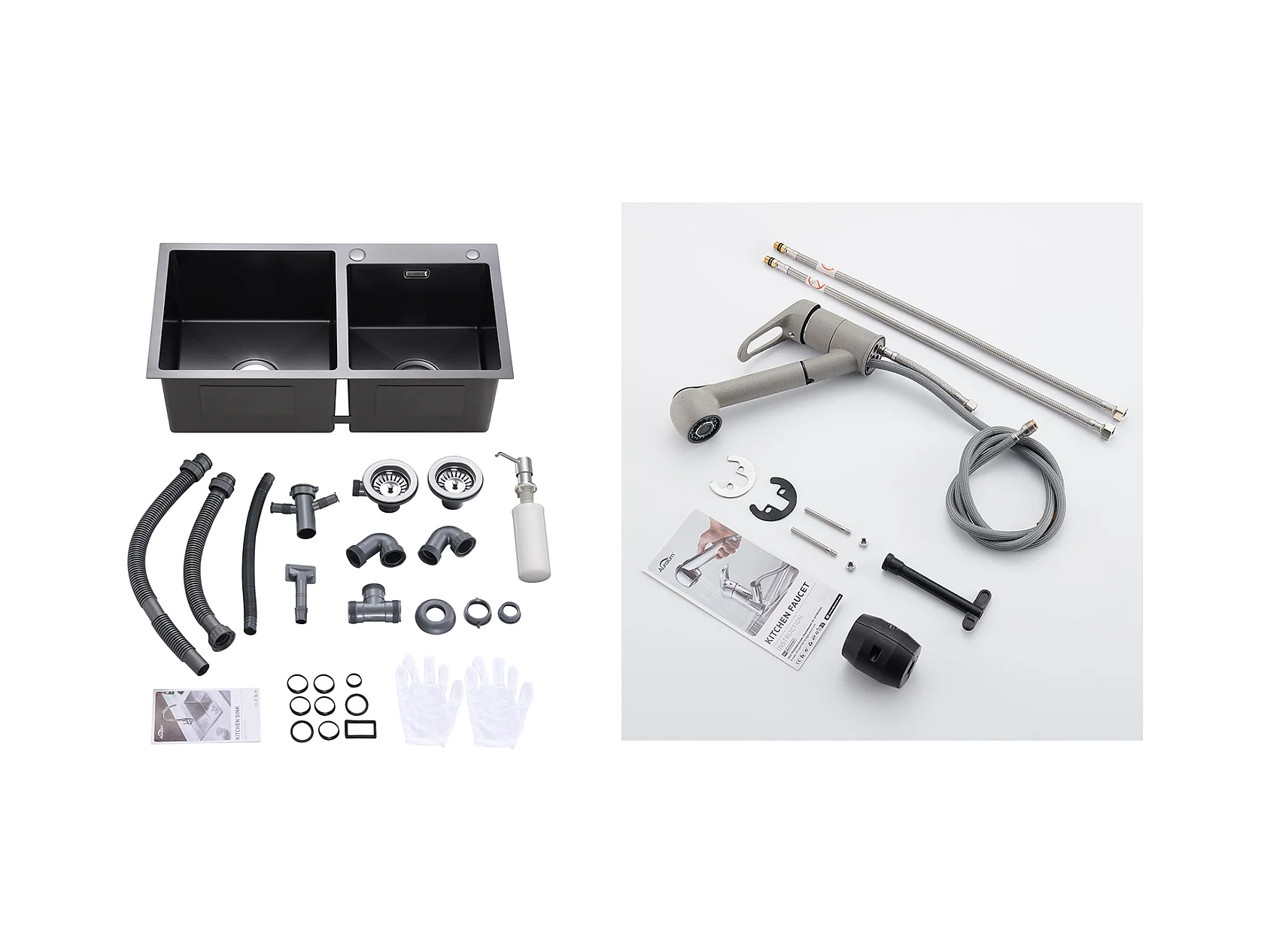 2en1 Évier Cuisine 2 Bacs,Noir,75x45x19cm,Encastré/à Poser avec Distributeur Savon+Robinet Cuisine Flexible Bec Haut Orientable Librement