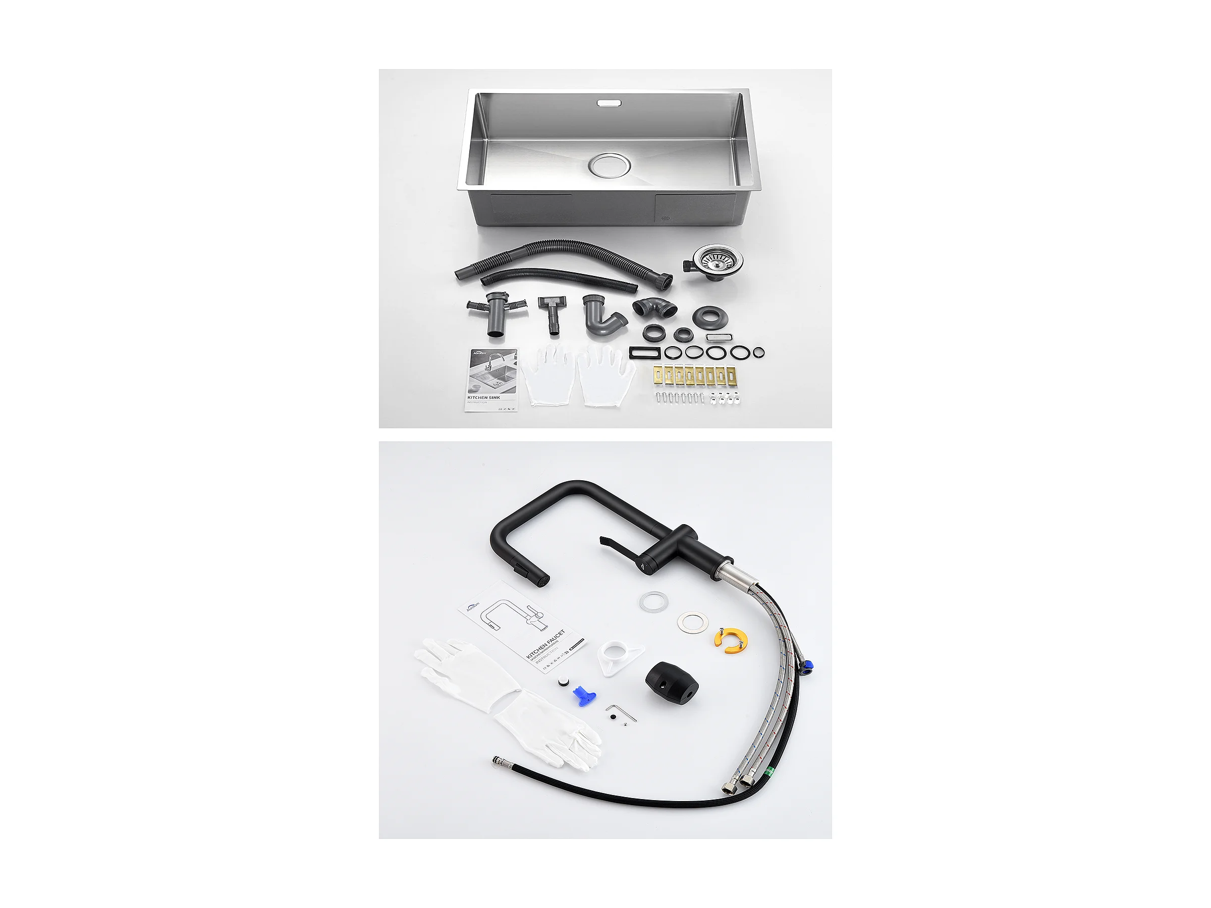 Évier Cuisine 1 Bac 70*44*19CM,à Encastrer/Fleur/Sous-Plan,avec Siphon/Trop-Plein,Brossé+ Robinet de Cuisine Noir avec Douchette Extractible