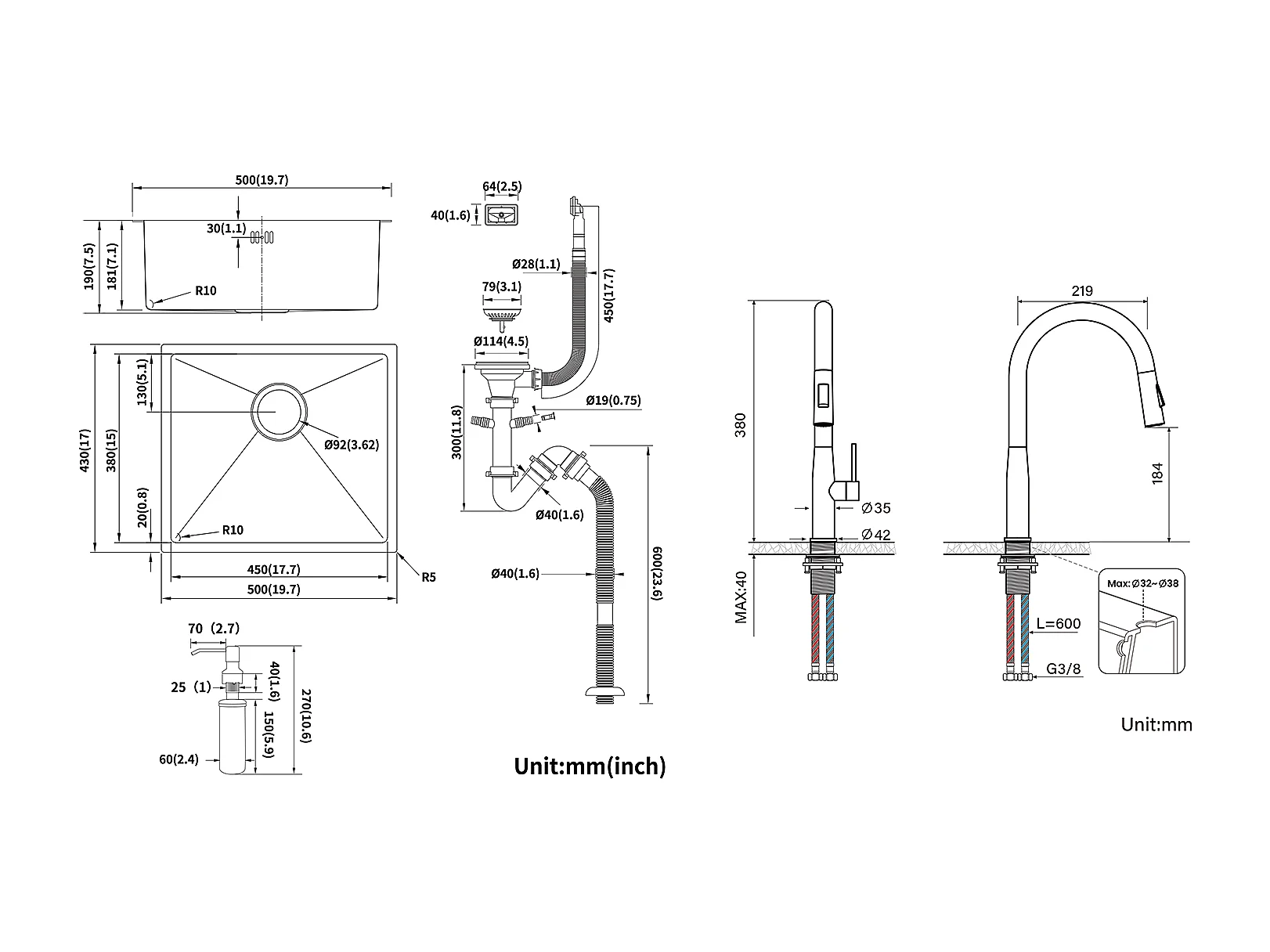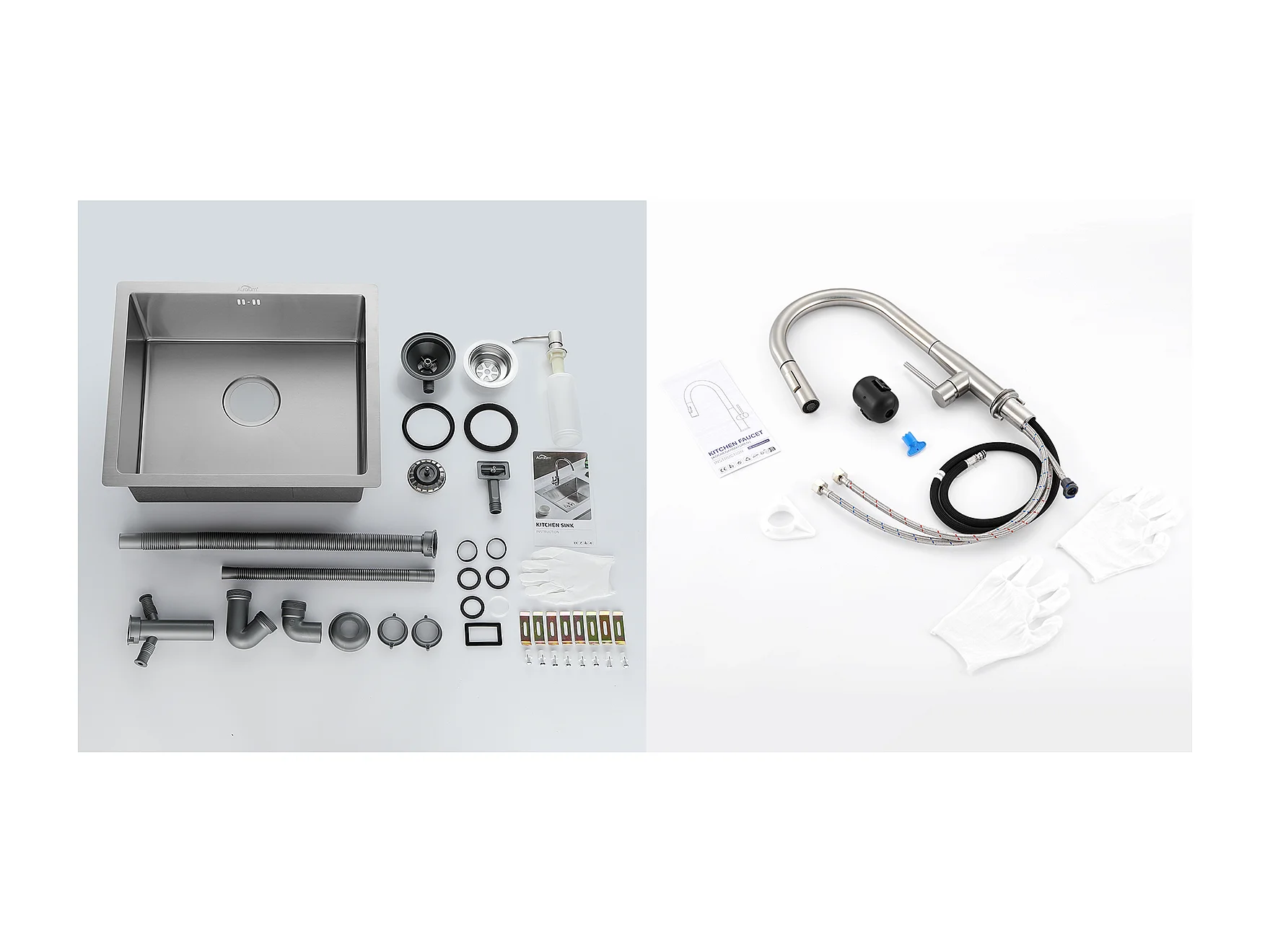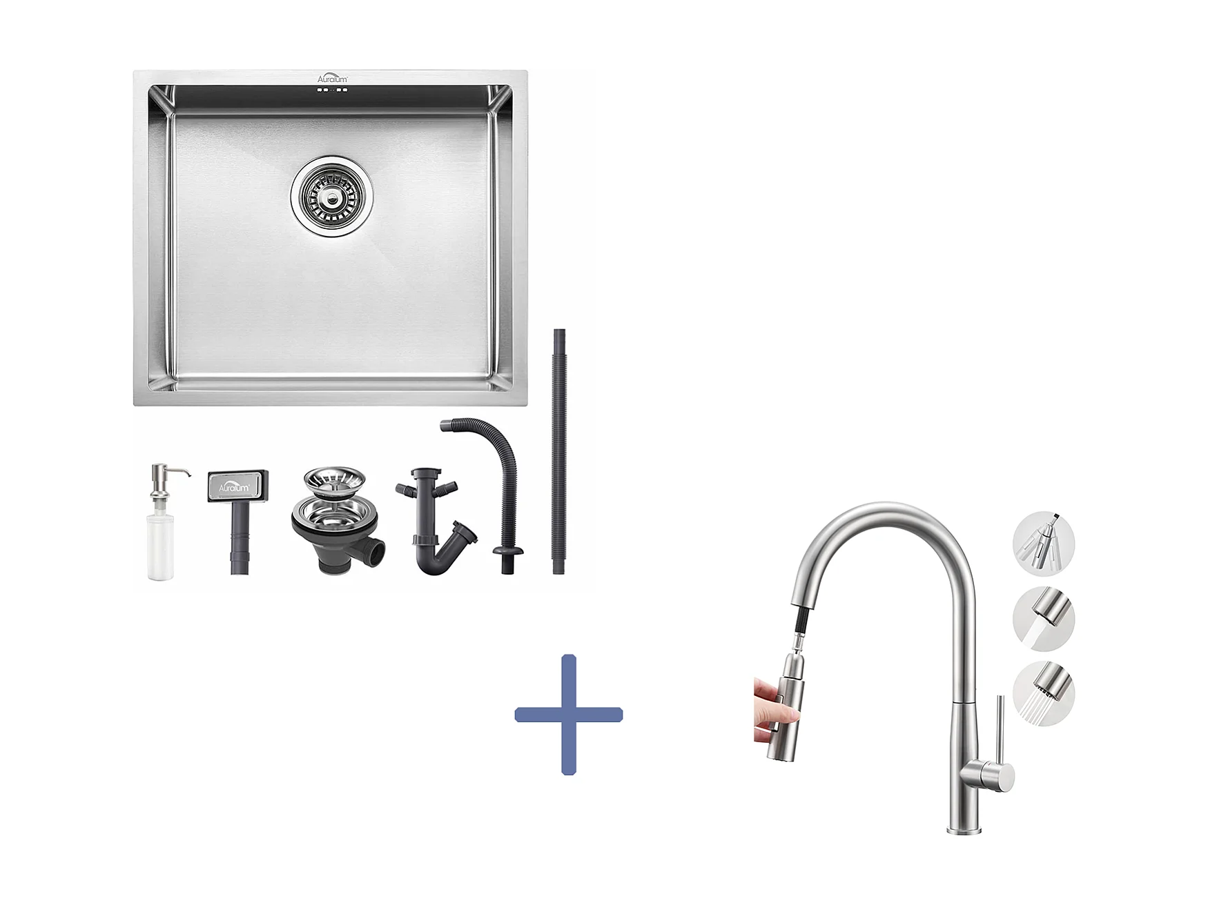 Évier de Cuisine Inox 1 Bac 50*43*18CM avec Distributeur de Savon+Mitigeur Cuisine,avec Douchette Extractible,2 Modes,Eau Froide/Chaude,Brossé