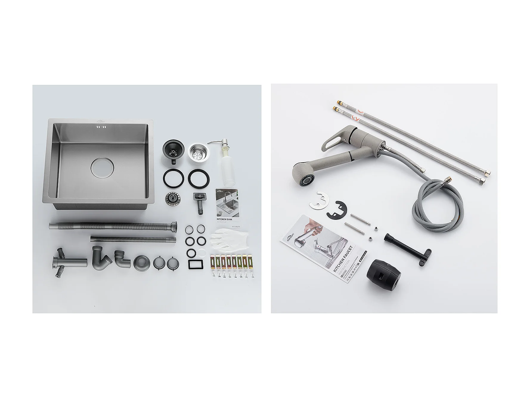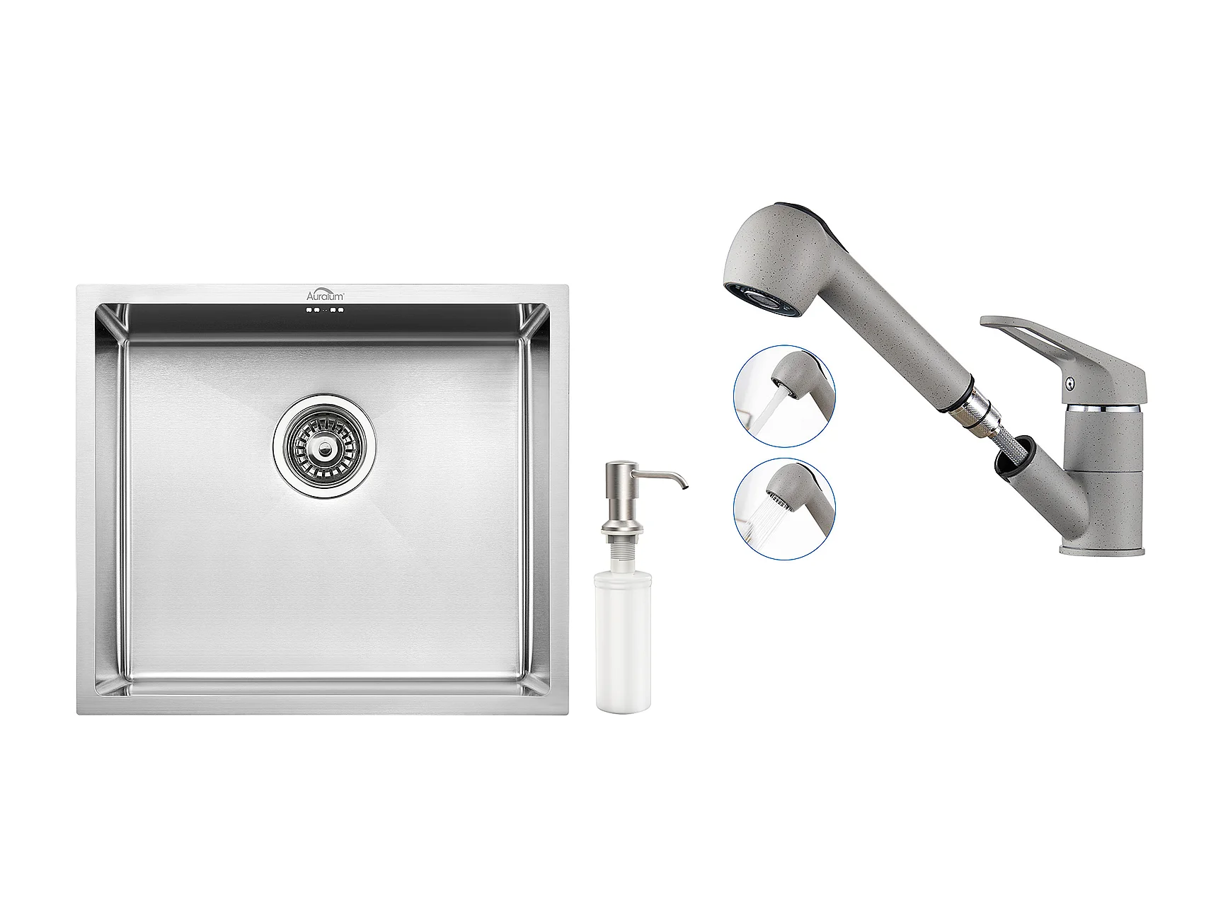 Évier de Cuisine Inox 1 Bac 50*43*18CM avec Distributeur de Savon+Robinet Cuisine avec Douchette Extractible 2 Jets,Eau Froide/ Chaude,Gris