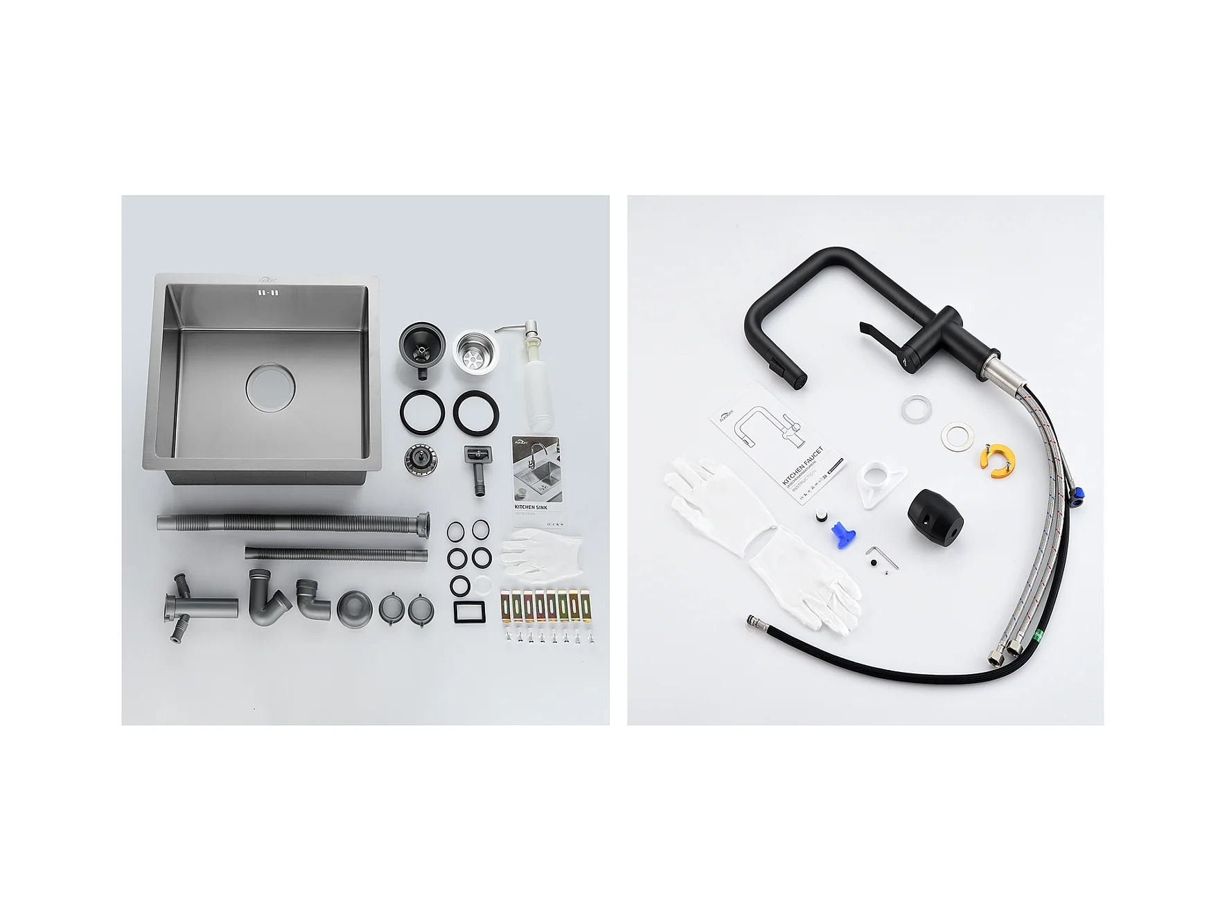 Évier de Cuisine Inox 1 Bac 50*43*18CM avec Distributeur de Savon+ Robinet de Cuisine avec Douchette Extractible, Noir+Chrome