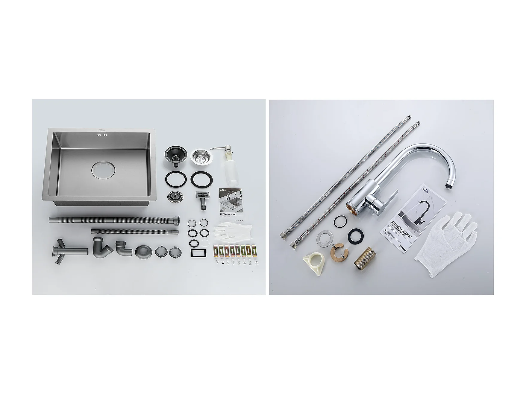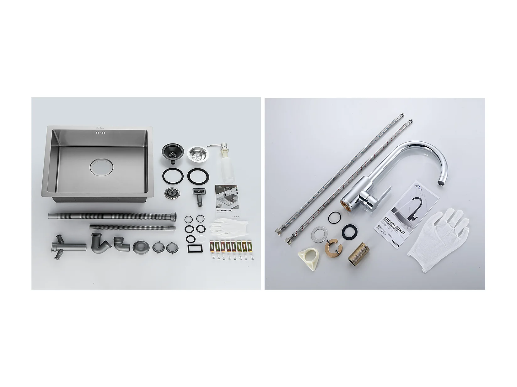 Évier de Cuisine Inox 1 Bac 50*43*18CM avec Distributeur de Savon+ Robinet de Cuisine Chromé Pivotant à 360° Eau Froide /Chaude