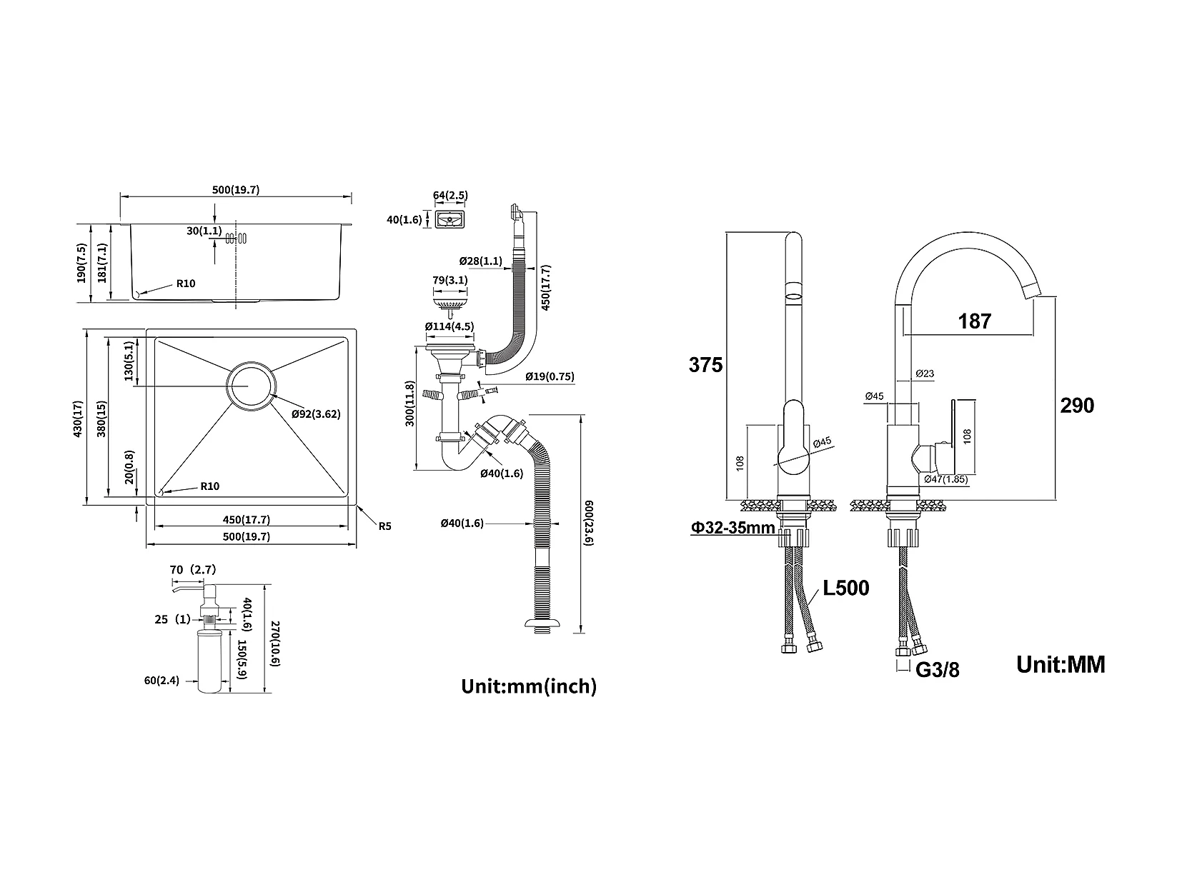 Évier de Cuisine Inox 1 Bac 50*43*18CM avec Distributeur de Savon+Mitigeur Cuisine,avec Douchette Extractible,2 Modes,Eau Froide/Chaude,Brossé