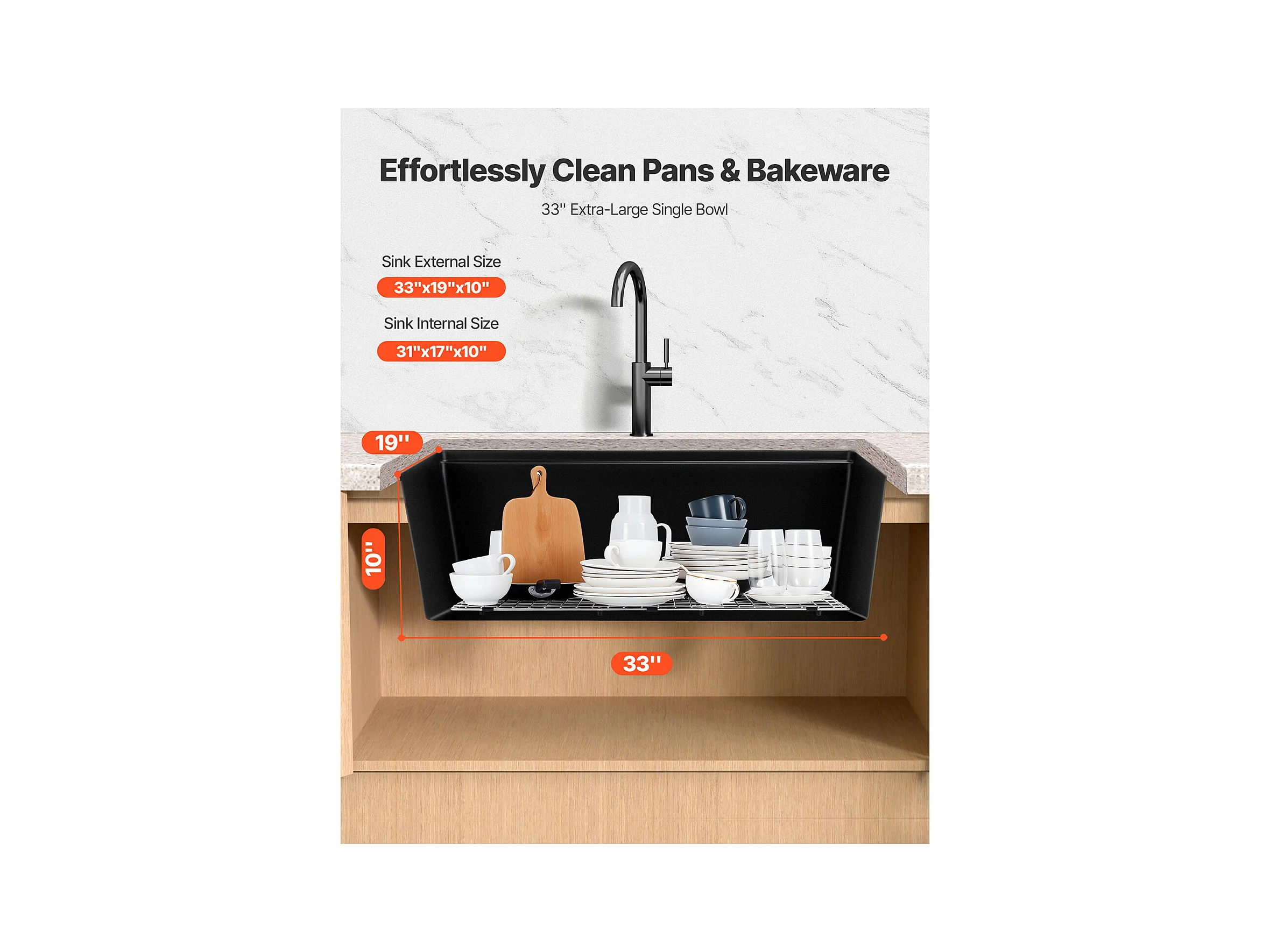 Évier de Cuisine SucceBuy Moderne en Granit de 83,8 cm, Évier à Poser à Large Cuve Simple, Bac à Laver Encastrable avec Accessoires Multiples