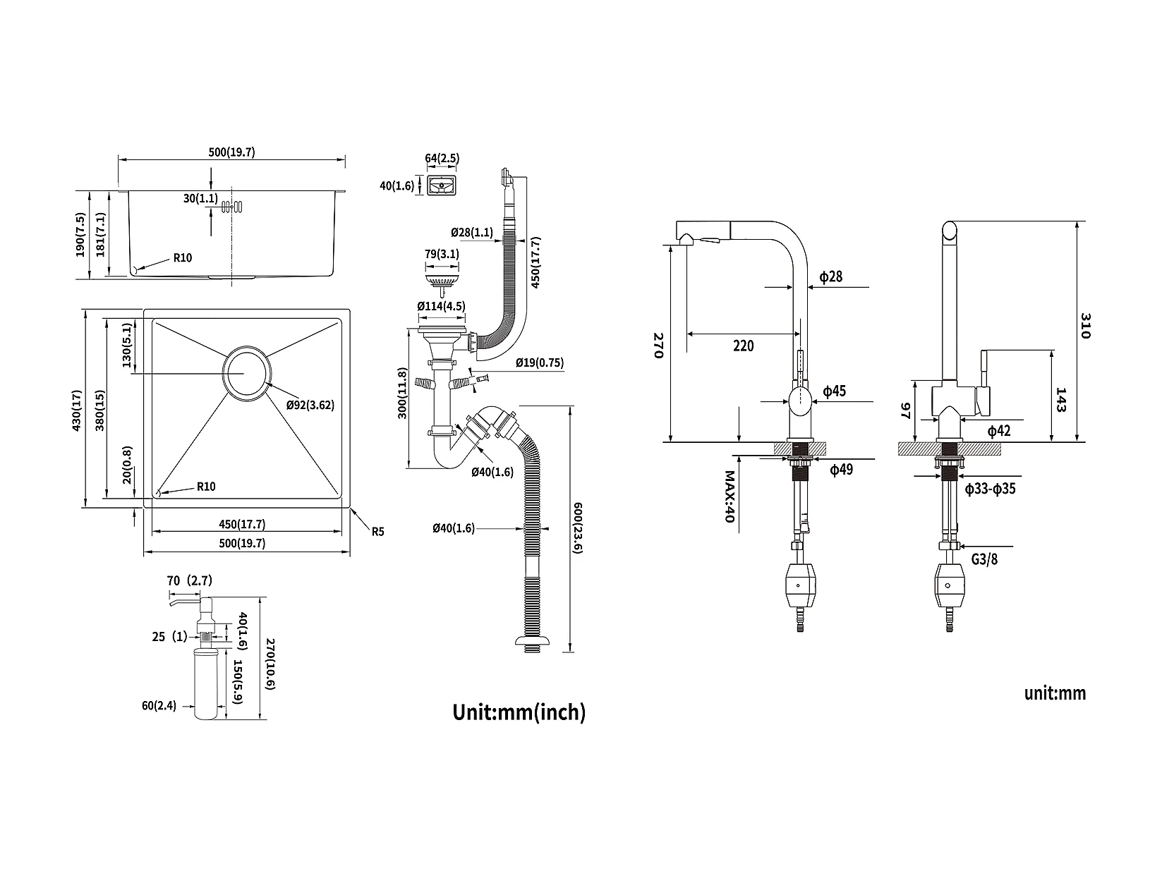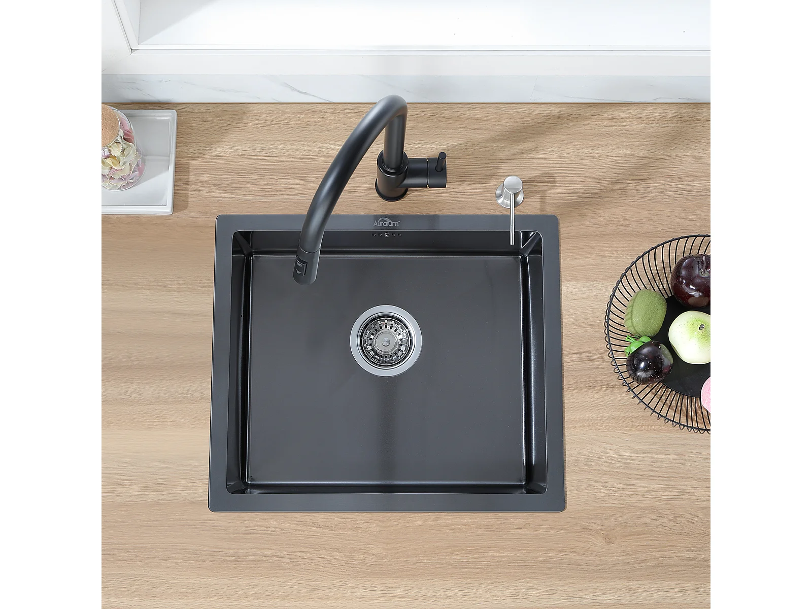 AuraLum Max Évier 1 Bac 50x43x18,5CM Évier Inoxydable sous plan Évier Cuisine Noir avec Distrubuteur de savon et Ensemble de drainage,EU Modèle