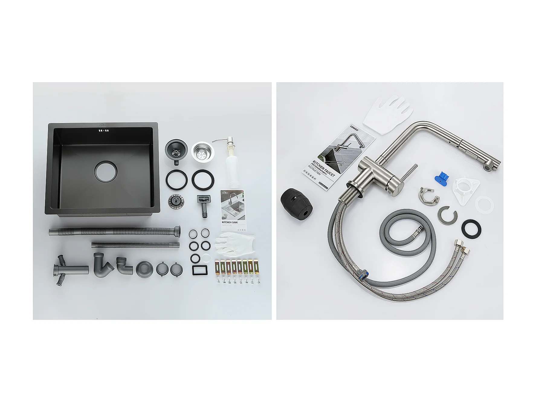 Évier Noir 1Bac 50x43x18,5CM,Acier Inoxydable,avec Distrubuteur de savon+Robinet de Cuisine à Ressort avec Douchette Extensibl