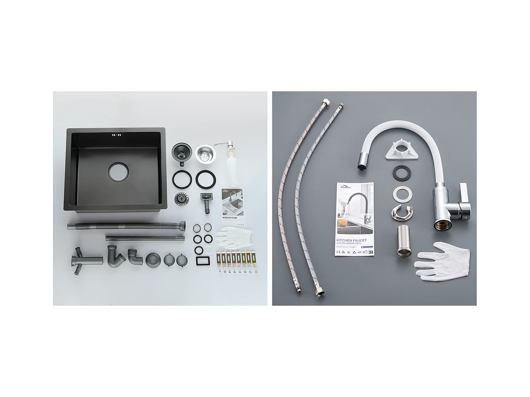 Évier Noir 1 Bac 50x43x18,5CM,Acier Inoxydable, avec Distrubuteur de savon+Robinet de Cuisine Flexible Bec Haut Orientable Librement,Blanc