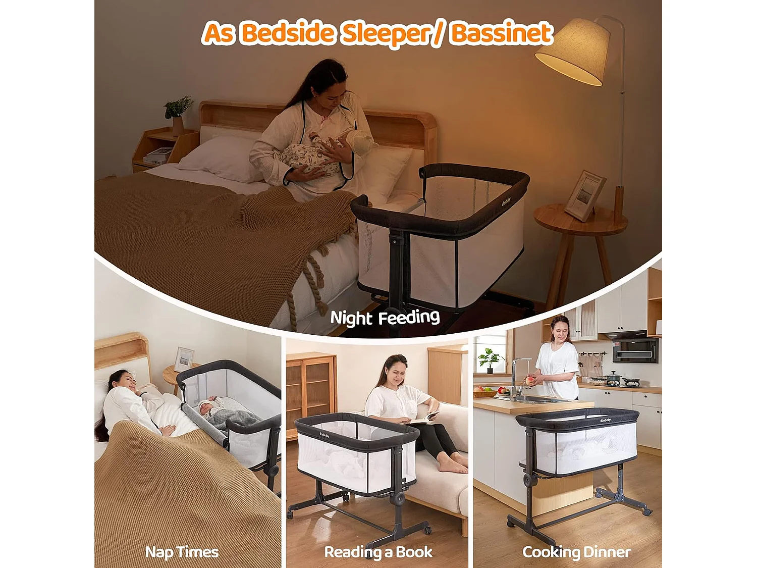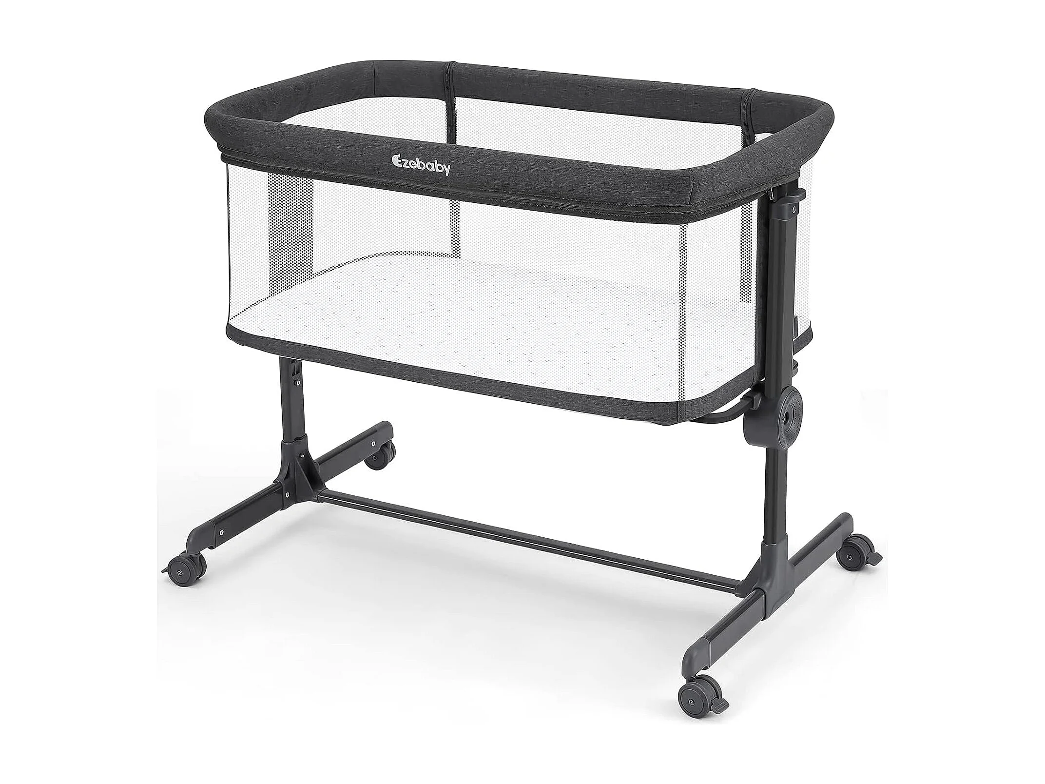 Ezebaby Lit Bébé Cododo 2 en 1,Lit Parapluie à 9 kg,Hauteur Réglable 7 Niveaux,Berceau Bébé avec Matelas,Côté Repliable,Maille Respirante - Gris Foncé