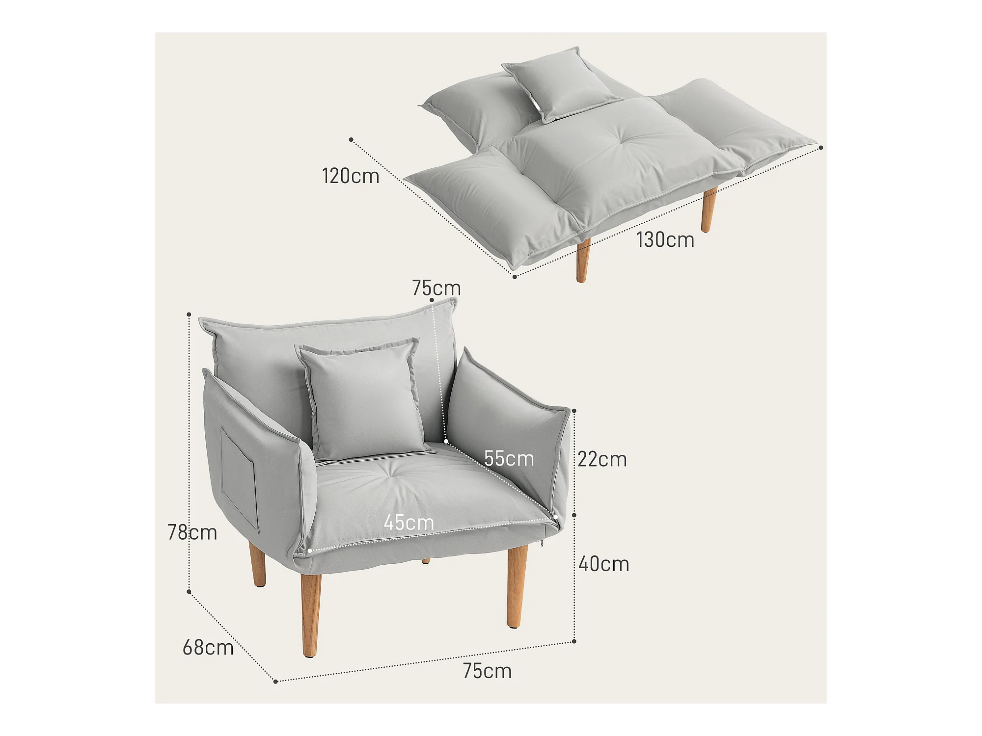 Fauteuil convertible en lit, 2 poches de rangement, cadre métallique, polyester, gris (70x76x77 cm)