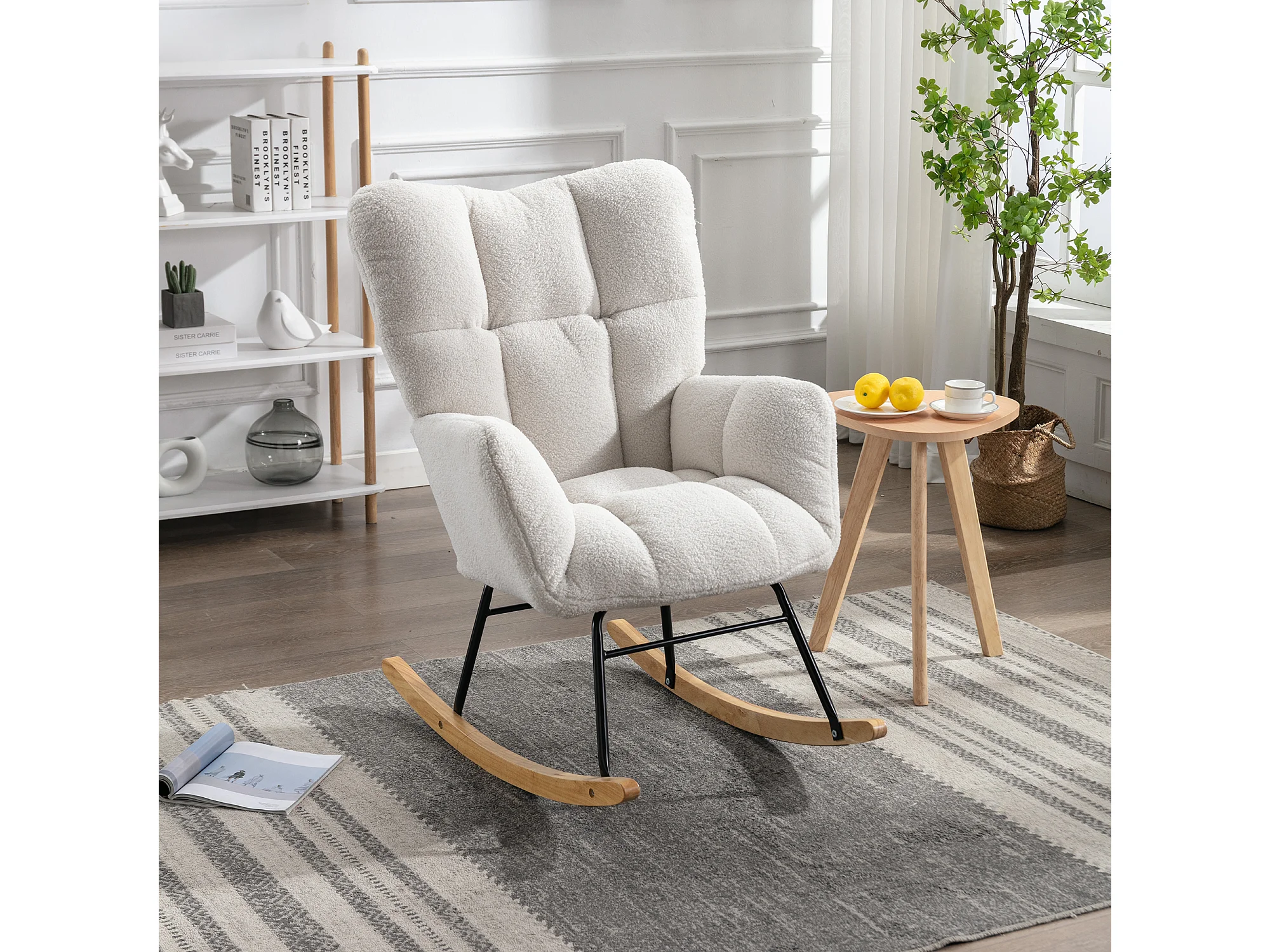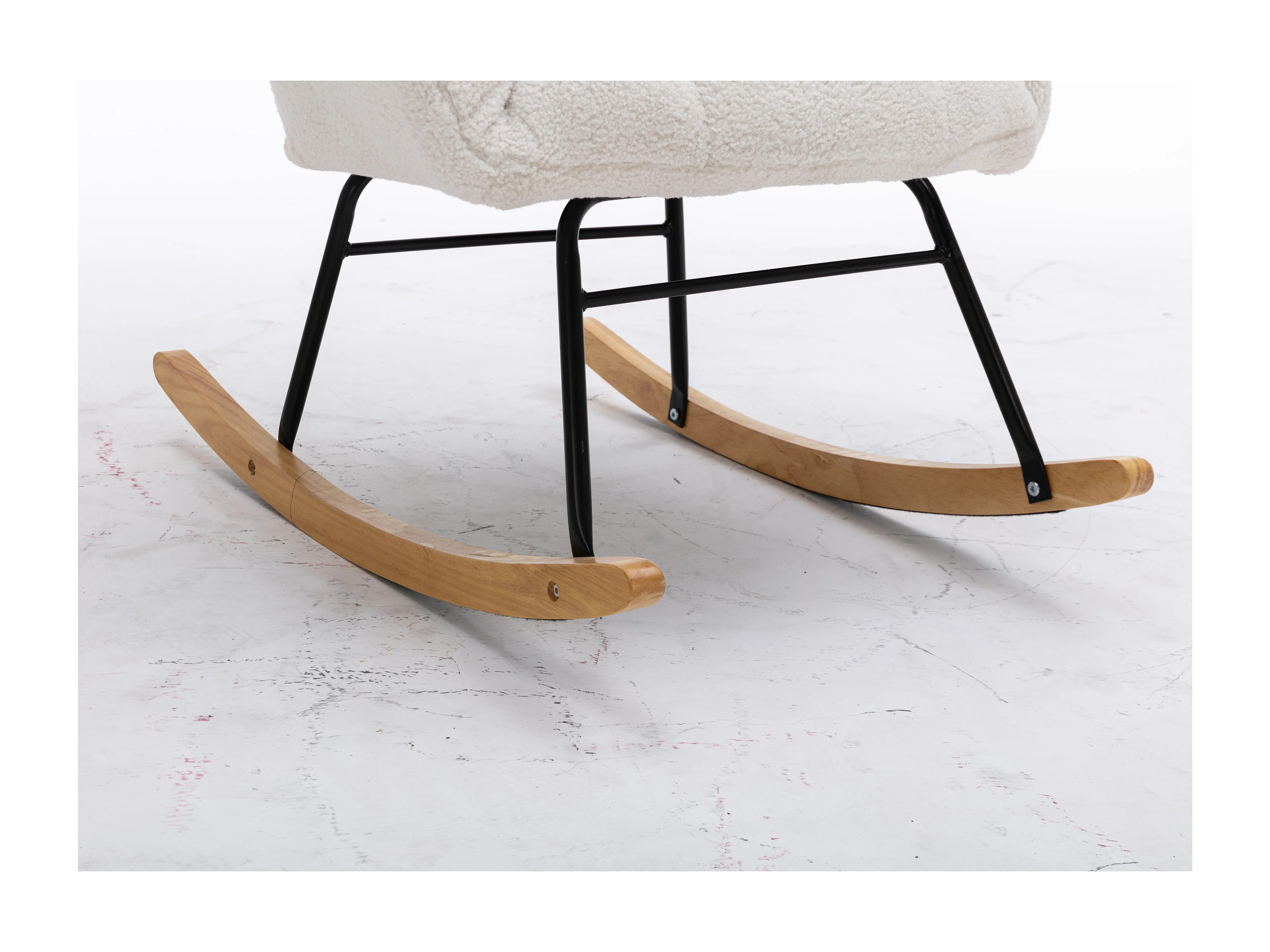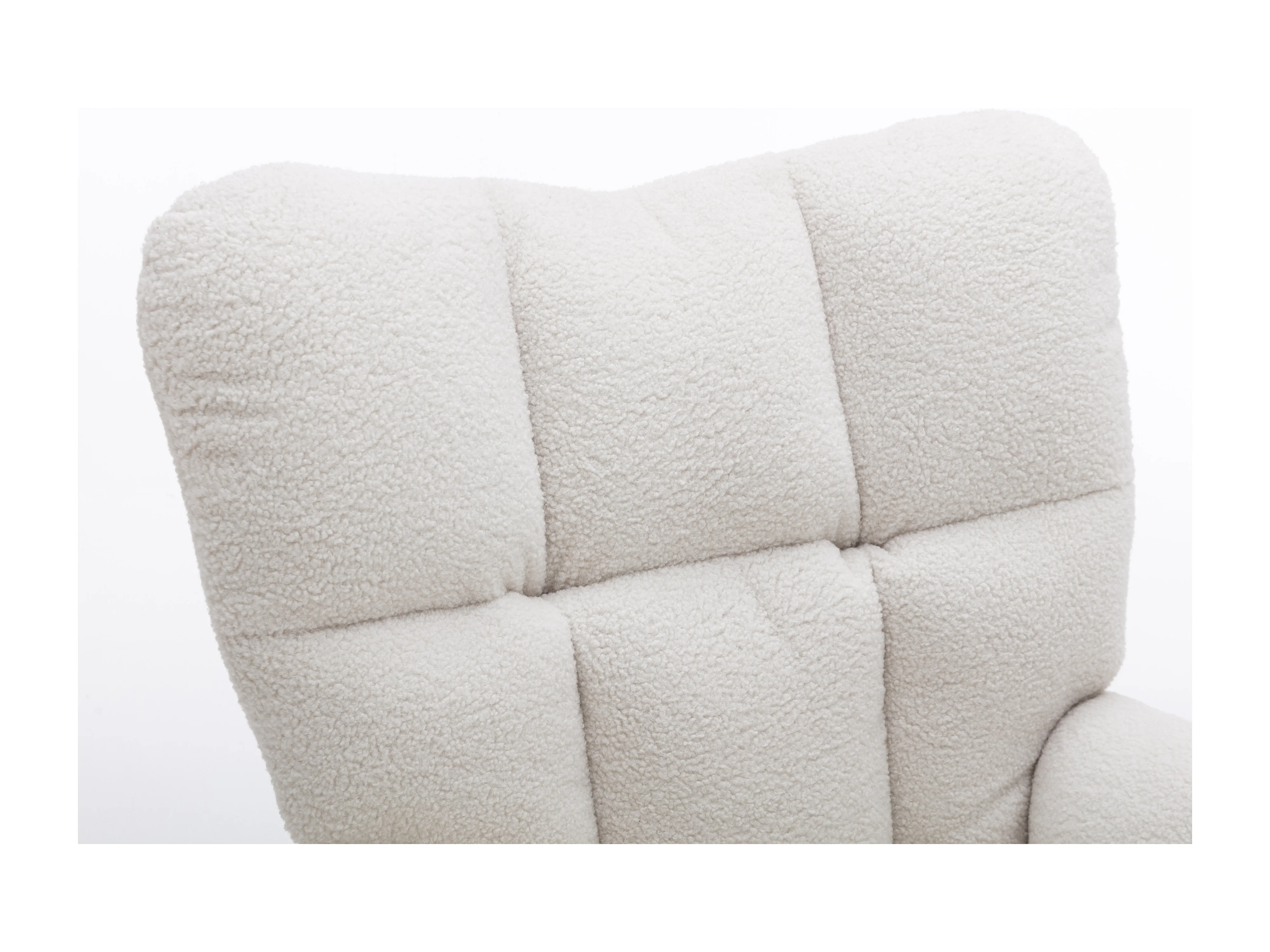 Fauteuil à bascule 80x70x95 cm, dossier haut capitonné, accoudoirs rembourrés, tissu teddy blanc