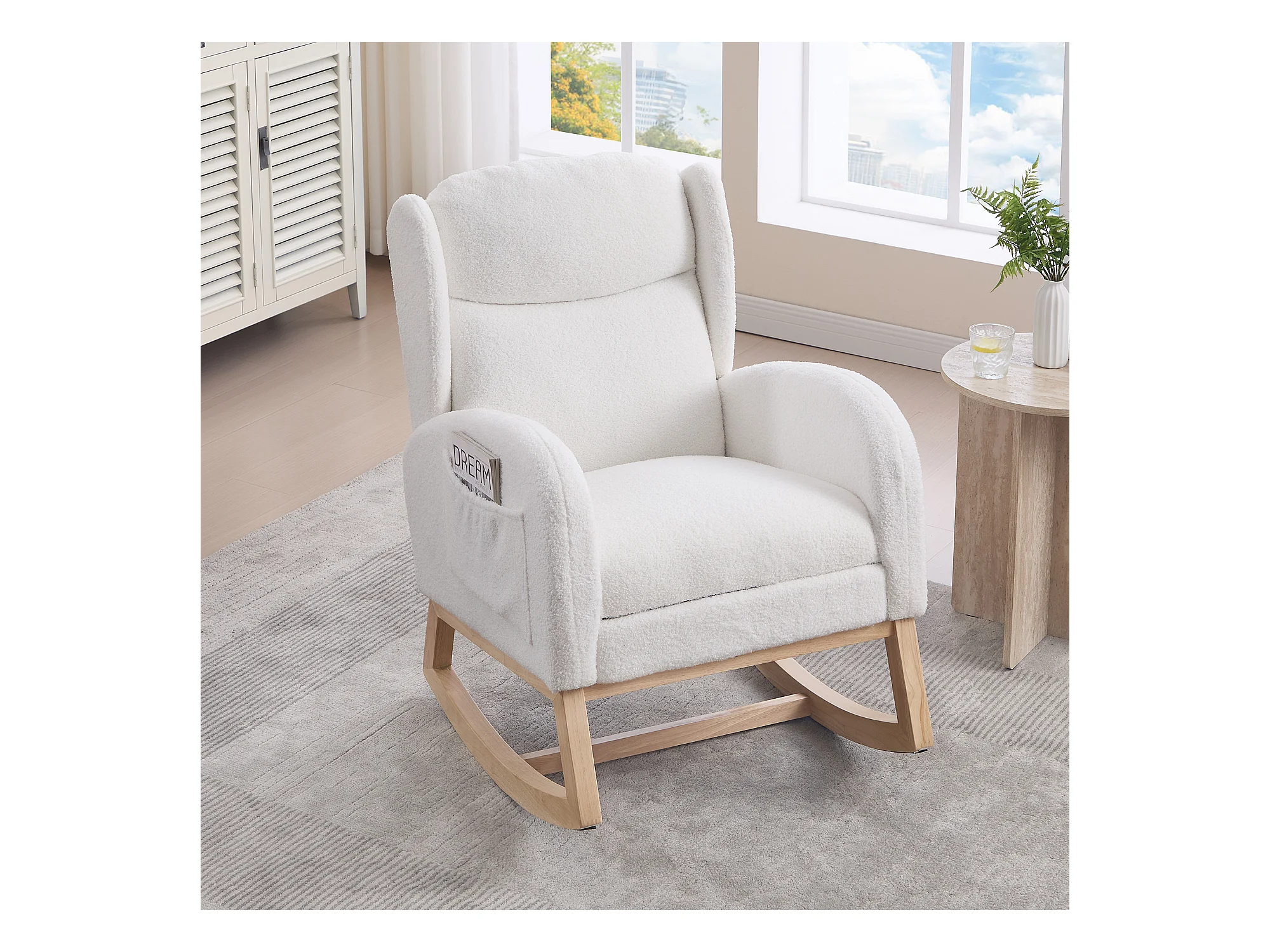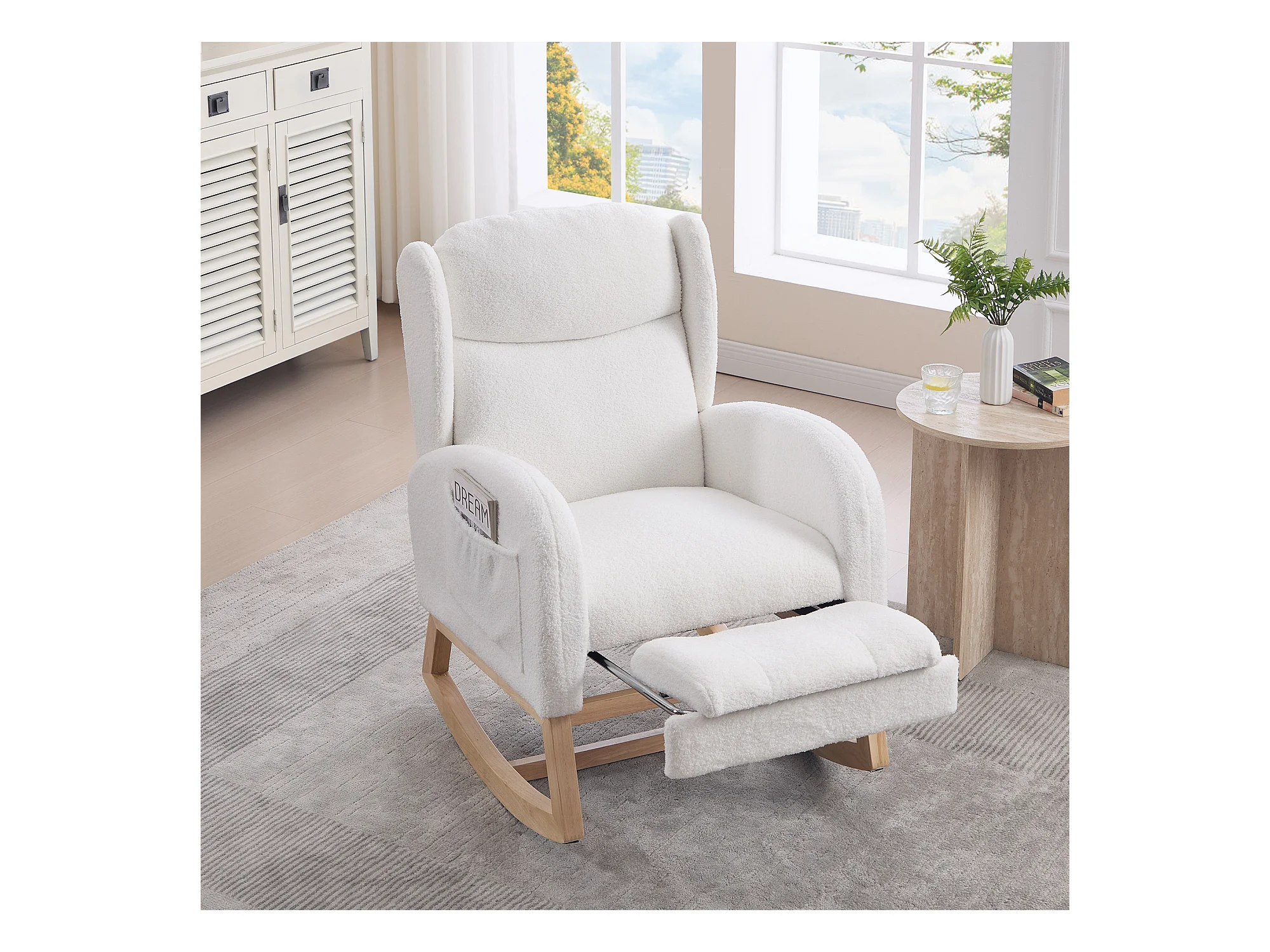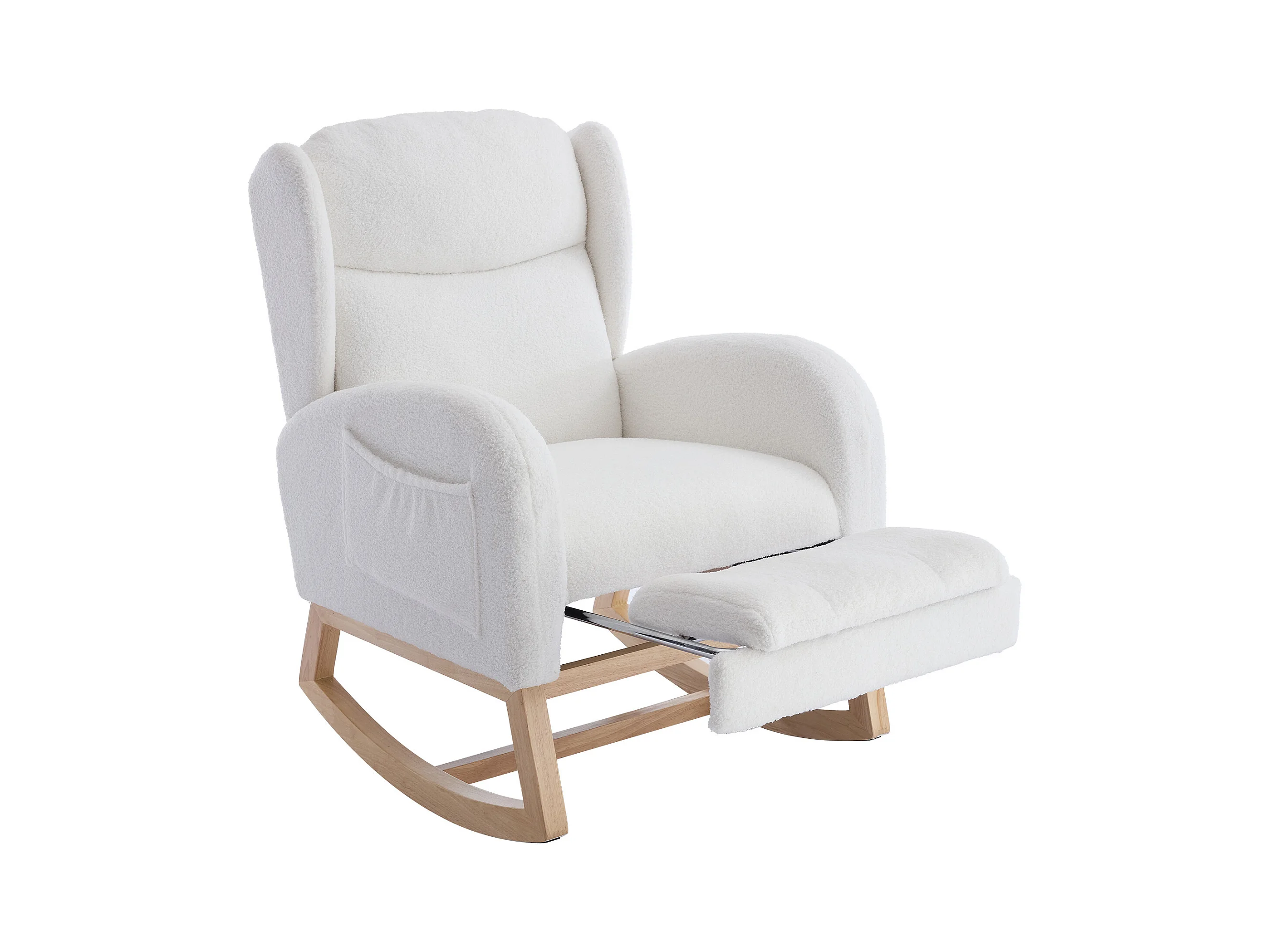 Fauteuil à bascule avec repose-pieds réglable et poches - tissu peluche blanc