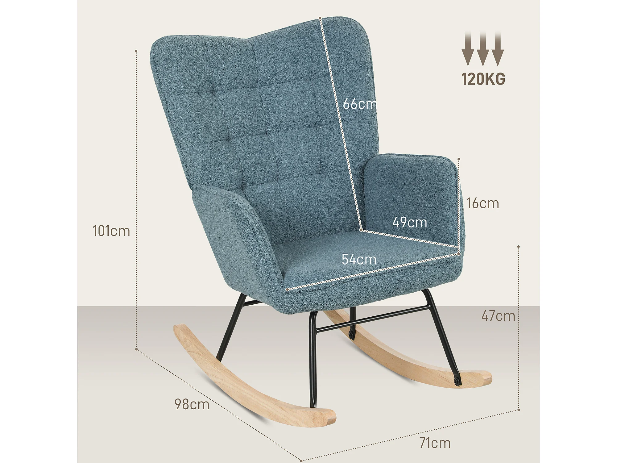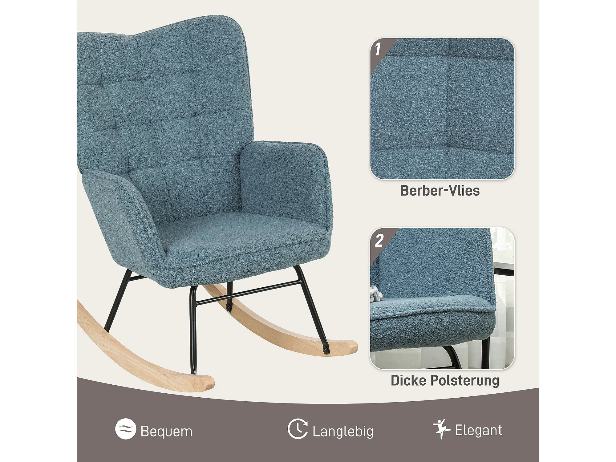 Fauteuil à bascule avec revêtement en laine berbère, accoudoirs, bois massif, bleu clair (98x71x101cm)