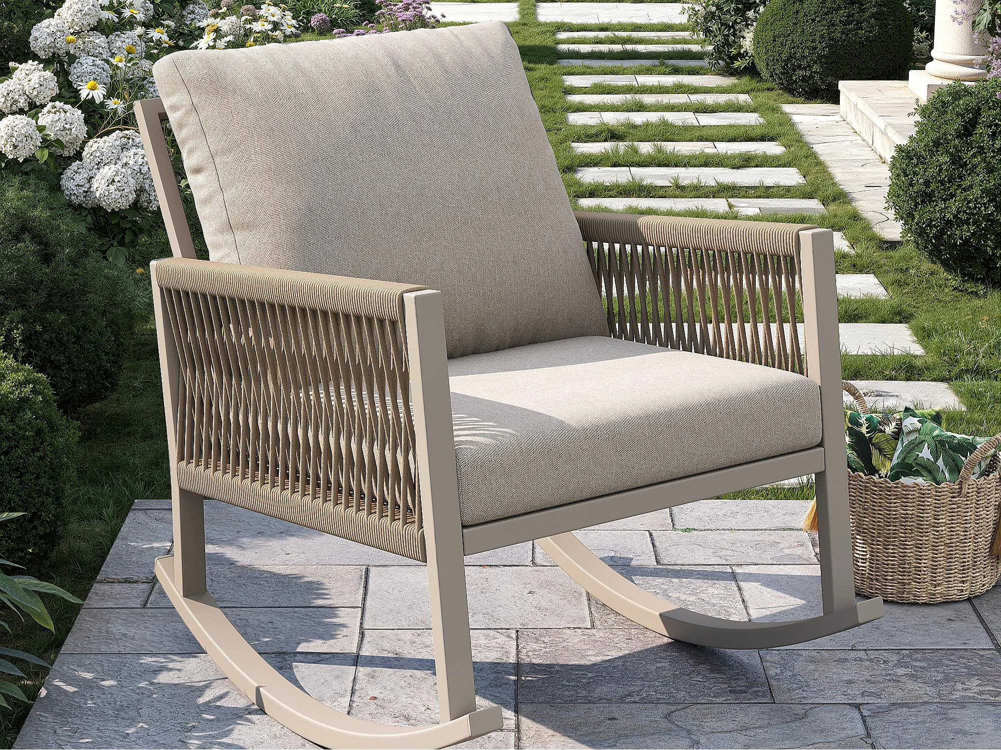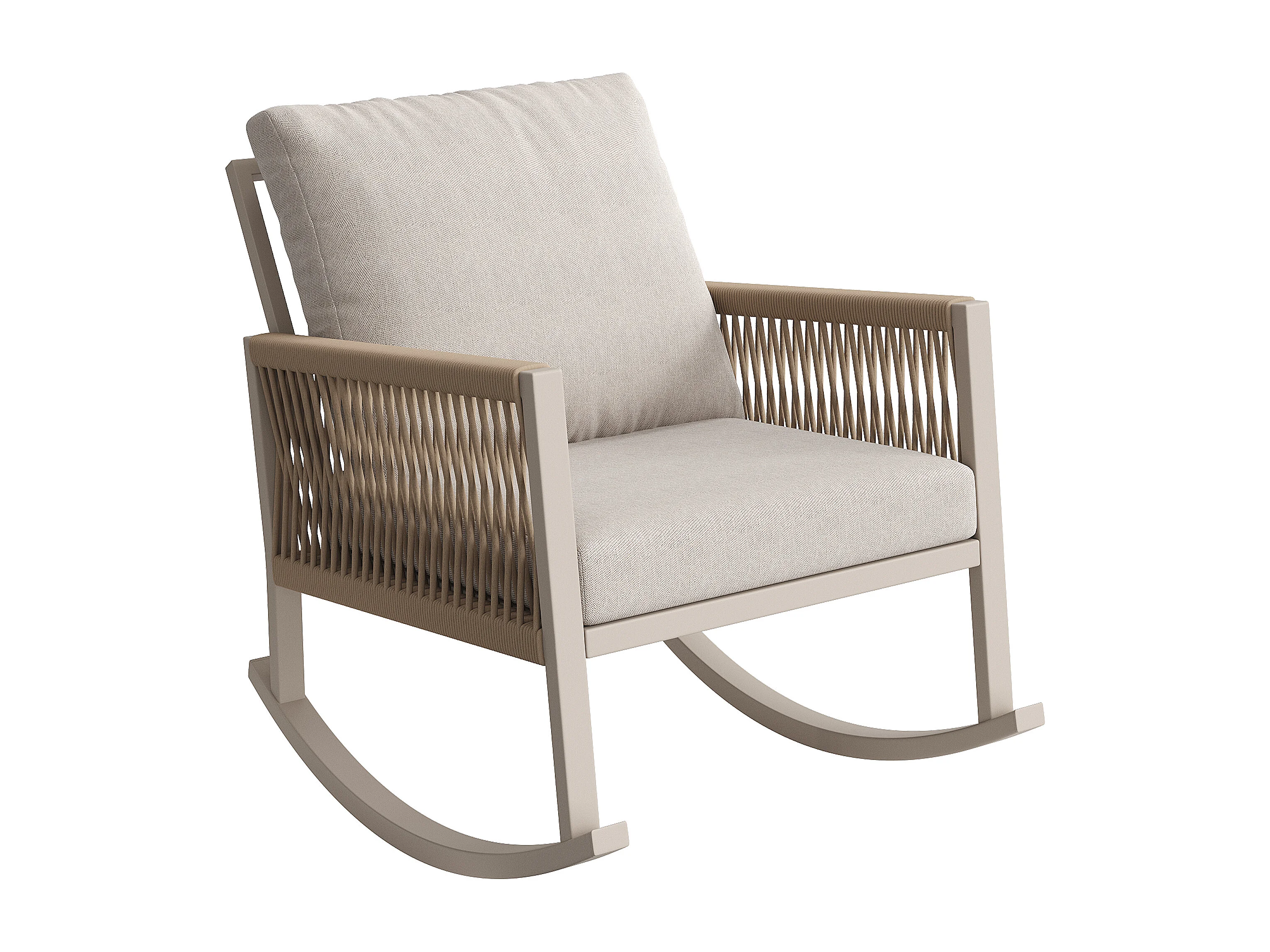 Fauteuil à Bascule de Jardin avec Accoudoirs en Corde Tressée Croisée - Rocking Chair d'Extérieur Design Moderne - Structure Métal - Beige