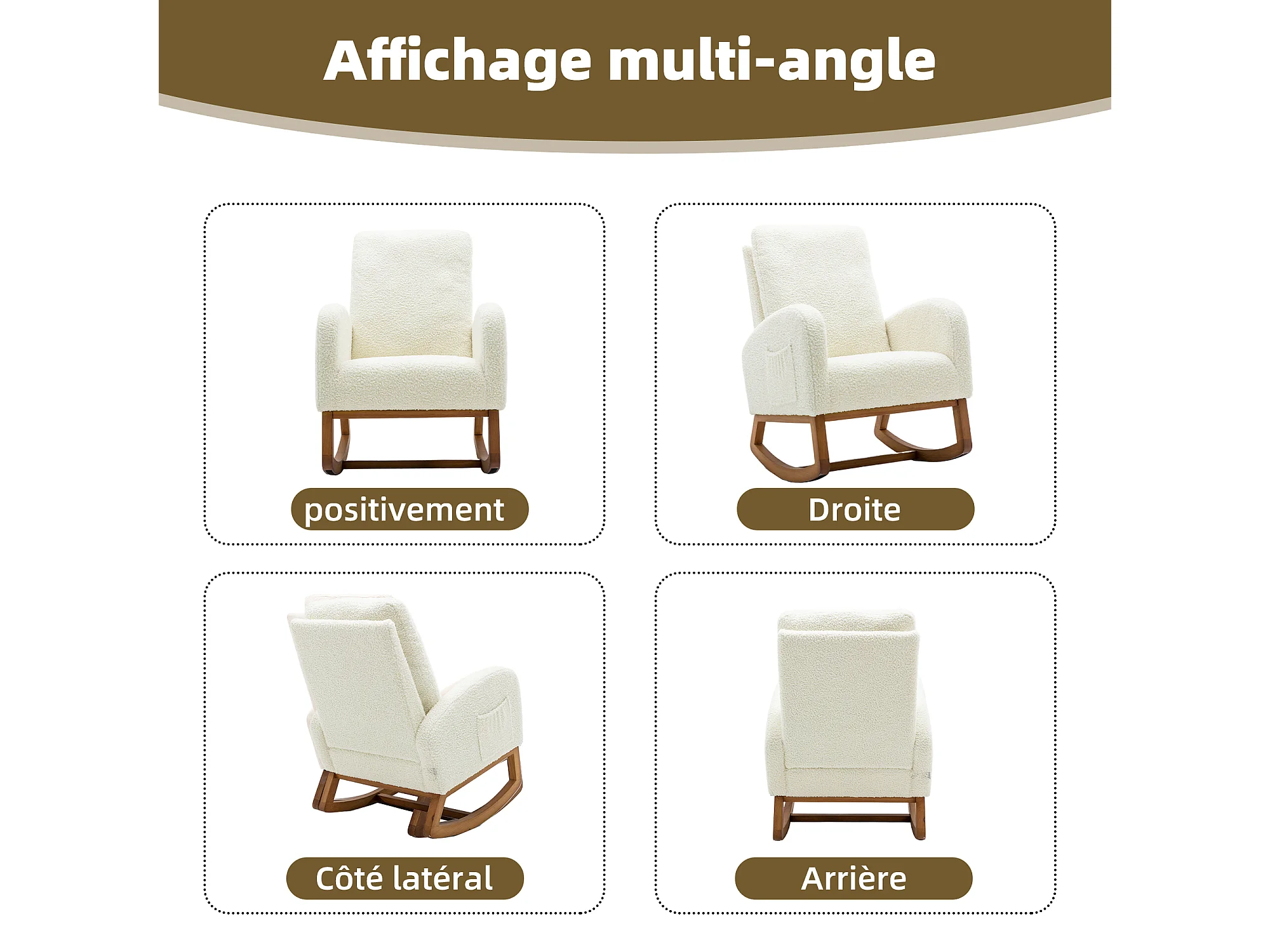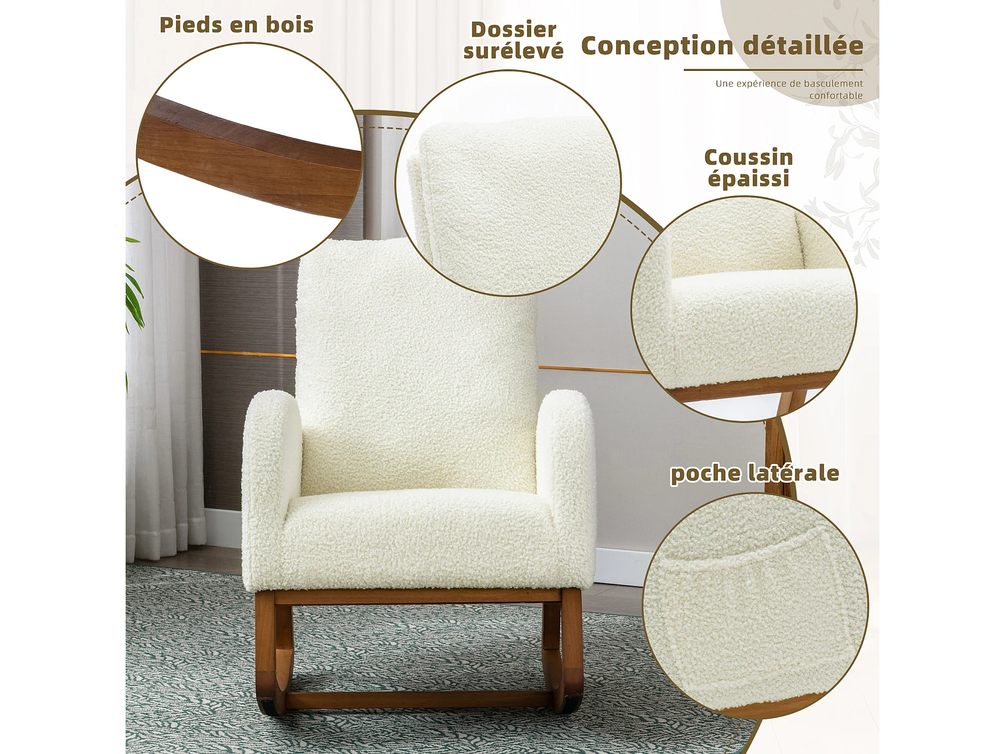 Fauteuil à bascule blanche en fausse fourrure - forme carrée - poches latérales pratiques - idéale pour le confort