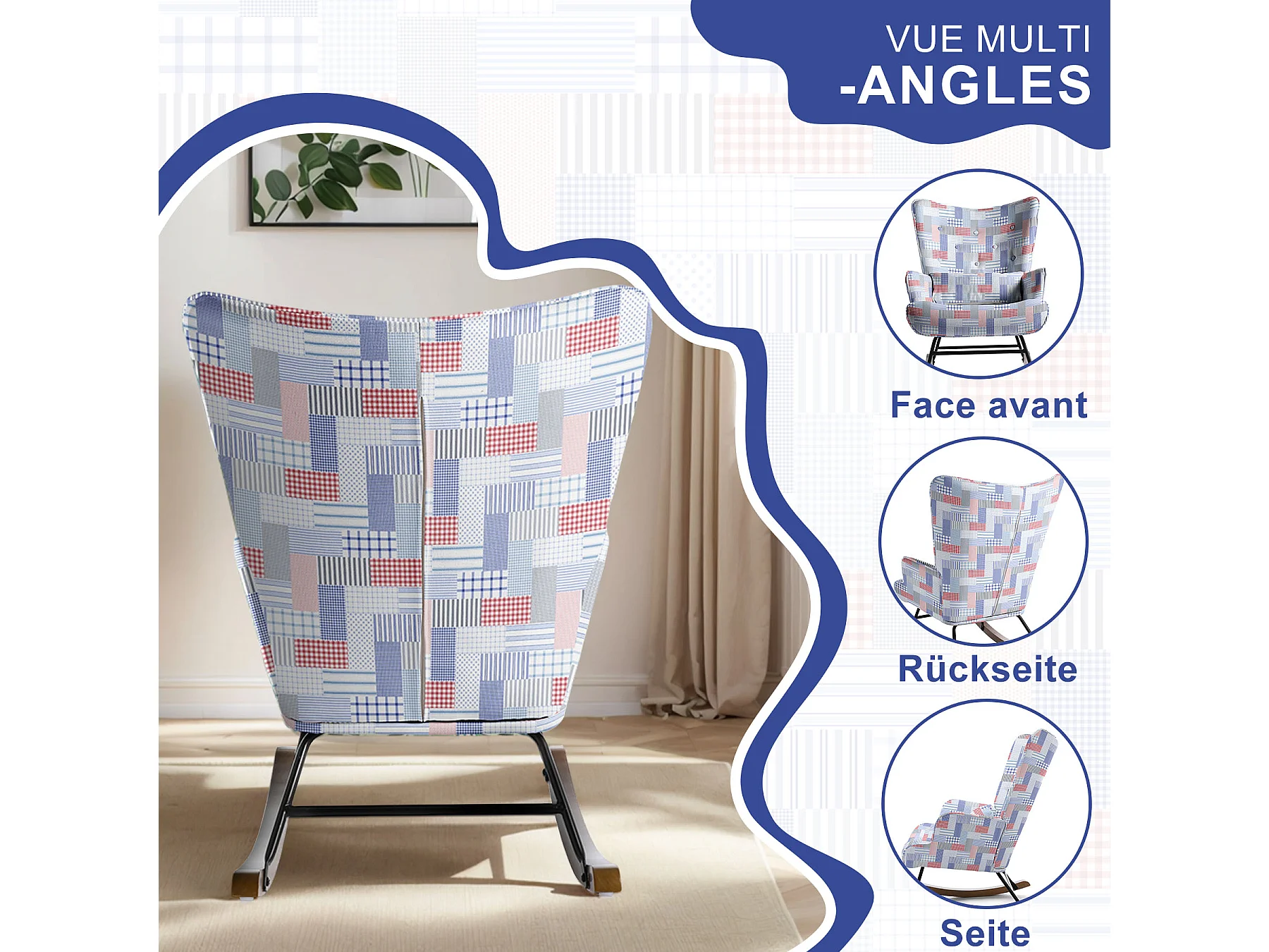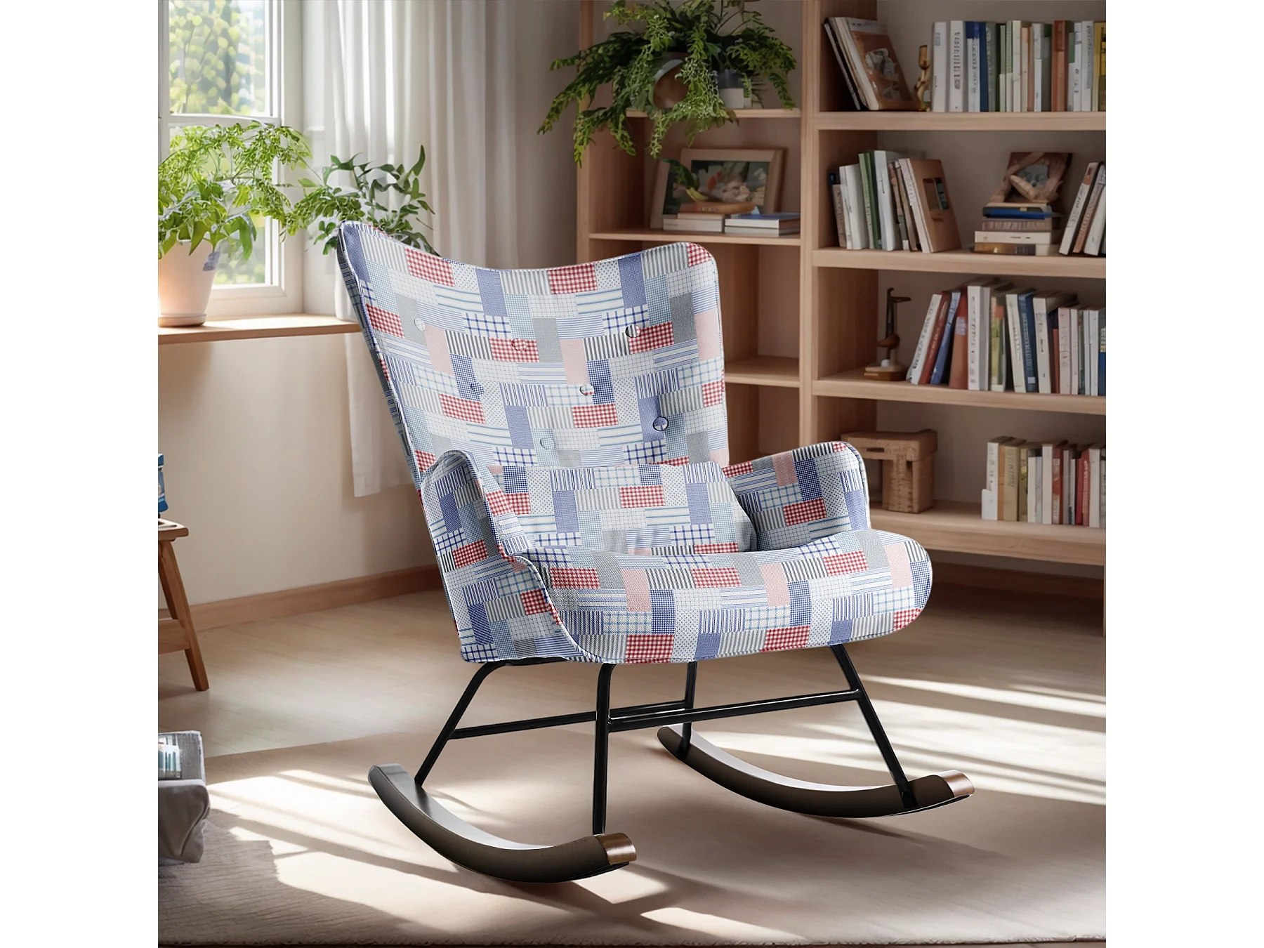 Fauteuil à bascule en patchwork pour le salon en velours avec cadre en métal et base en bois, imprimé en tissu imitation lin avec motifs à carreaux et rayures