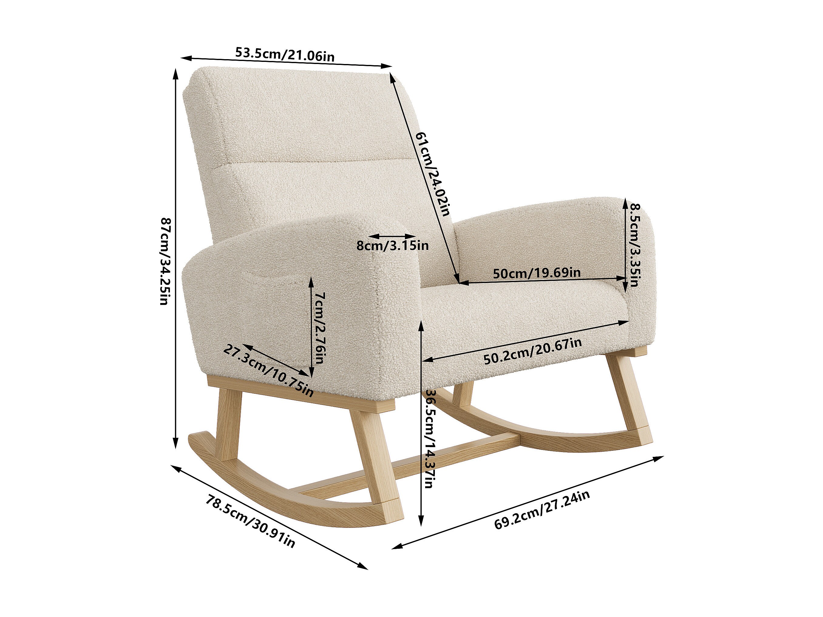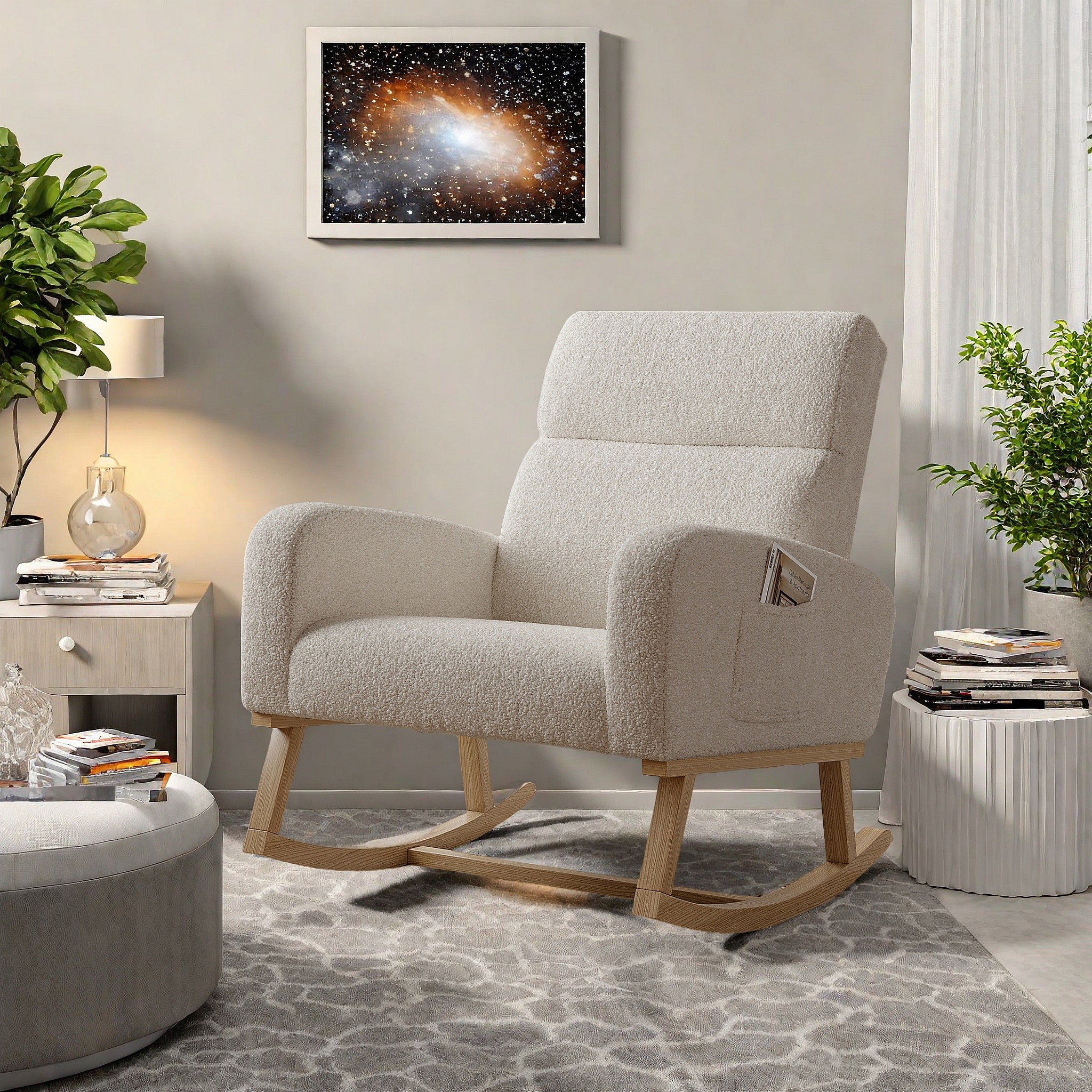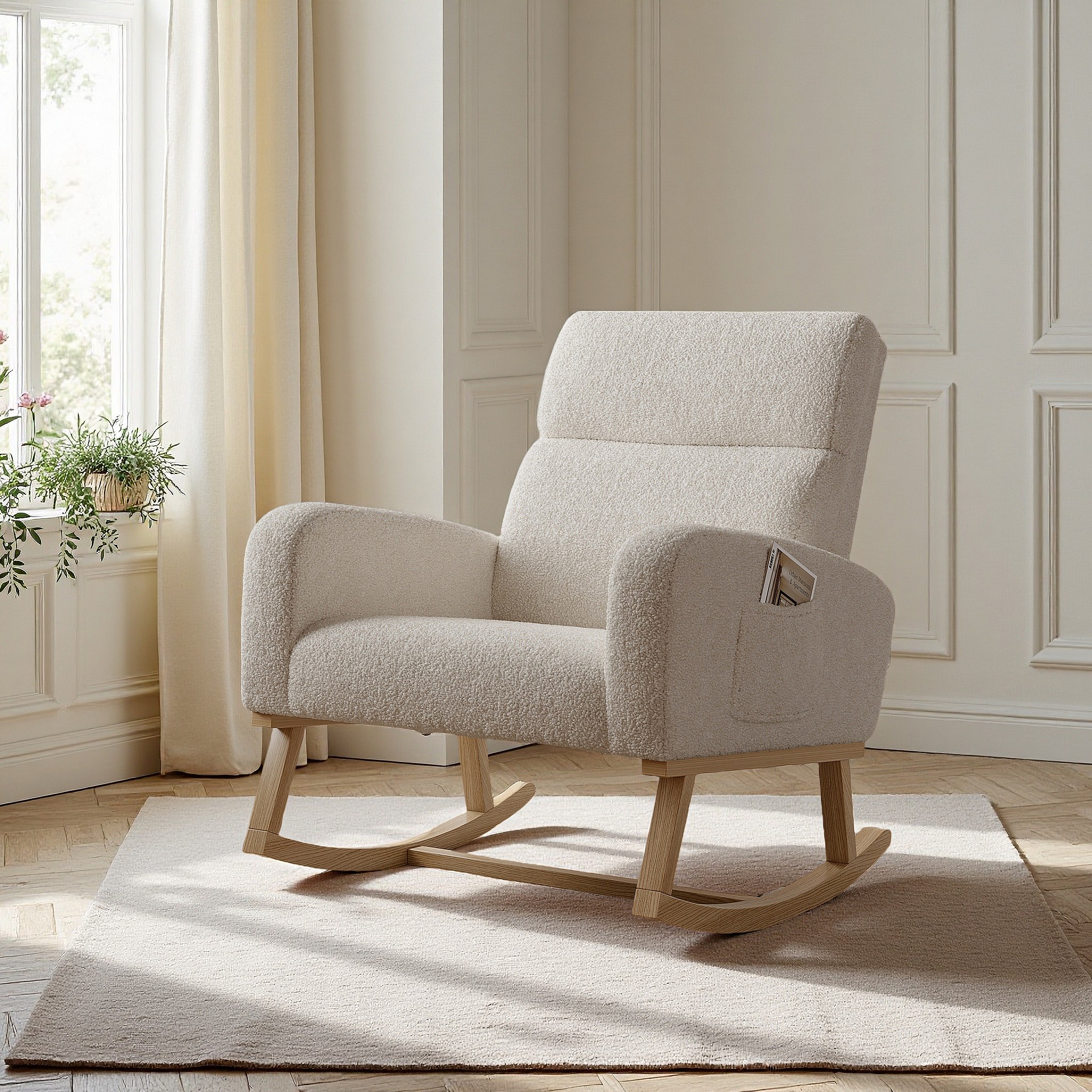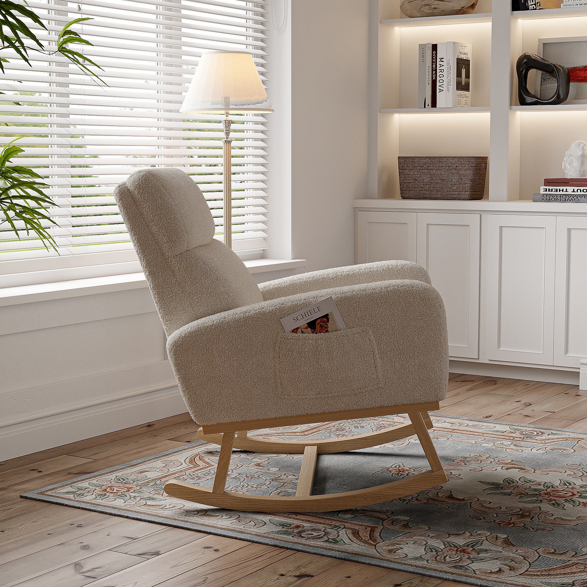 Fauteuil à bascule en tissu teddy beige avec poches latérales, assise large et patins antidérapants silencieux