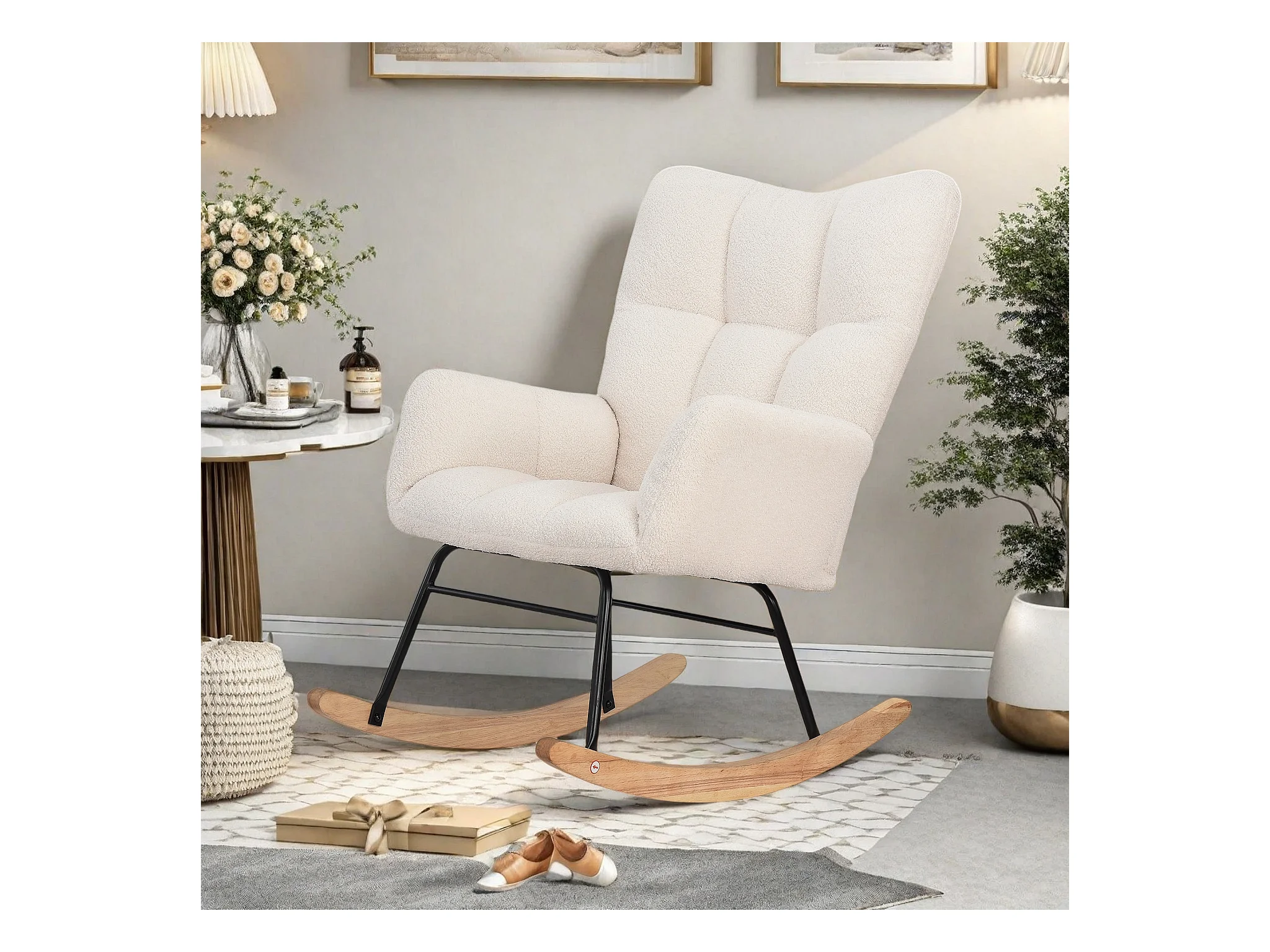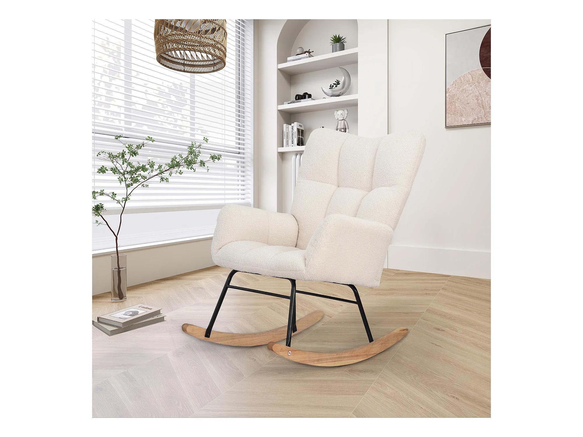 Fauteuil à bascule en tissu teddy blanc cassé, design cosy et moderne pour salon, chambre ou coin lecture