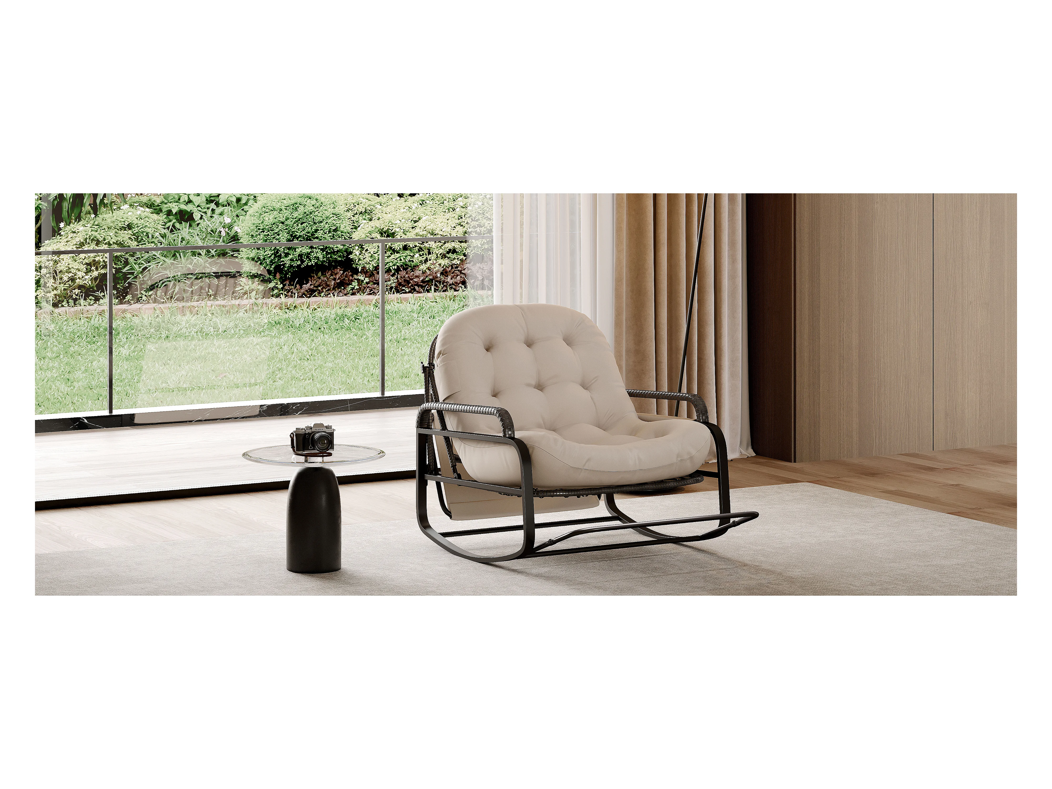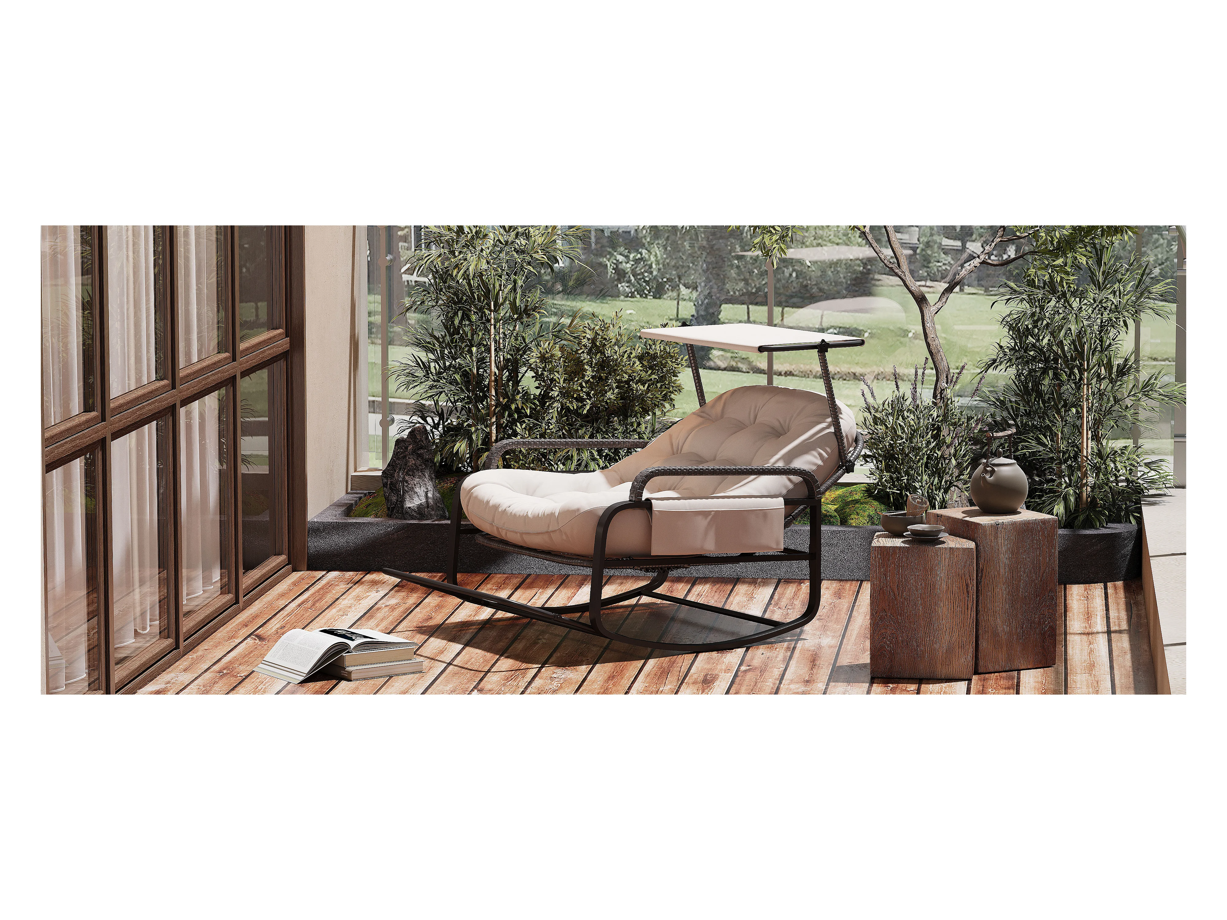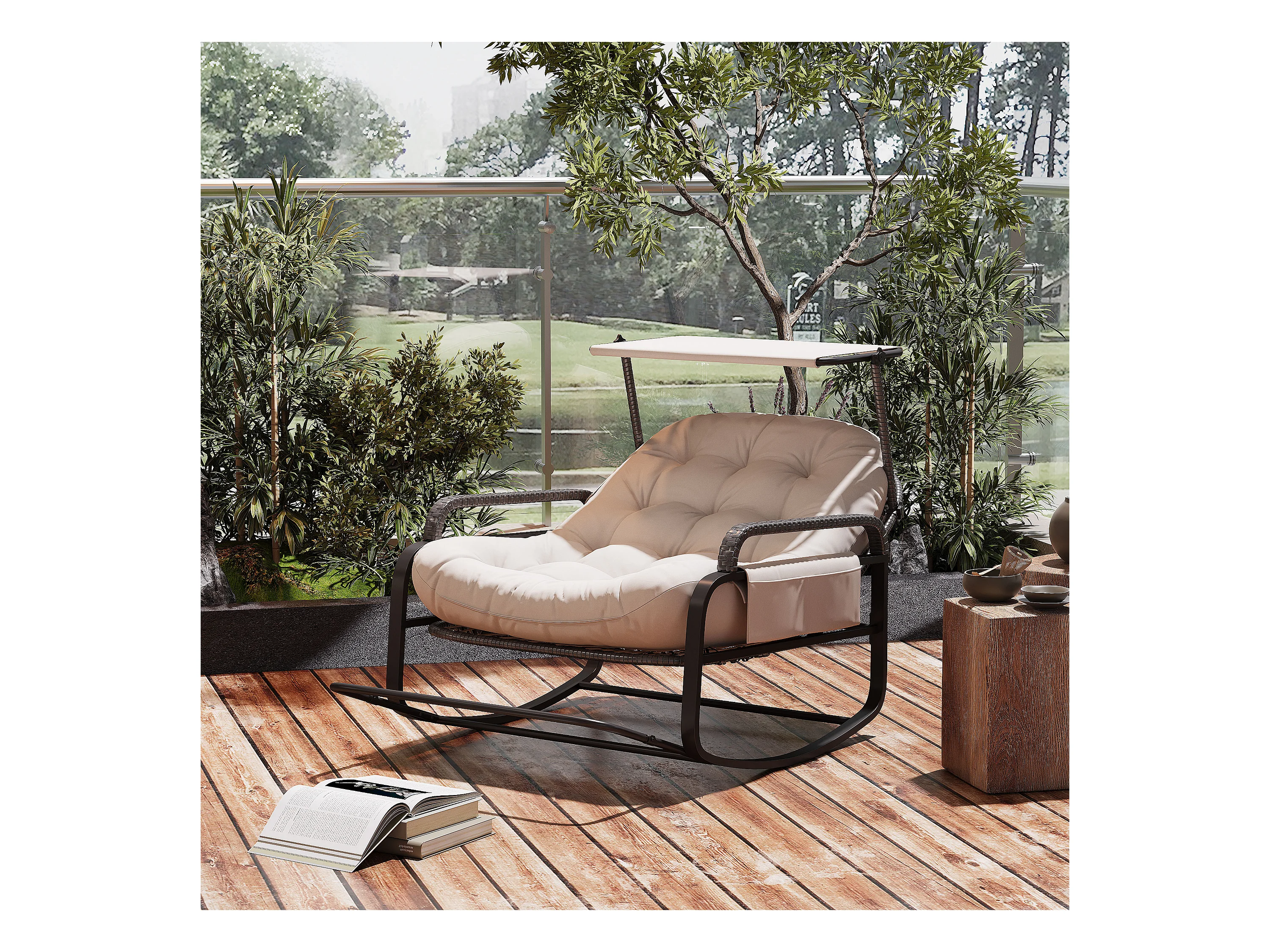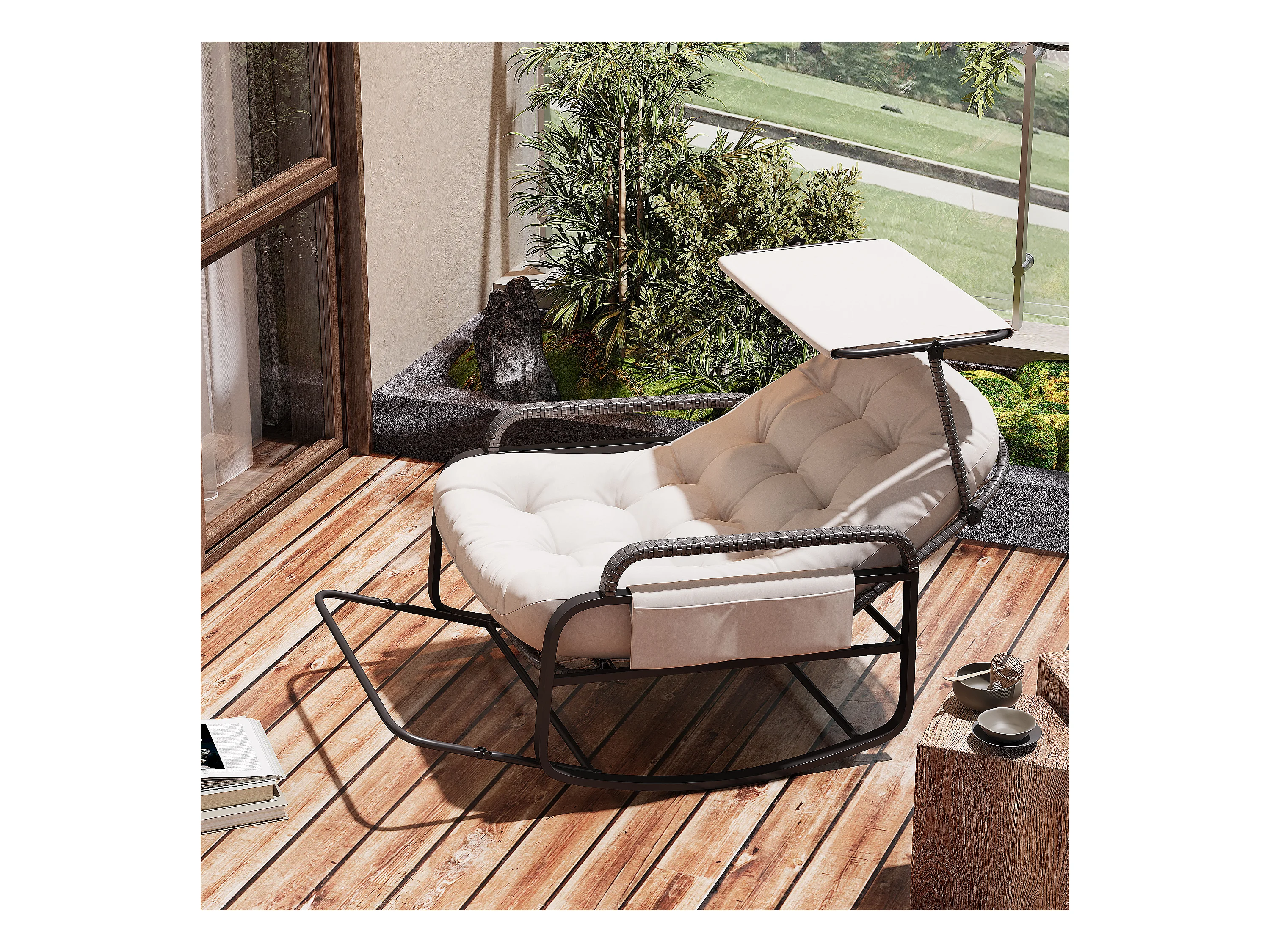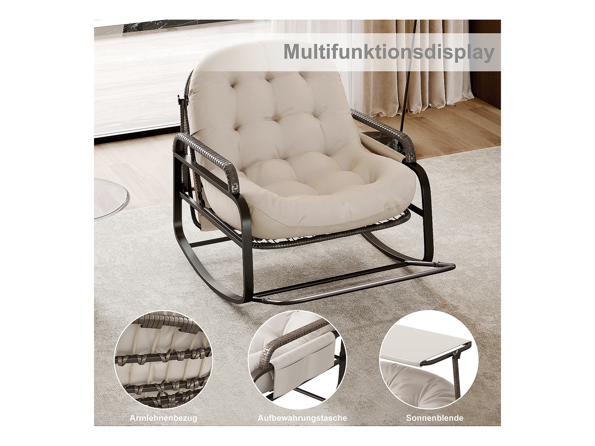 Fauteuil à bascule extérieur avec coussin beige, dossier réglable, repose-pieds pliable et auvent, rotin tressé, idéal balcon jardin terrasse