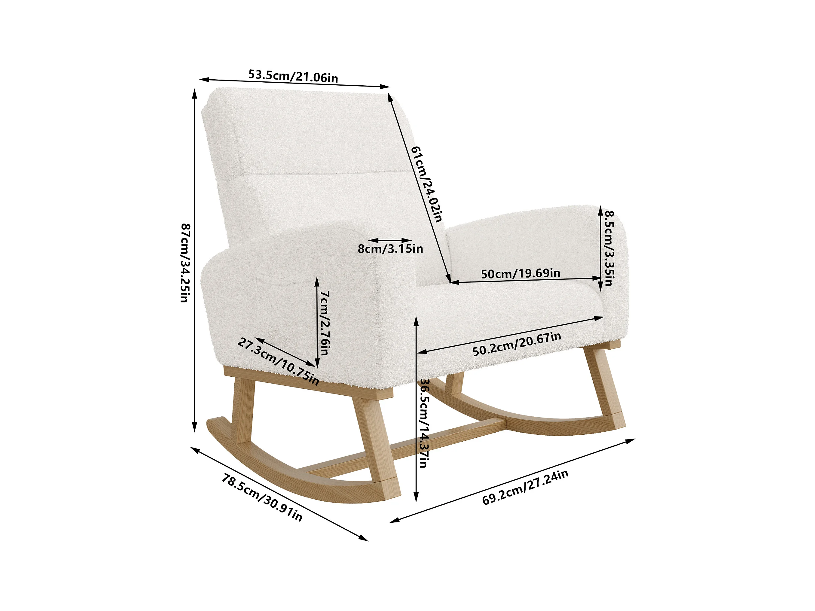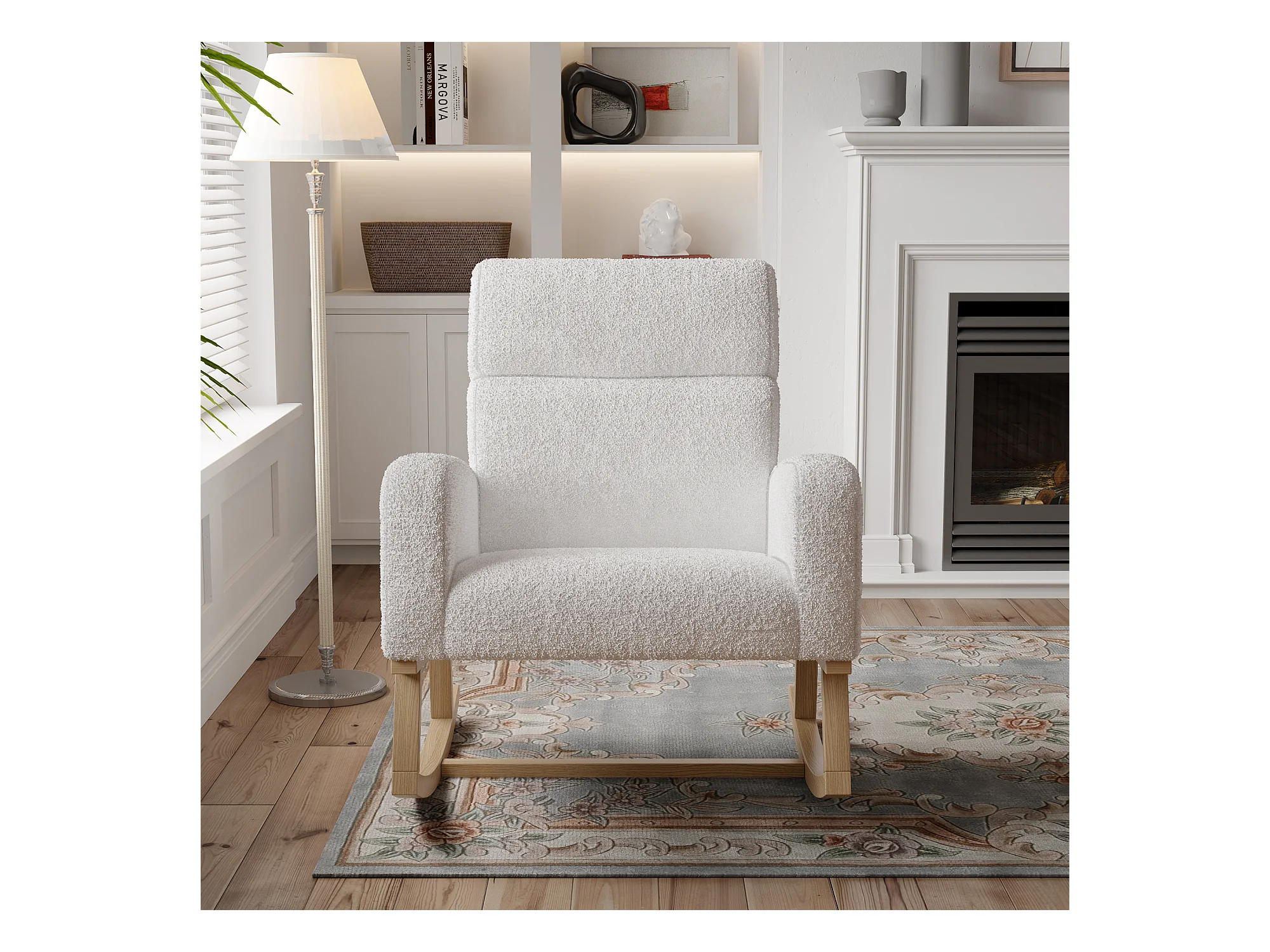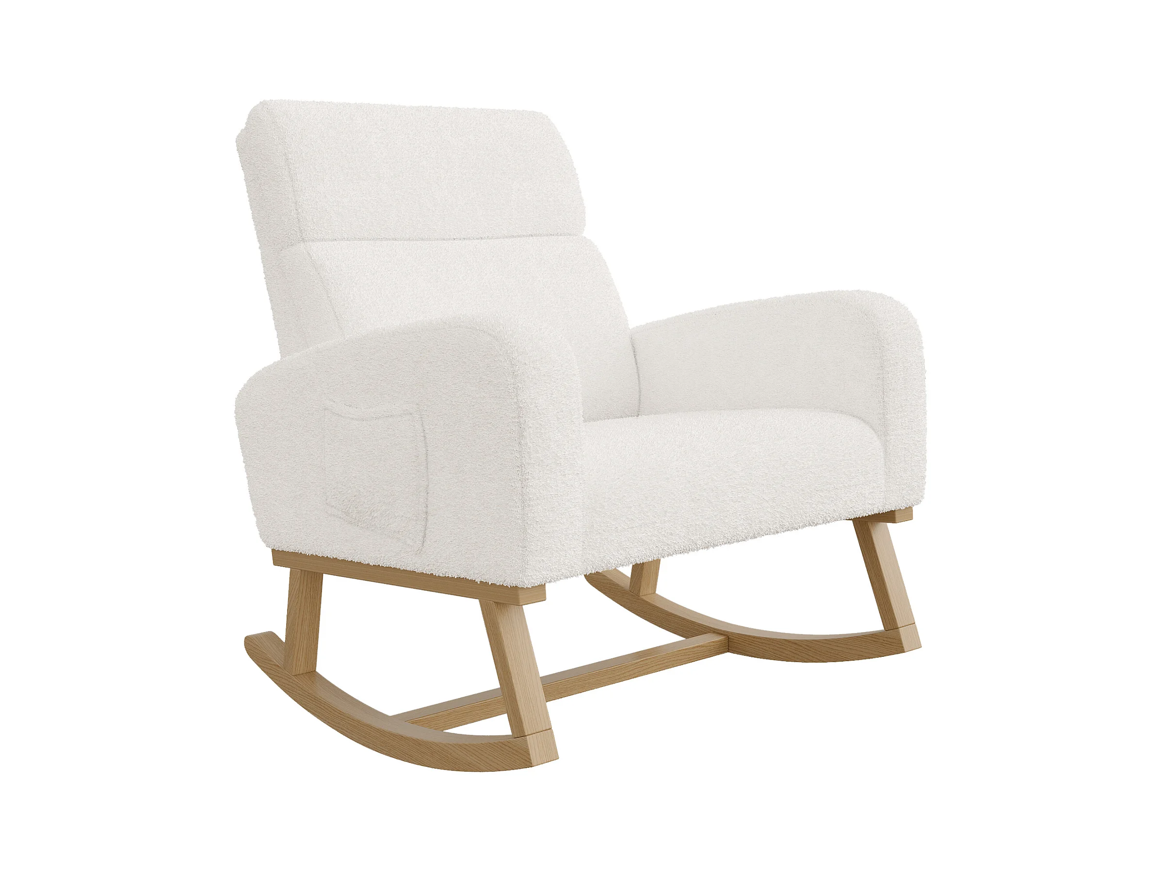 Fauteuil scandinave en Bois, Fauteuil à Bascule, Rocking Chair, Structure en Bois, Sherpa Blanc, 64 x 96 x 85 cm