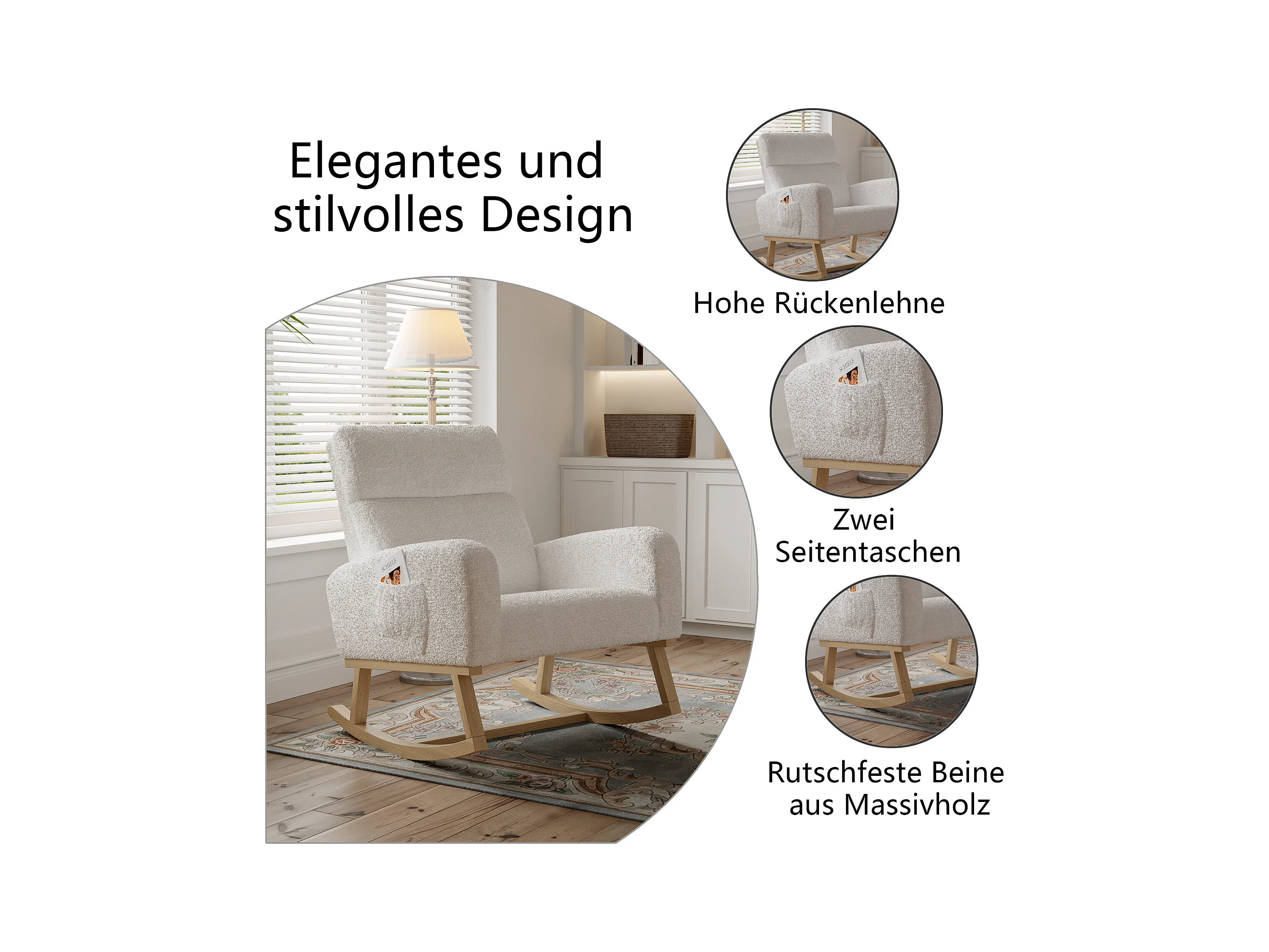 Fauteuil à bascule, fauteuil de relaxation, fauteuil de salon, d'accoudoirs, avec poches et pieds en bois, velours Teddy beige, charge maximale : 150 kg