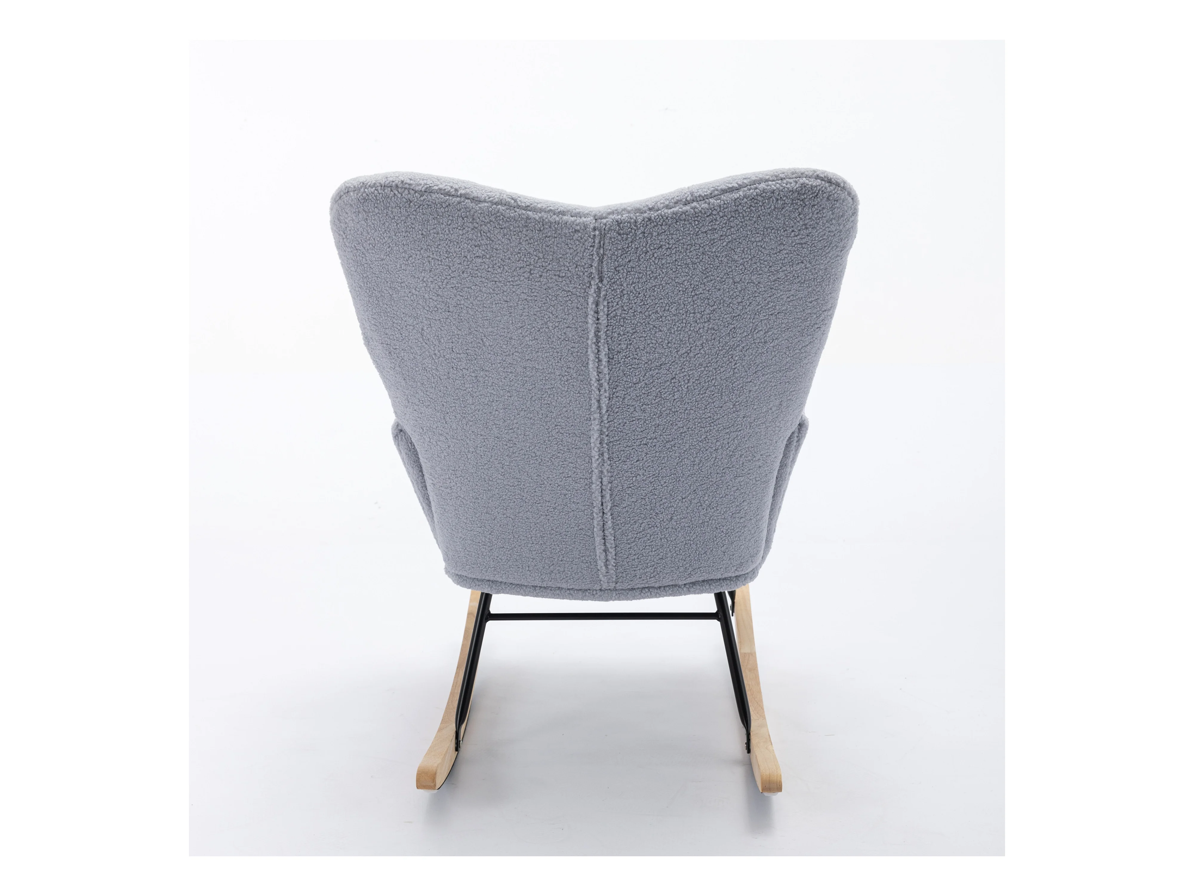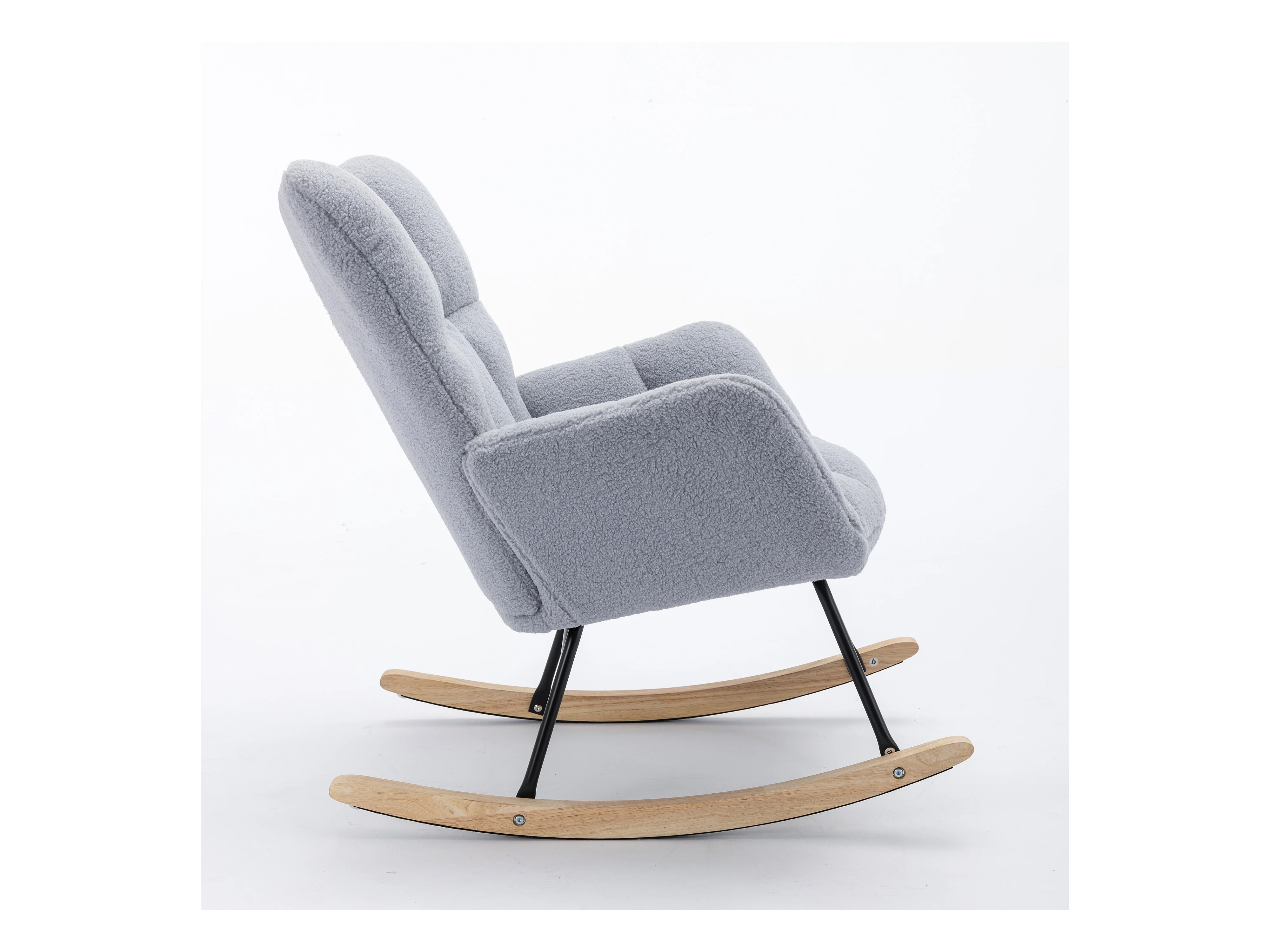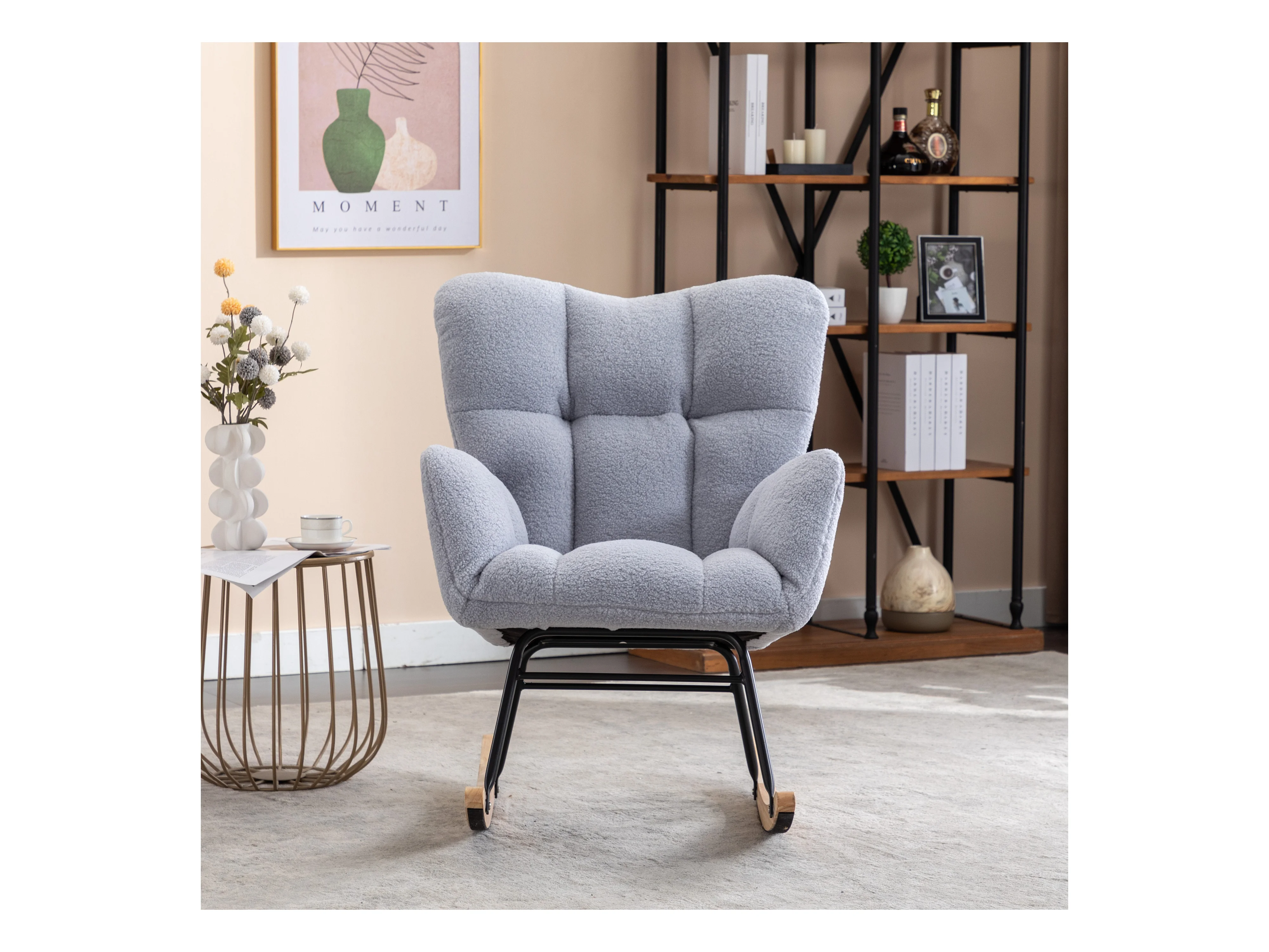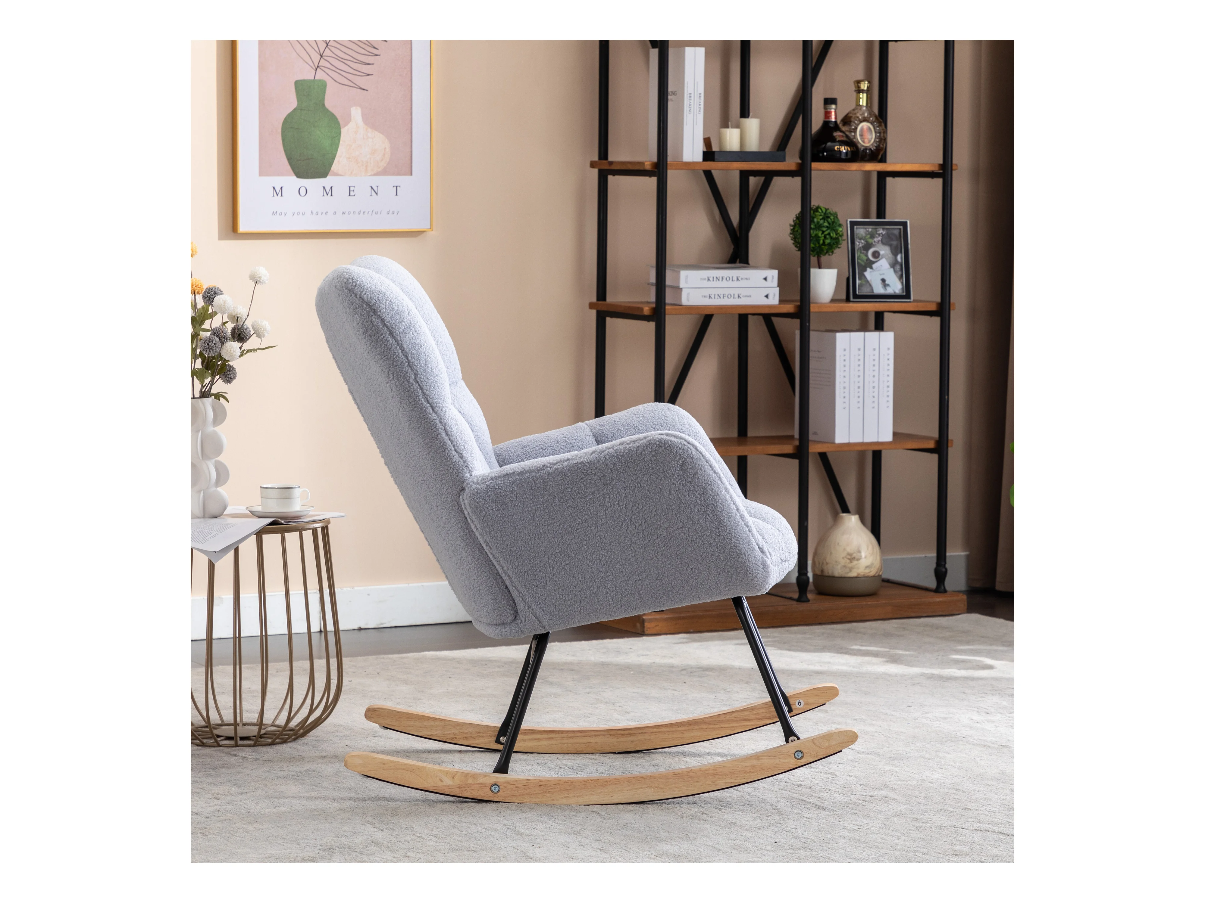 Rocking chair en tissu Teddy gris clair, structure en métal noir, base en bois 89x70x95cm