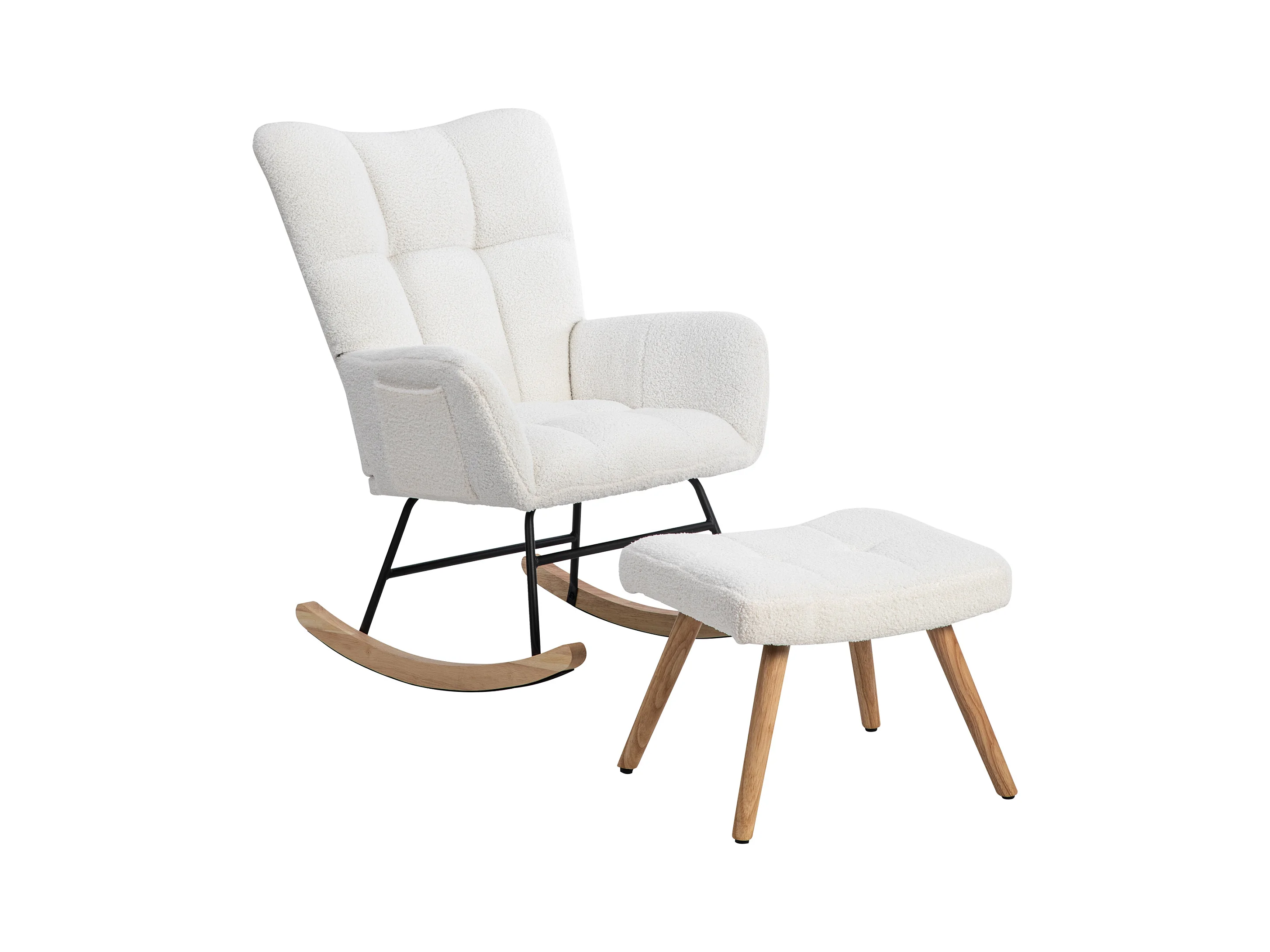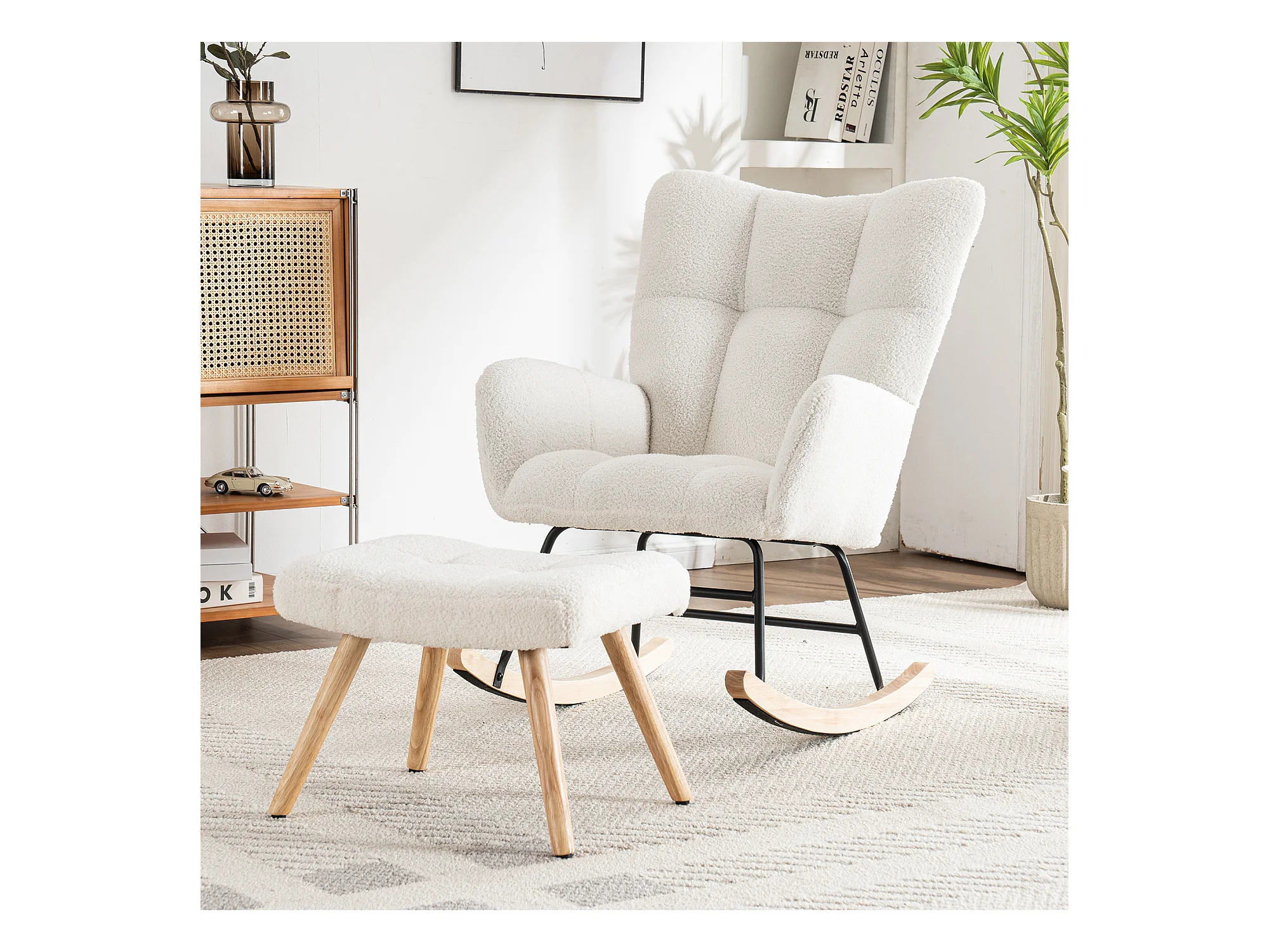 Fauteuil à bascule blanc avec repose-pieds et dossier haut, base en bois,Rocking chair en tissu teddy