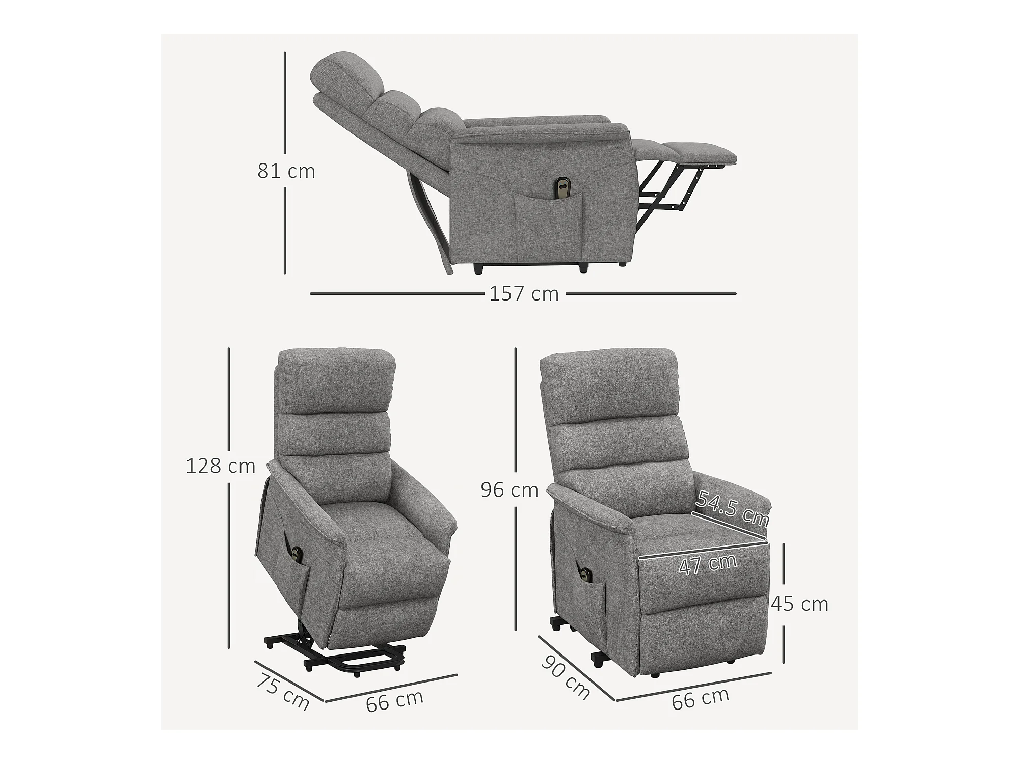 Fauteuil avec fonction de levée électrique, dossier réglable, tissu en lin, gris (66x90x96 cm)