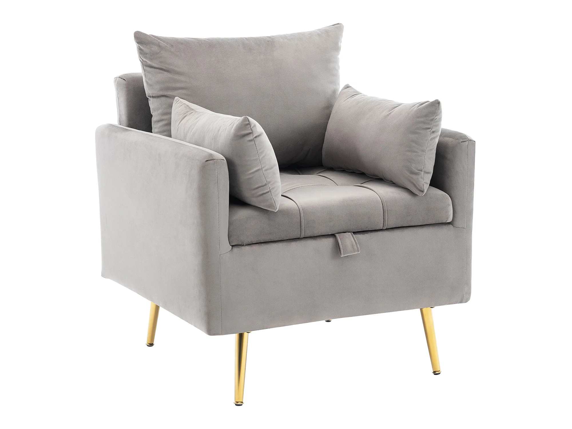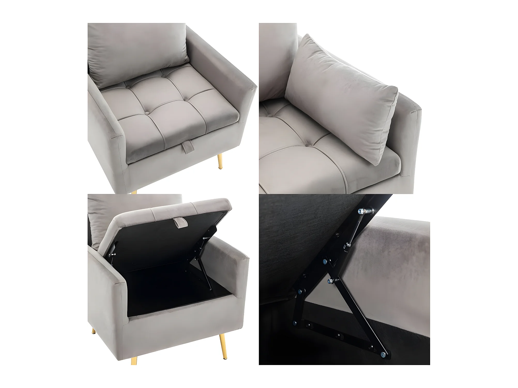 Fauteuil tissu en velours avec rangement et coussin - pieds en métal doré - Gris