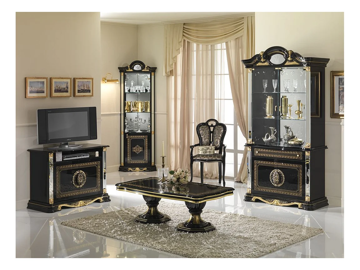 Fauteuil bois massif marron et assise tissu noir avec motifs dorés Kerla