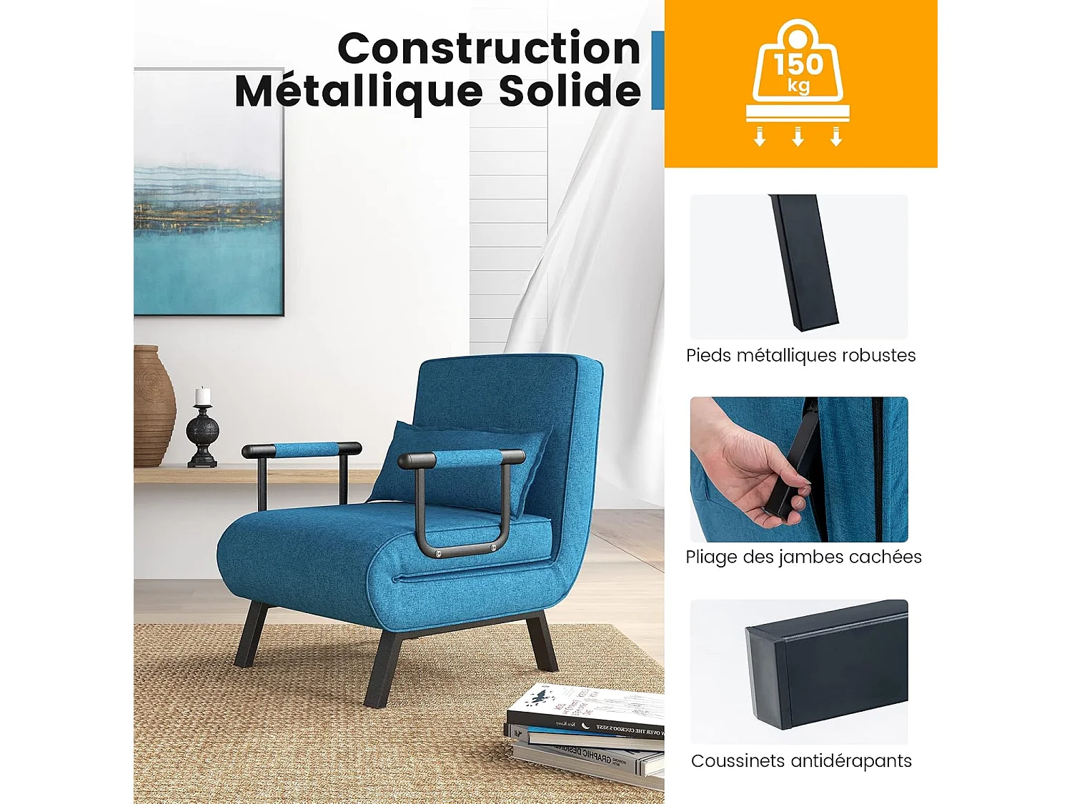 Fauteuil Convertible 1 Place, Fauteuil-Lit Chauffeuse 4-en-1 Dossier Réglable 6 Position, Oreiller, Siège Rembourré, Accoudoirs, Cadre Métal, Canapé-Lit Pliant, Bleu
