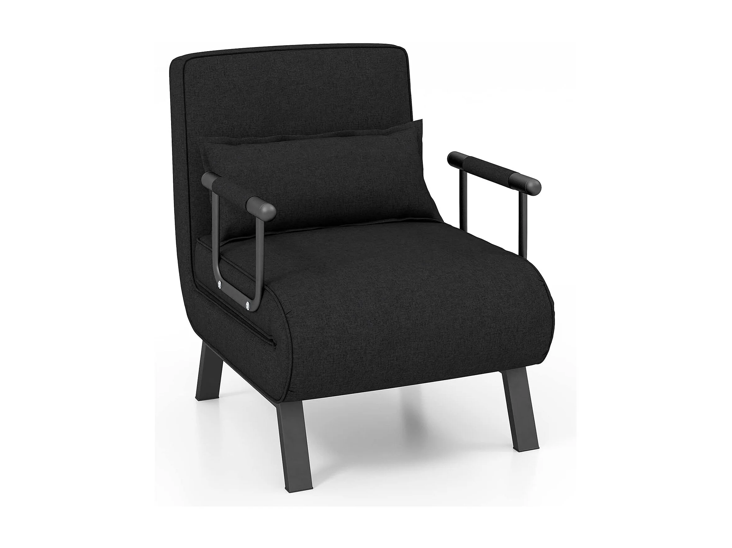 Fauteuil Convertible à Lit 1 Place, Fauteuil de Salon 4-en-1, Dossier Réglable en 6 Positions avec Oreiller, Oreiller, Siège Rembourré, Accoudoirs, Cadre Métal, Canapé-Lit Pliant, Noir