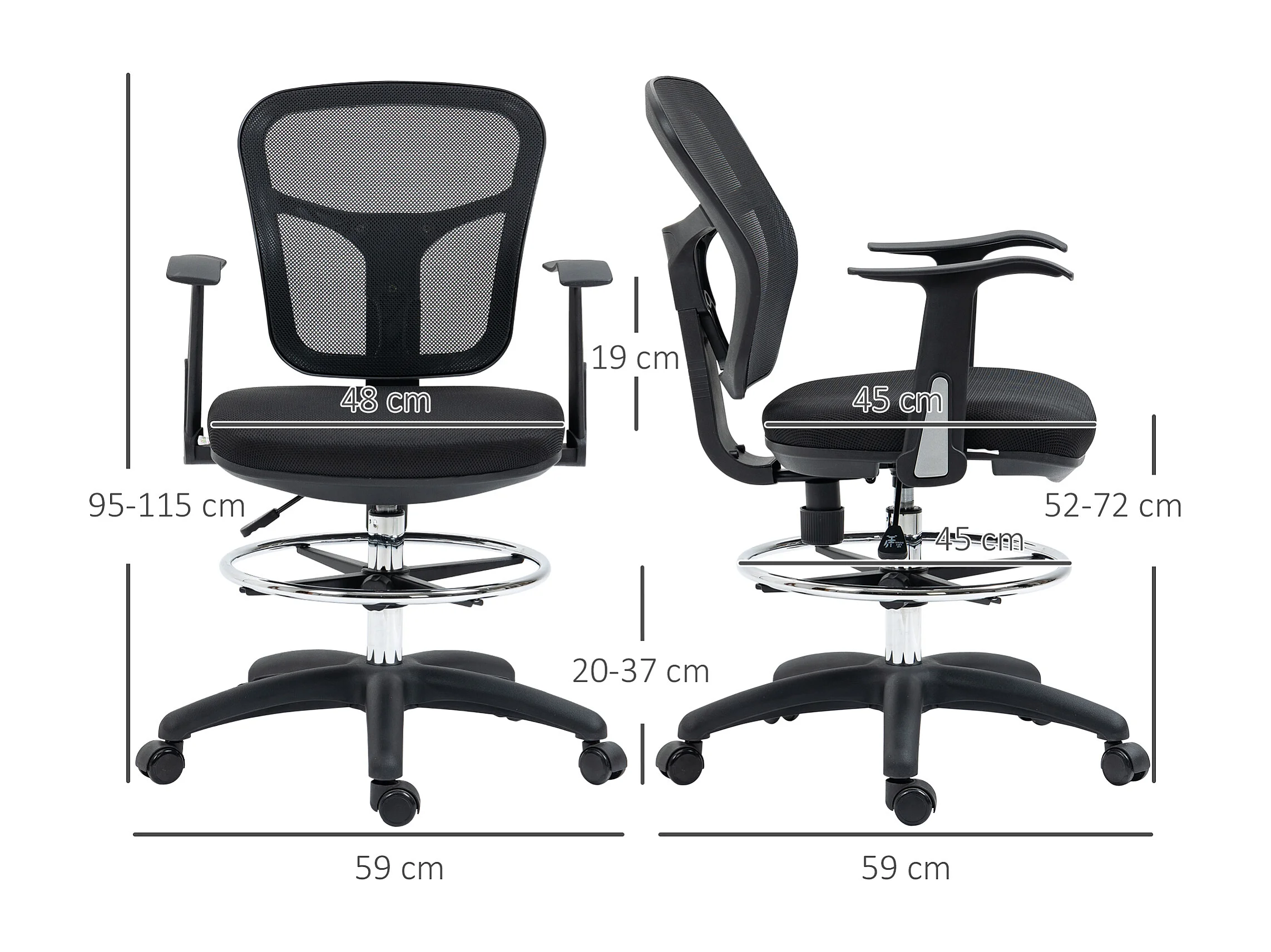 Fauteuil de bureau ergonomique avec accoudoirs et repose-pieds, mesh noir, hauteur réglable (59x59x95-115cm)