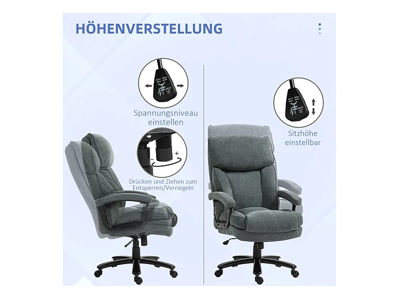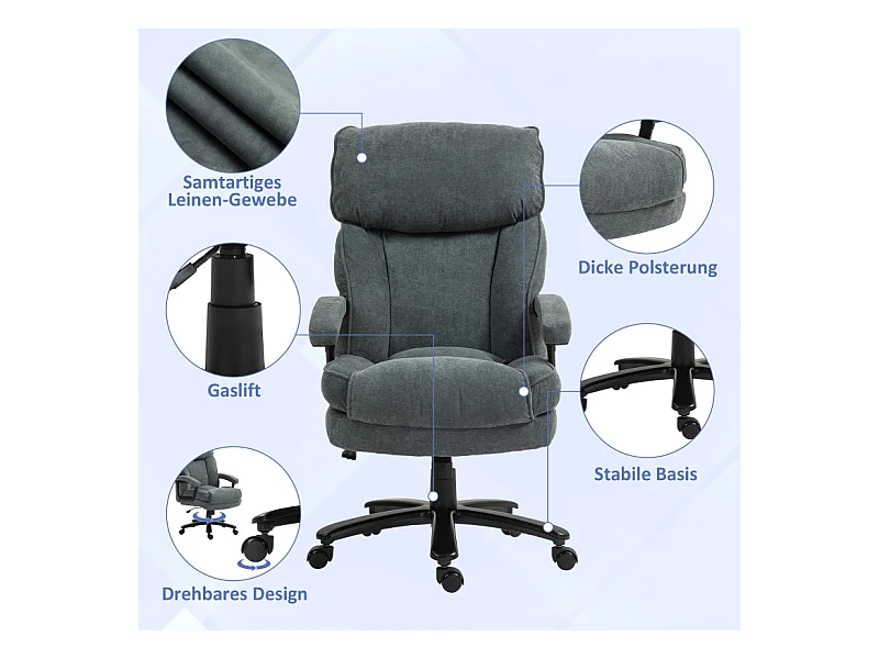 Fauteuil de bureau avec appui-tête et accoudoirs, réglable en hauteur, pivotant avec repose-pieds, lin, ergonomique, 66x70x116-124 cm
