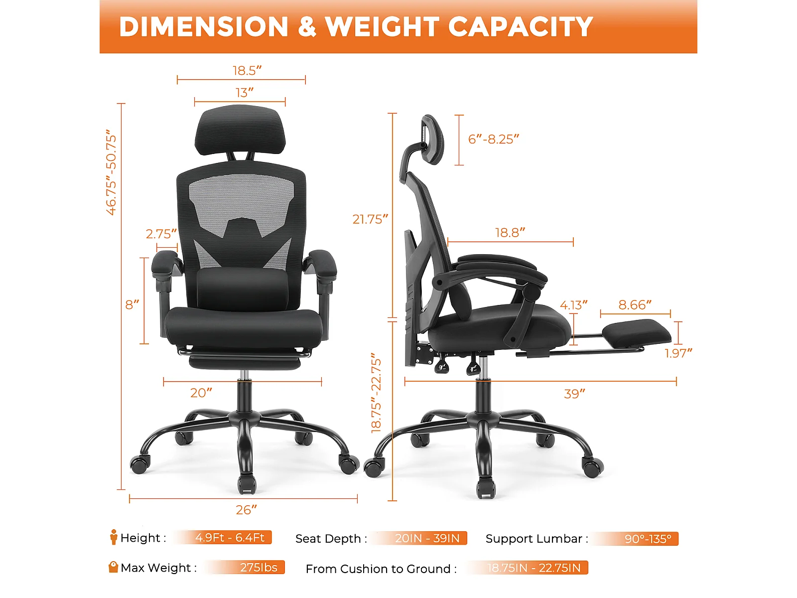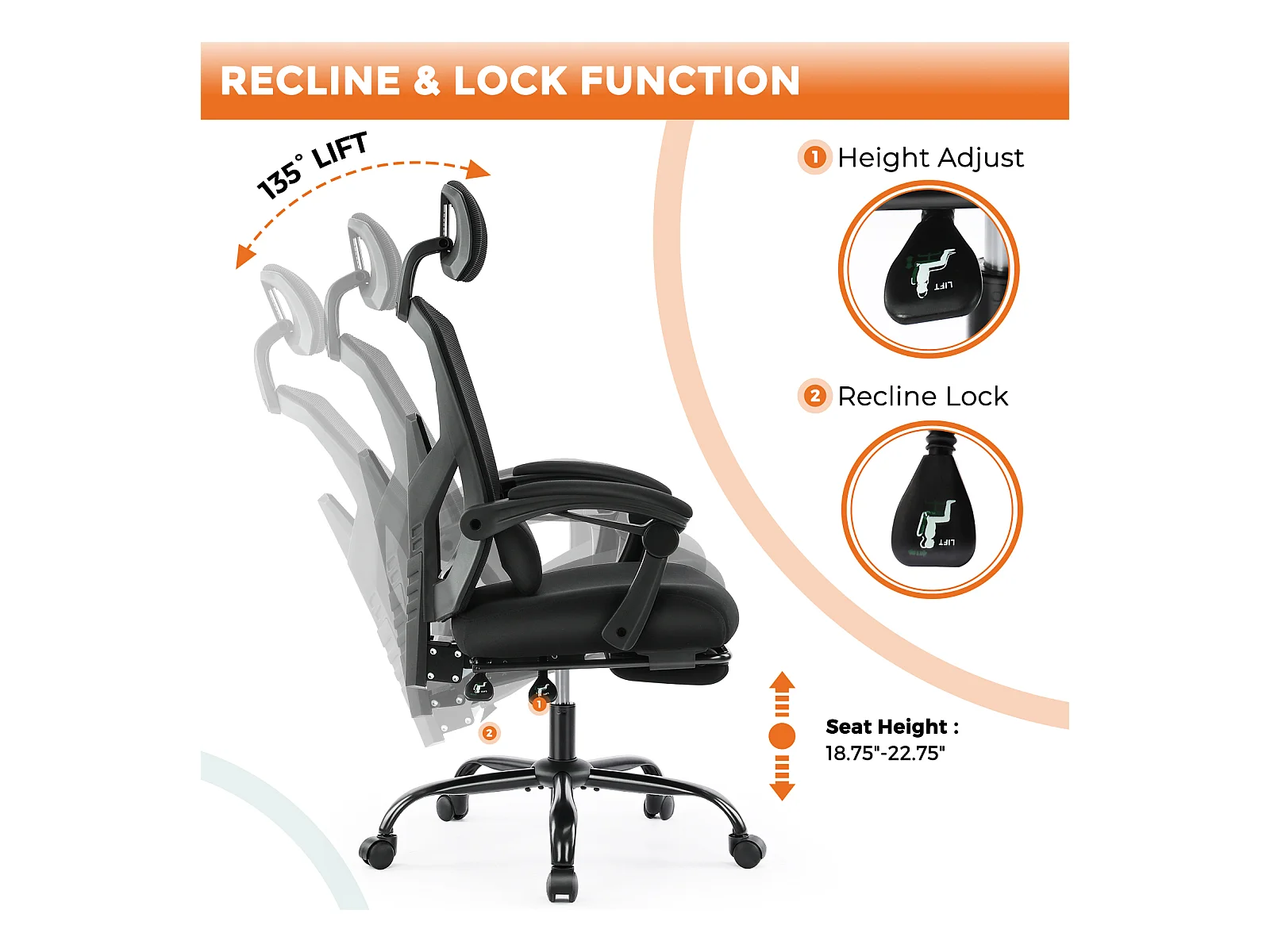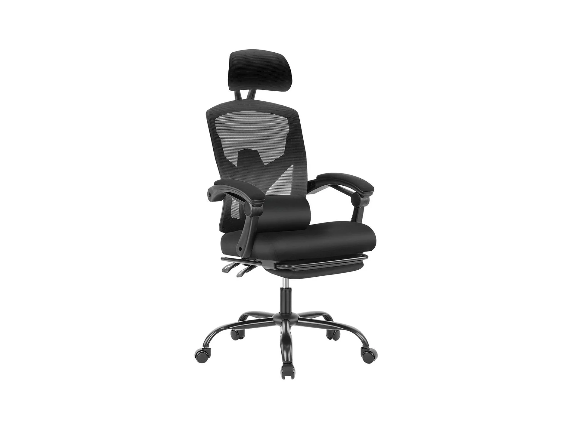 Fauteuil de bureau pivotant avec support lombaire et accoudoirs rembourrés, repose-pieds rétractable ergonomique, noir