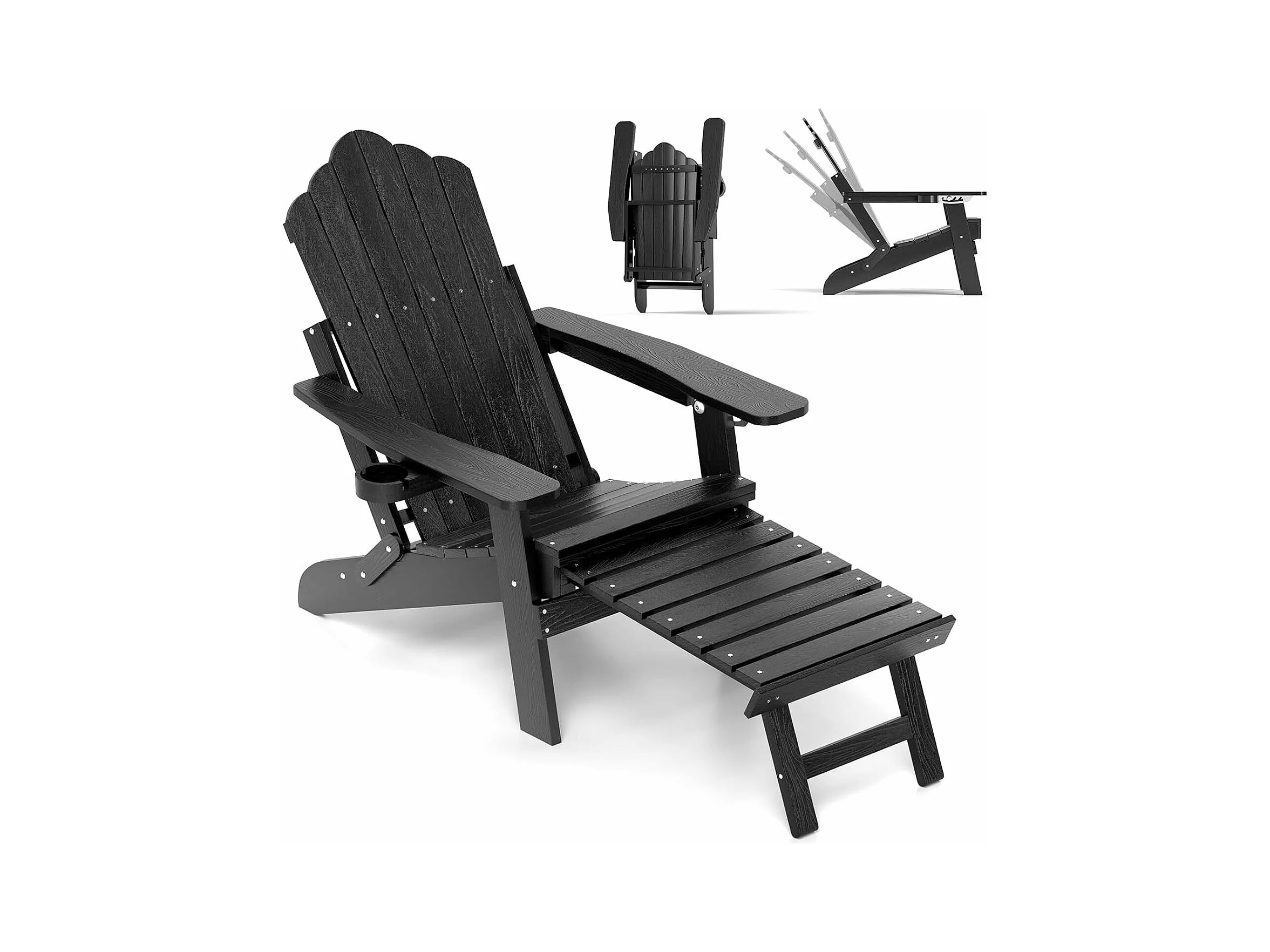 Fauteuil de Jardin, Chaise Adirondack Pliable, Repose-Pieds Rétractable, Dossier Réglable, Porte-gobelet, Chaise Longue HIPS, 119 × 78 cm, Charge 180 kg, Noir