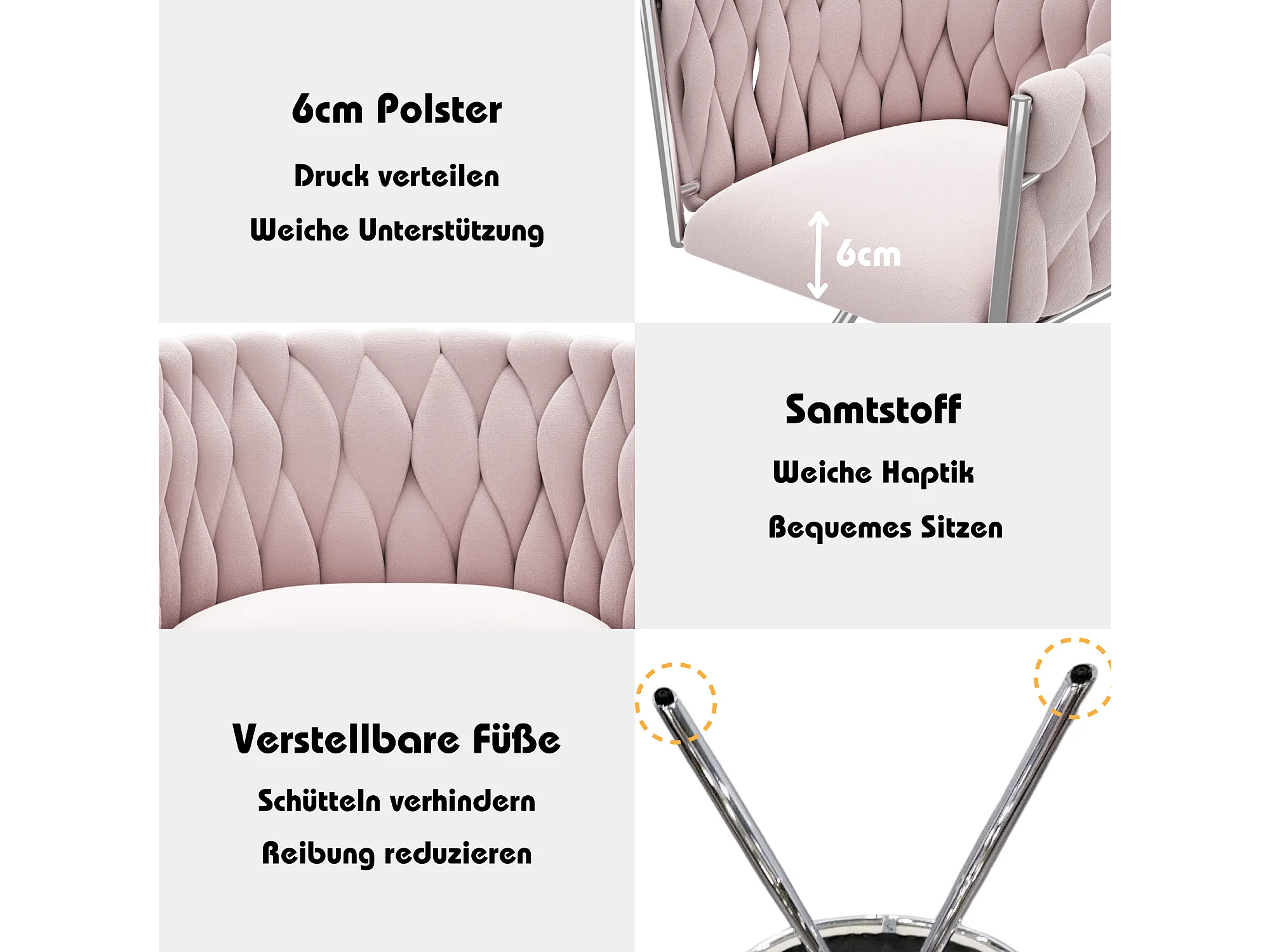 Fauteuil de maquillage en velours, design moderne, avec accoudoirs et quatre pieds métalliques, rose (59.69x55.25x45.72 cm)
