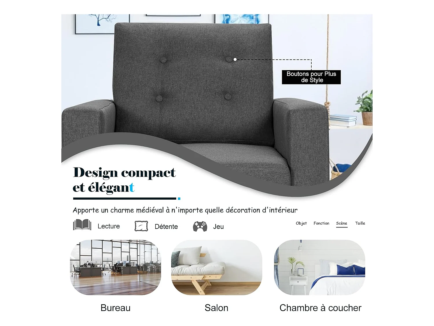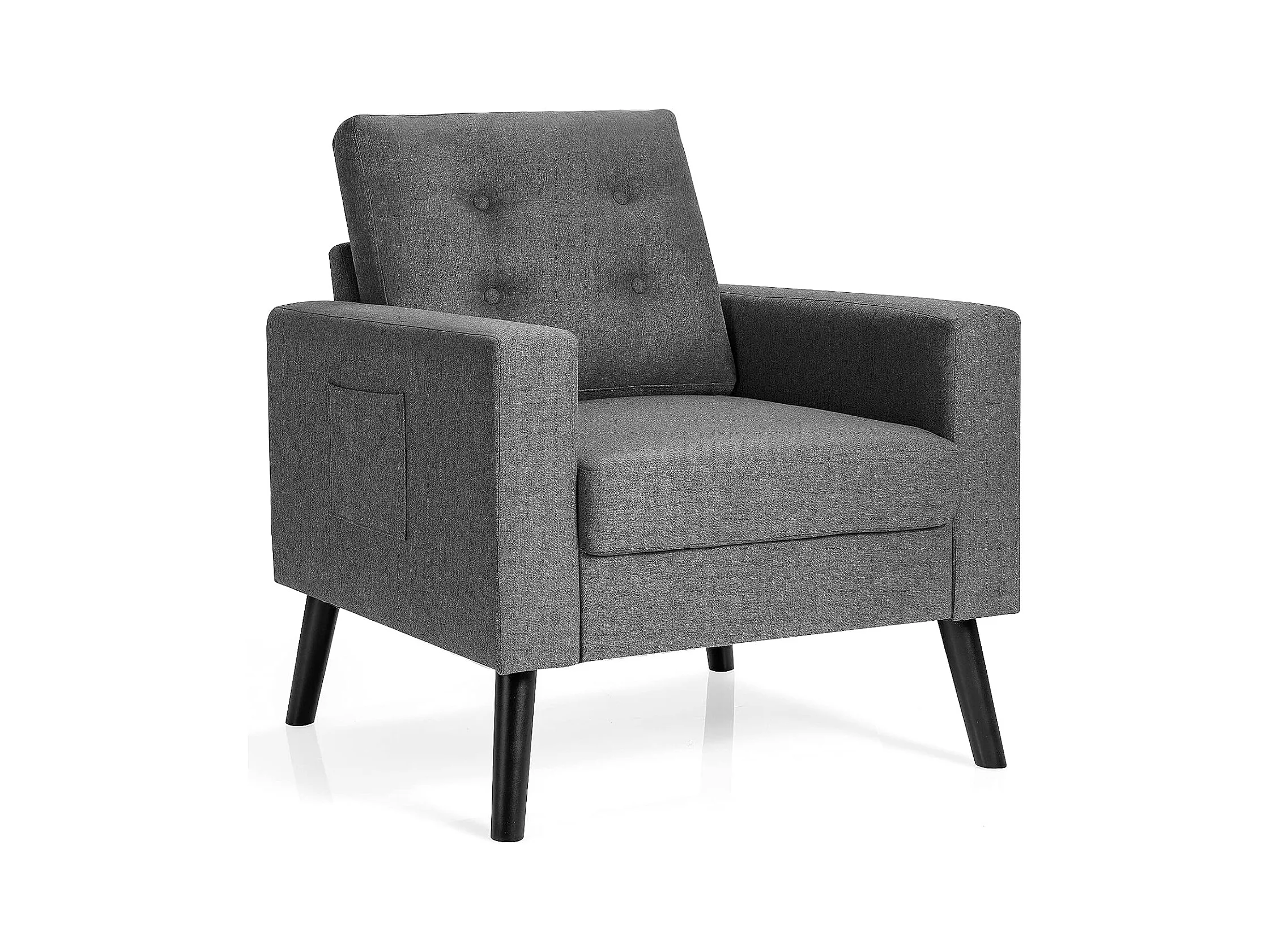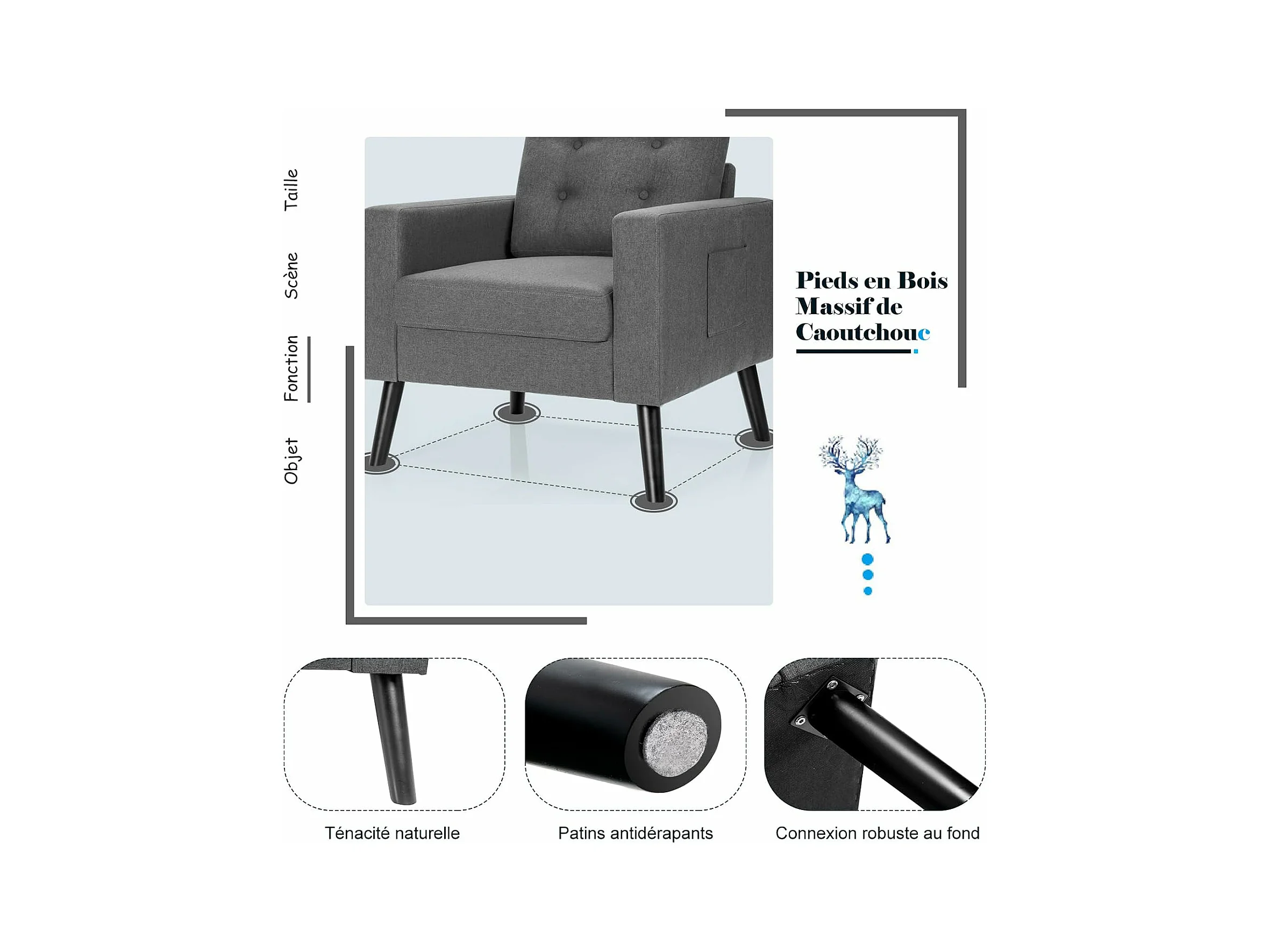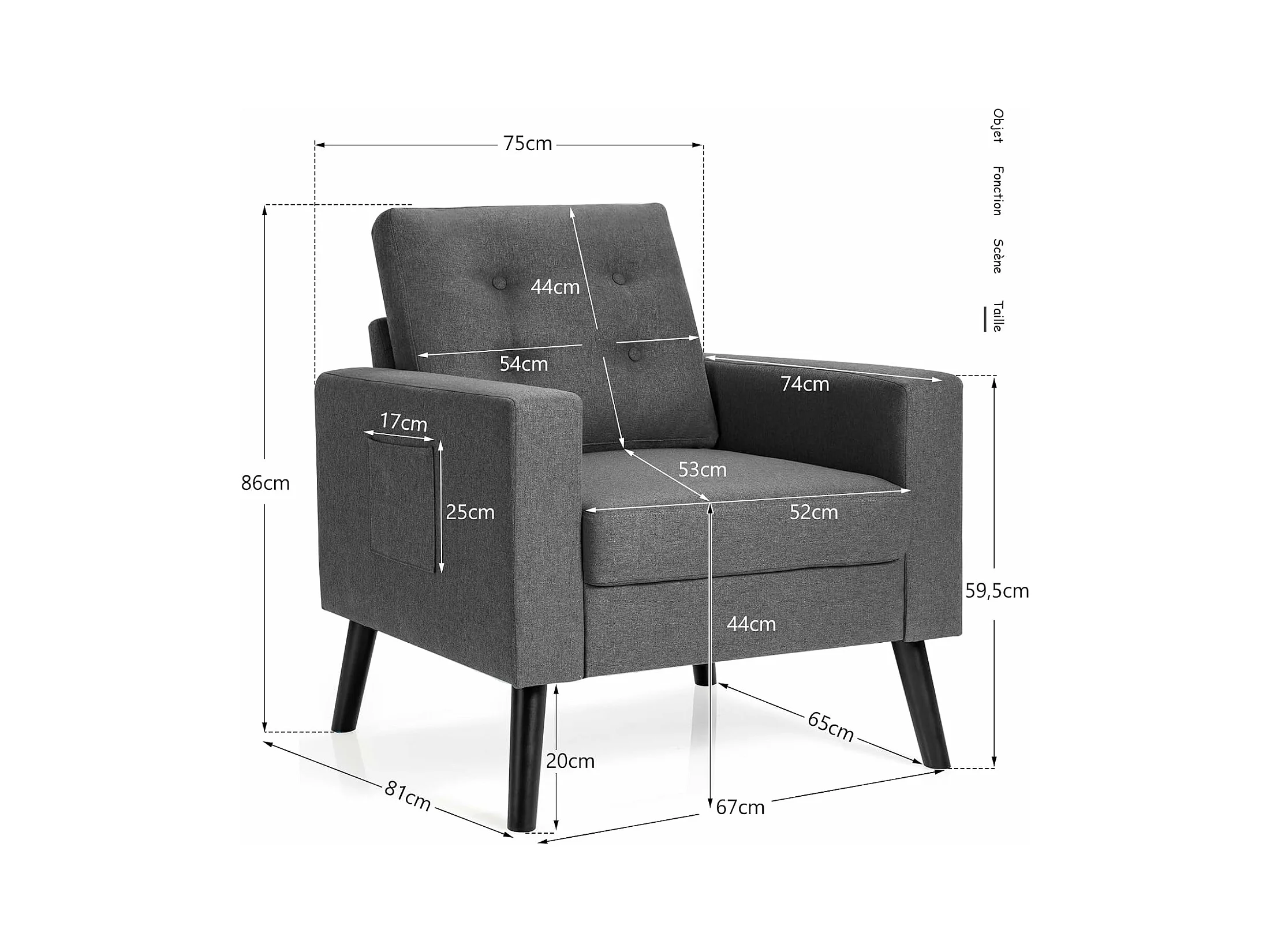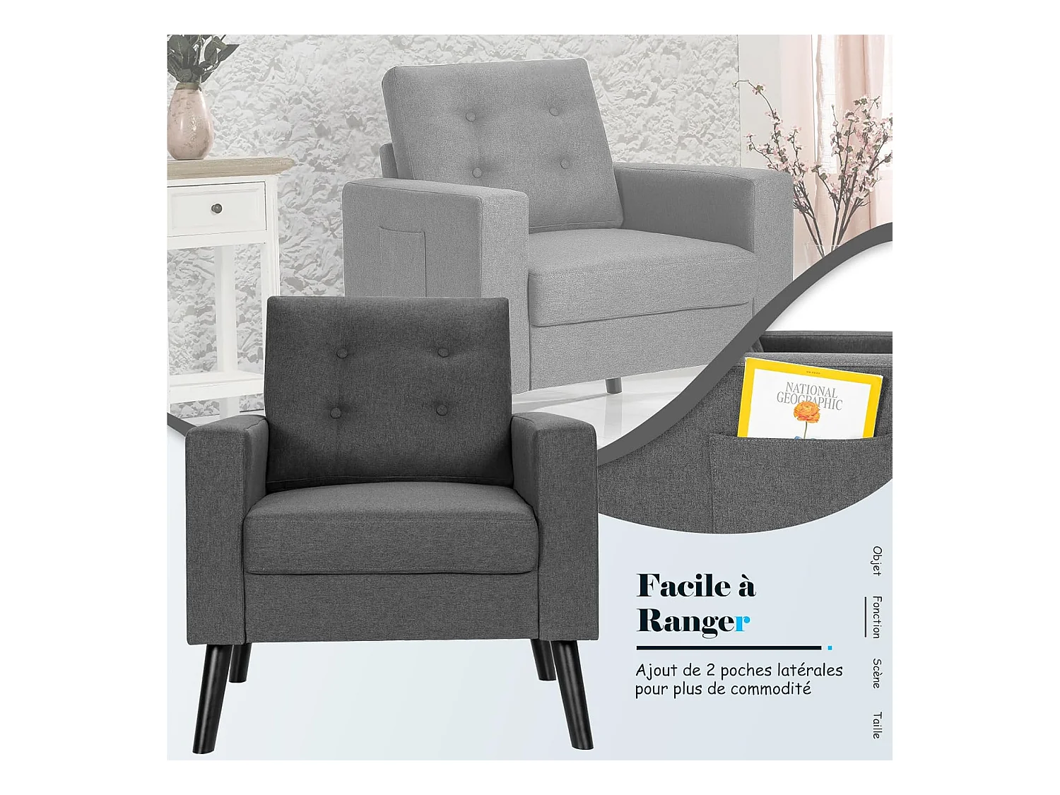 Fauteuil de Salon 1 Personne, Style Scandinave, Canapé 1 Place avec Pieds Bois d’Hévéa, 2 Poches Latérales, pour Salon, Bureau, Profondeur d'assise 53 cm (Gris)