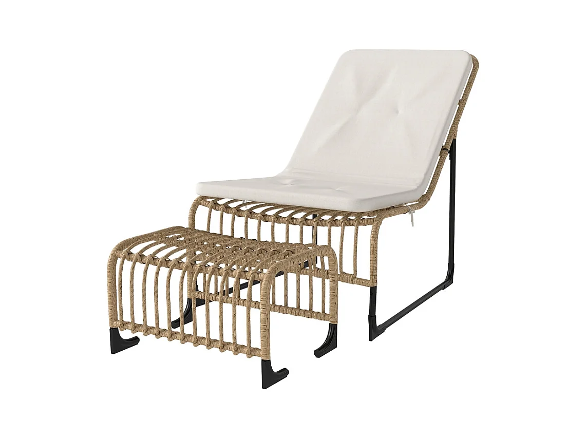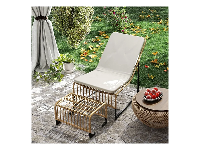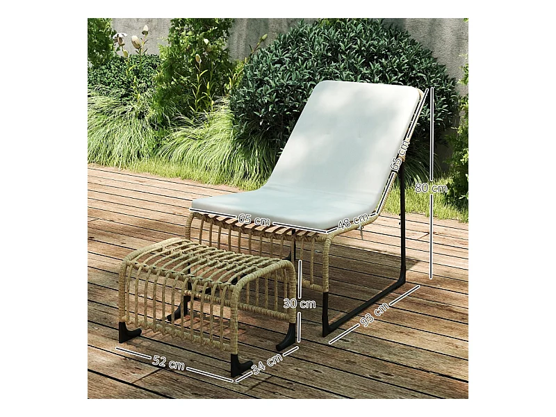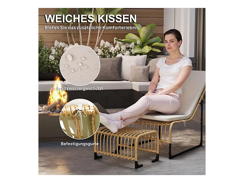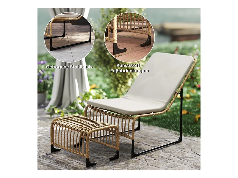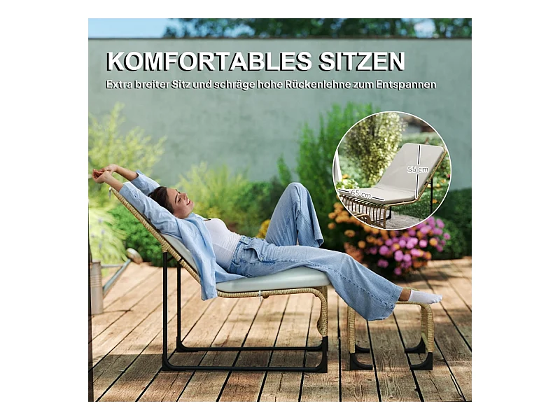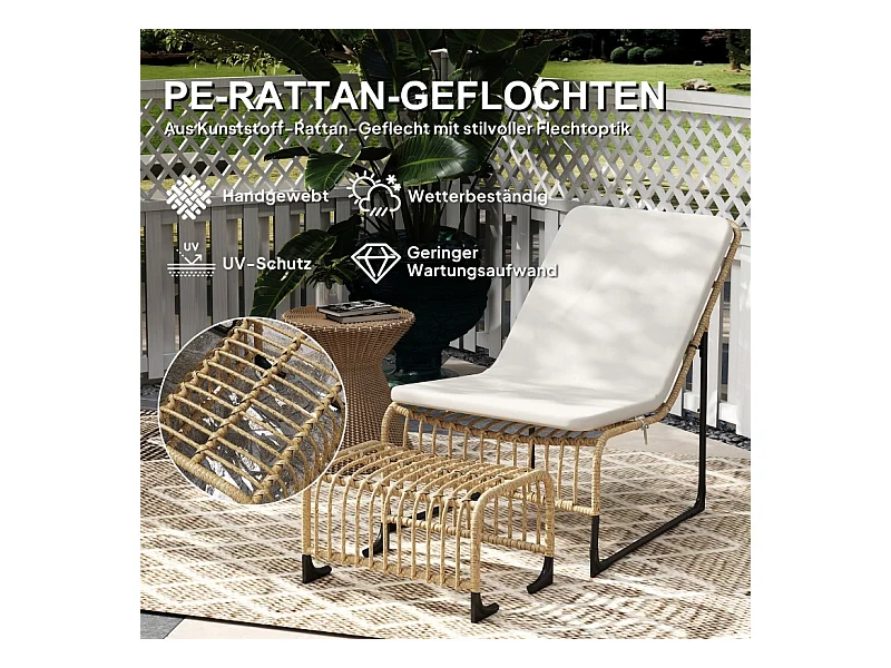 Fauteuil en rattan avec repose-pieds, résistant aux UV, fauteuil de jardin avec coussins, pour terrasse, balcon, bois naturel (93x65x80 cm)