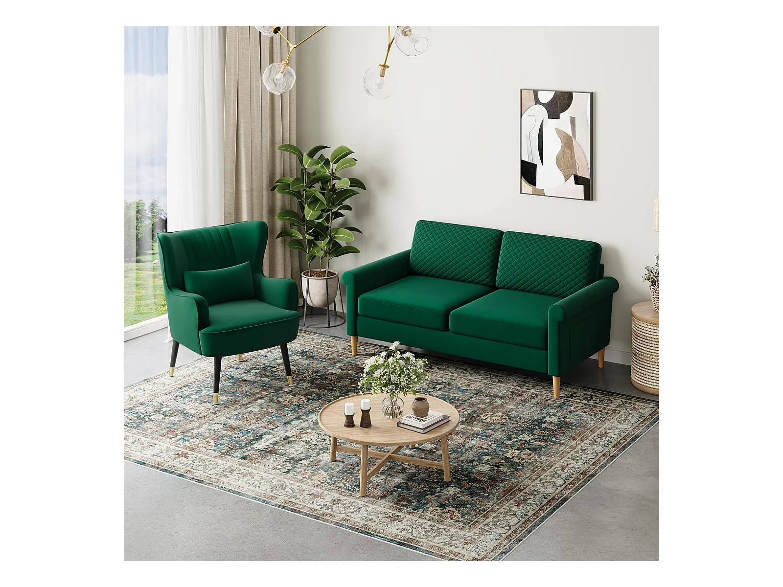 Chaise longue en velours, fauteuil relax avec accoudoirs et coussin lombaire cylindrique pour salon, appartement, petit espace - Vert