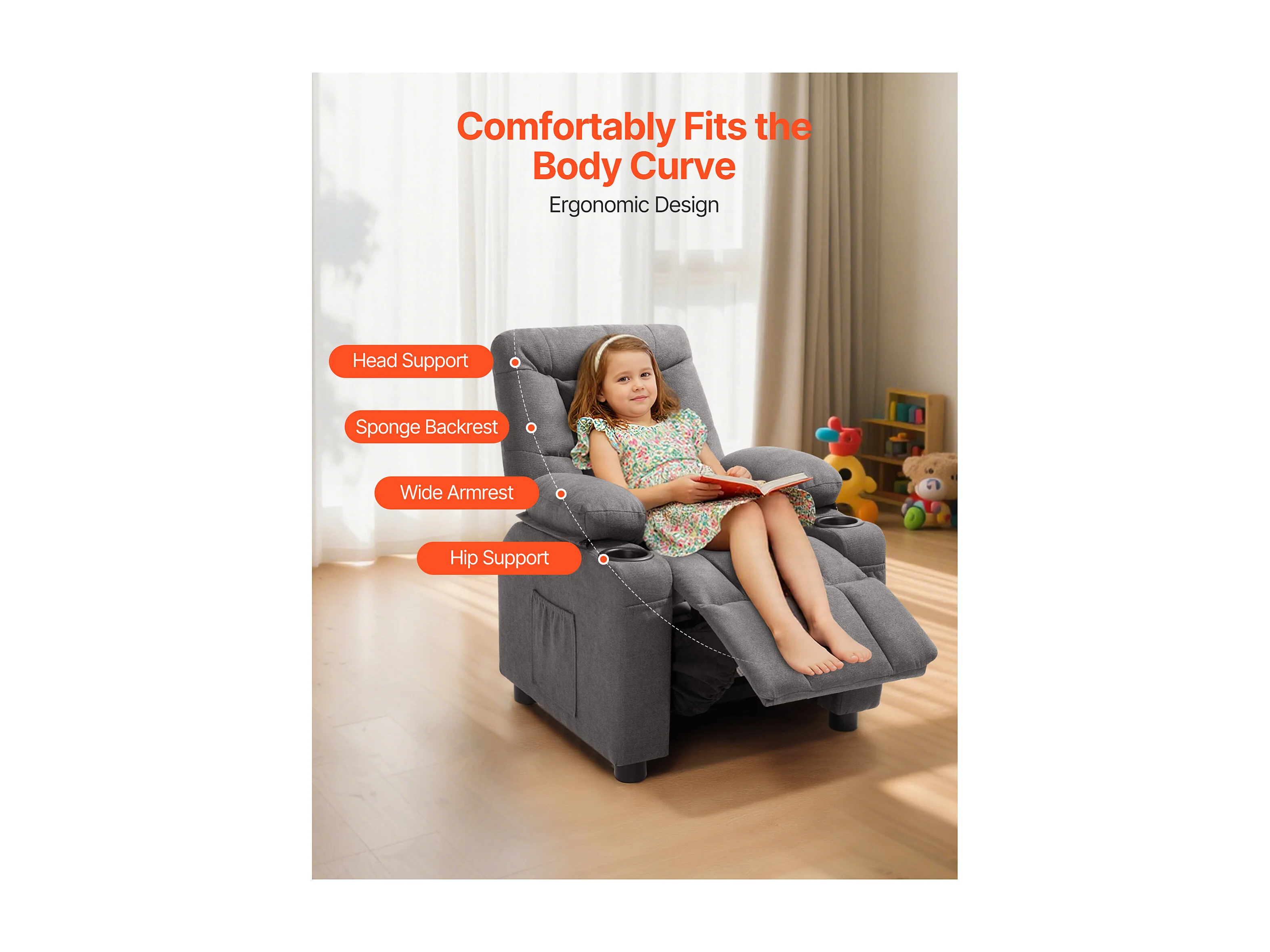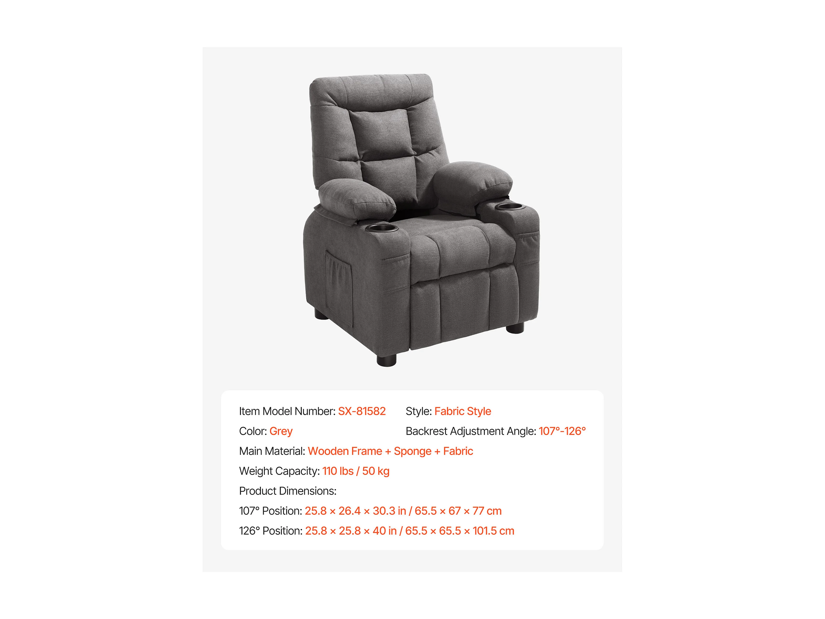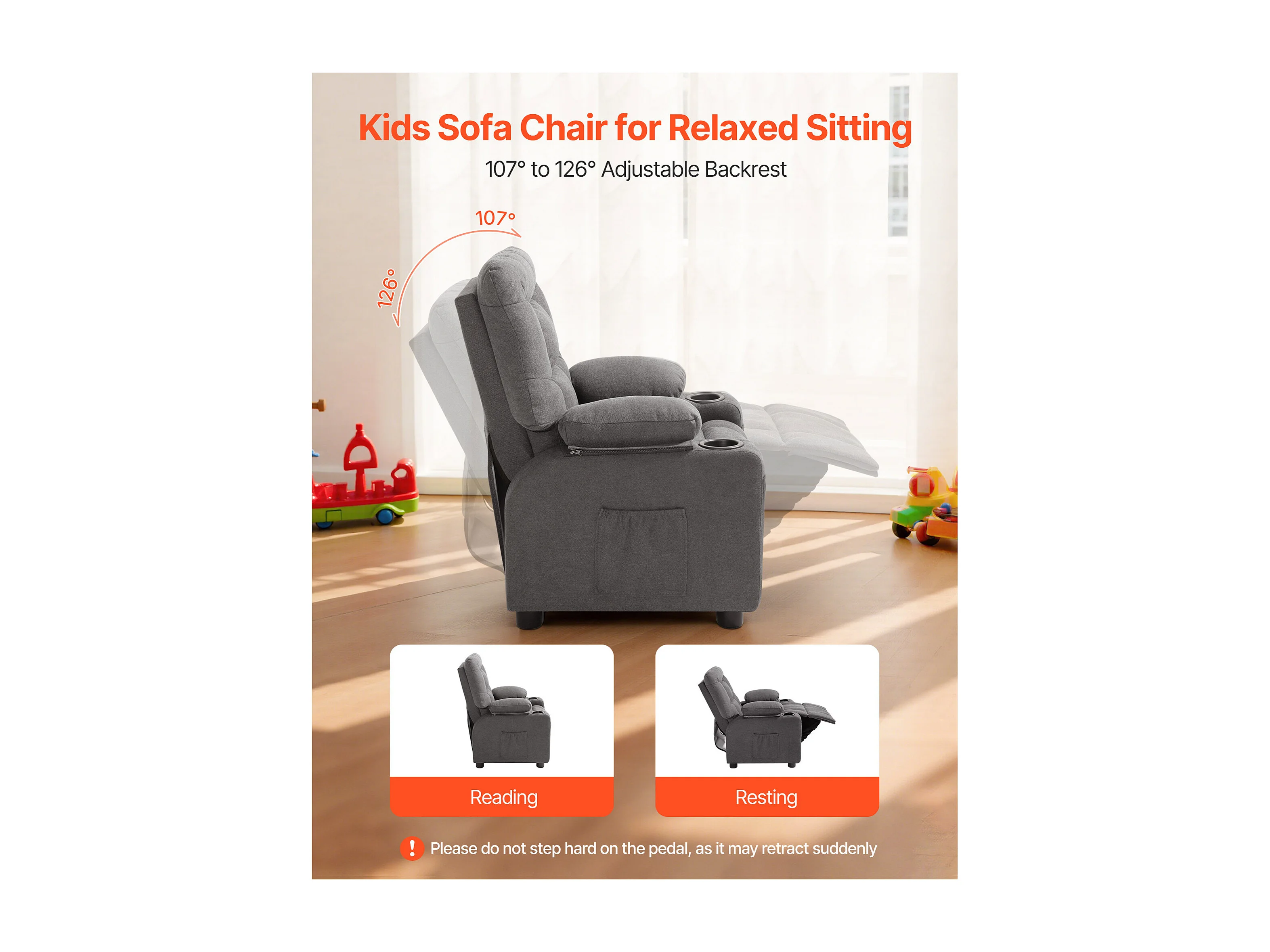 Fauteuil Inclinable SucceBuy pour Enfants, Chaise Relax Ergonomique, avec Porte-Gobelets et Poches, Dossier Réglable 107° à 126°, pour Chambre d’Enfants, Gris