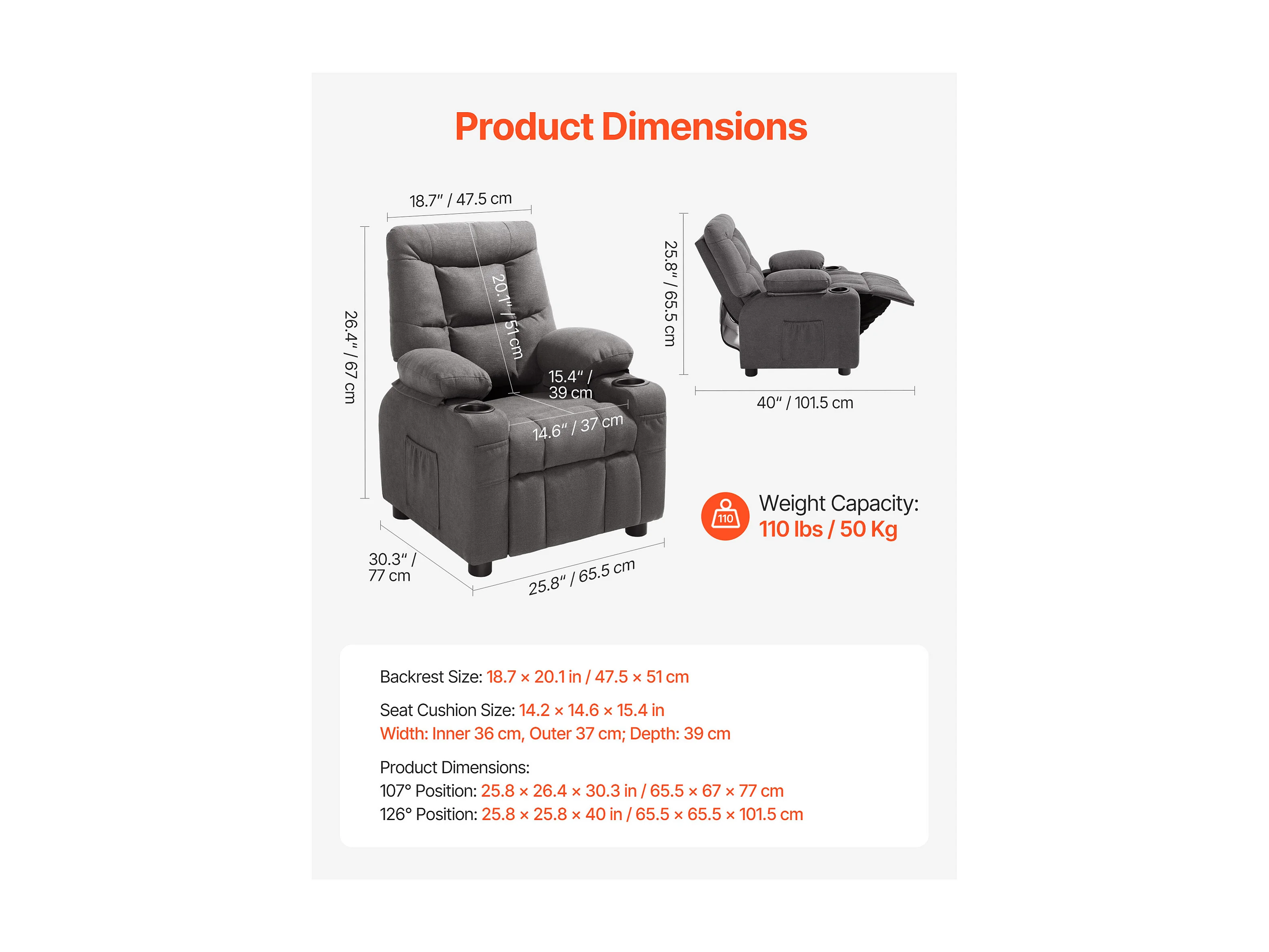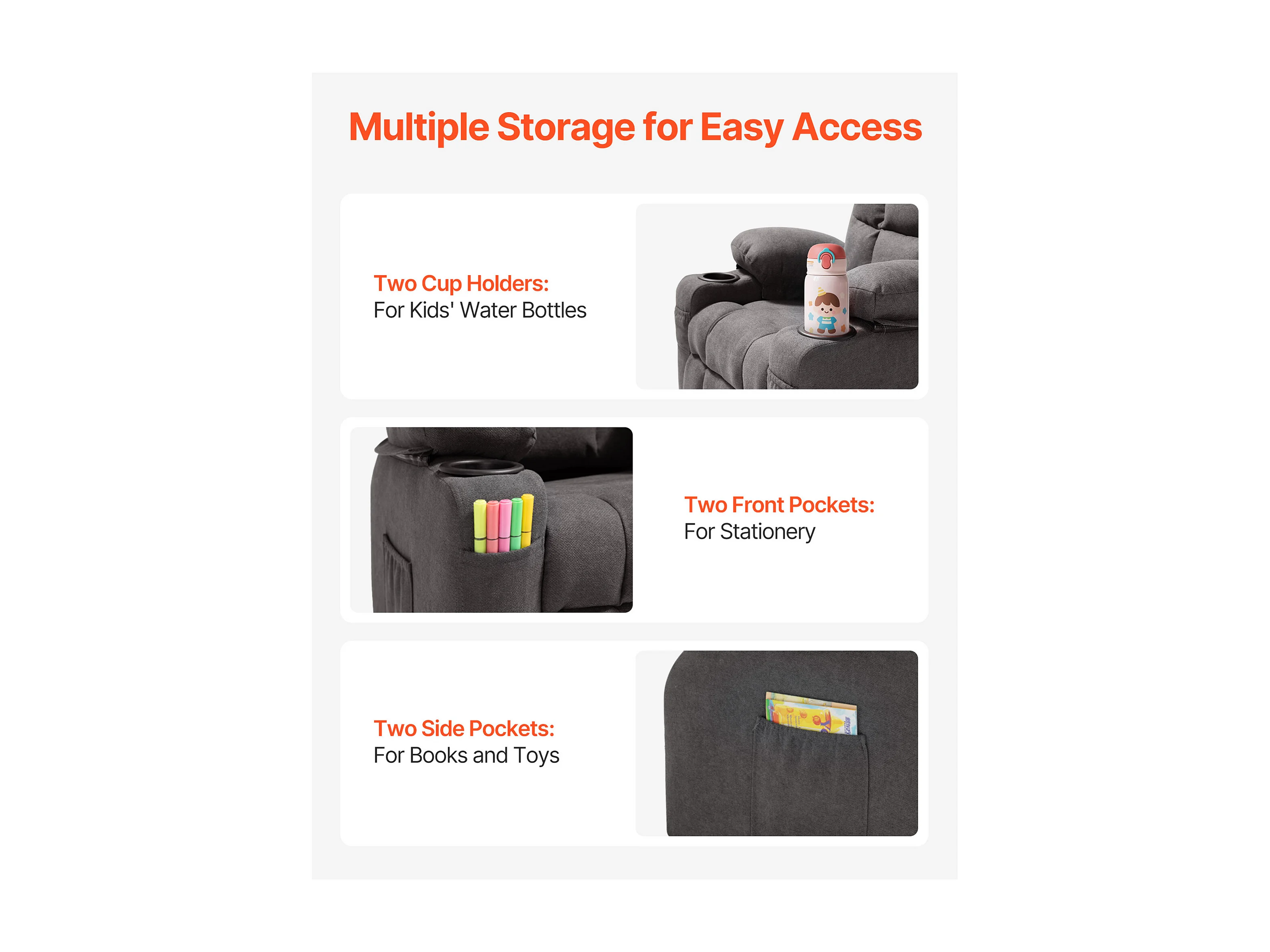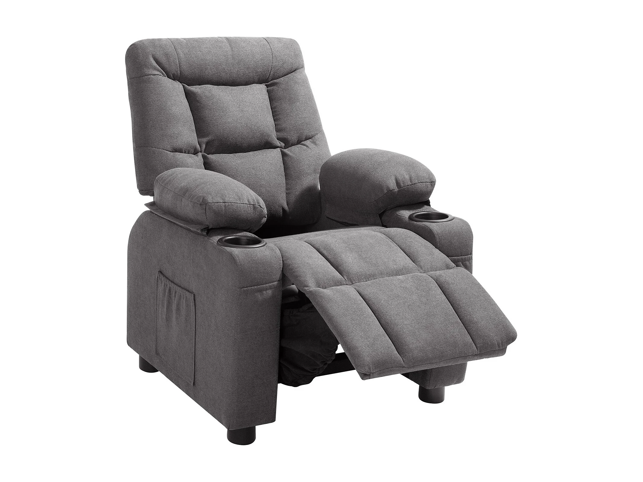Fauteuil Inclinable SucceBuy pour Enfants, Chaise Relax Ergonomique, avec Porte-Gobelets et Poches, Dossier Réglable 107° à 126°, pour Chambre d’Enfants, Gris