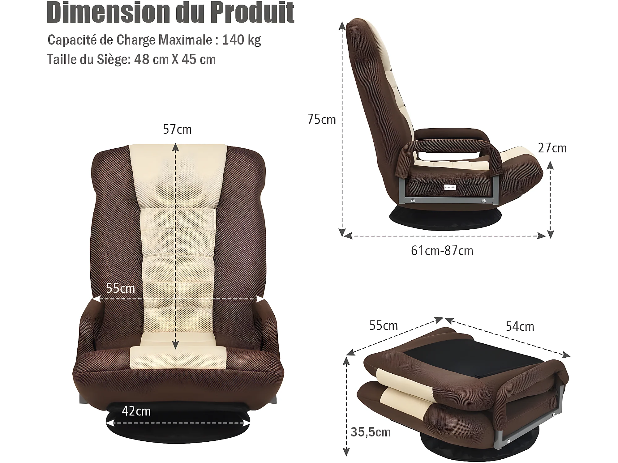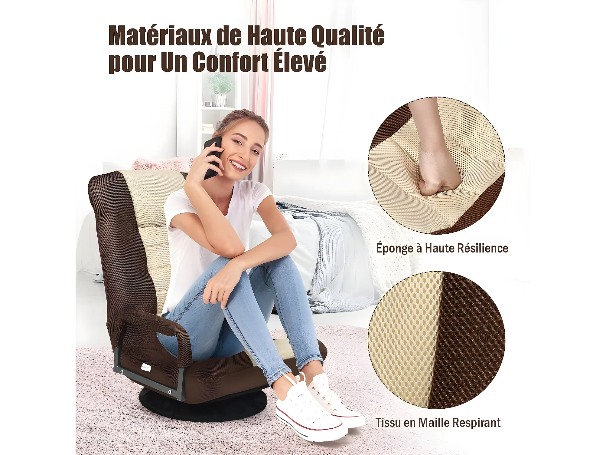 Fauteuil Pliable de Sol,Chaise de Jeu avec Dossier Réglable sur 6 Positions et Base Pivotante à 360°, Cadre en Fer Robuste Marron