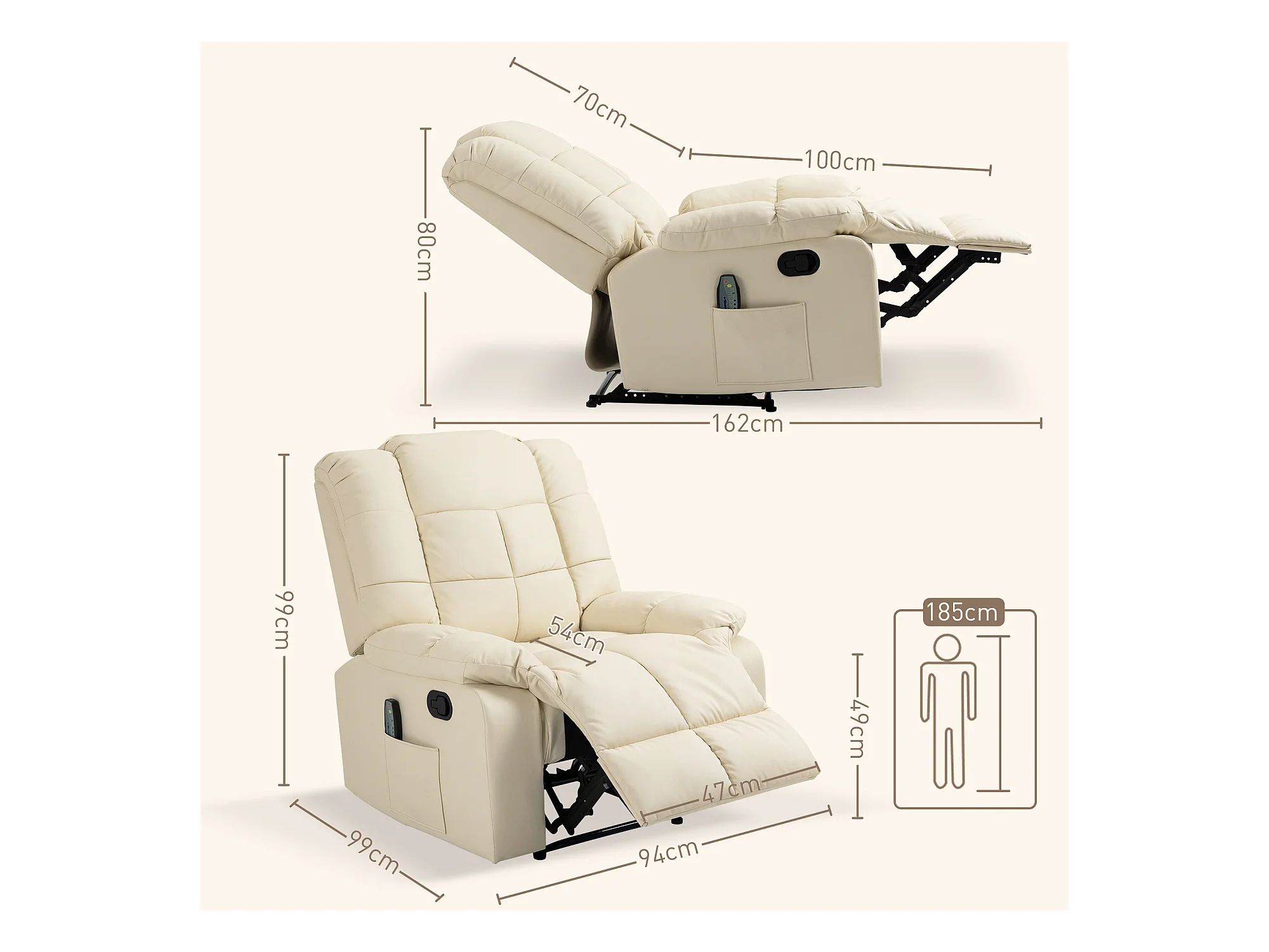Fauteuil relax électrique avec fonction de massage, similicuir, bois, crème (94x99x99 cm)