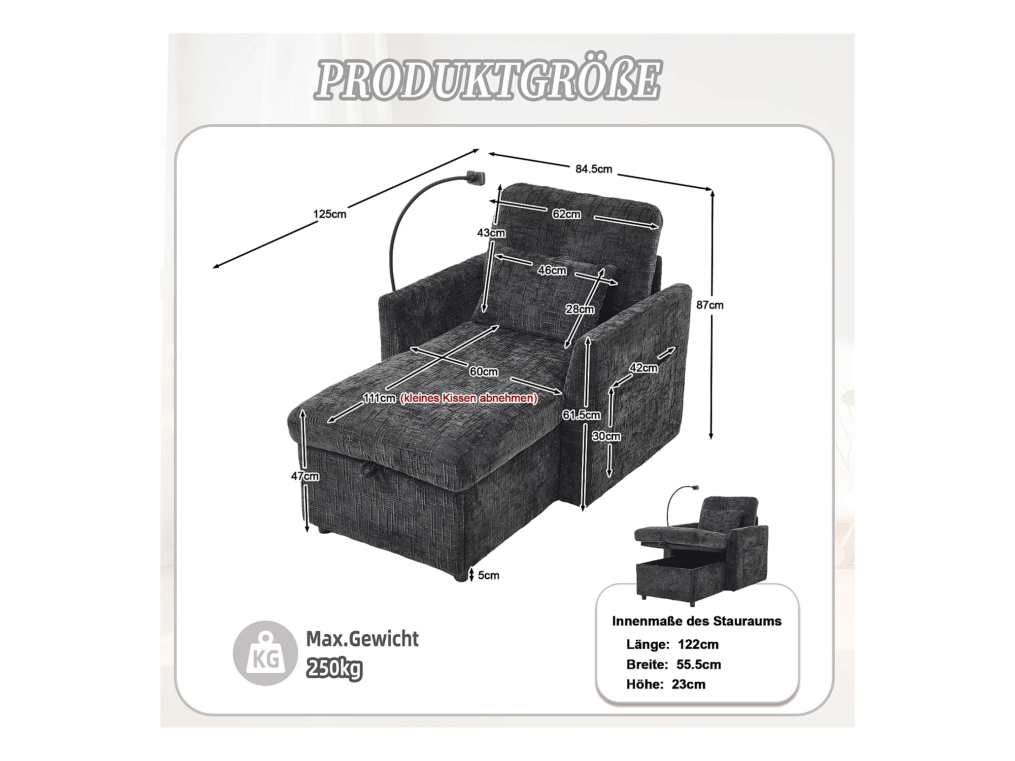 Fauteuil relax multifonction avec dossier escamotable, support pour téléphone, tissu chenille noir (125x84.5x87 cm)