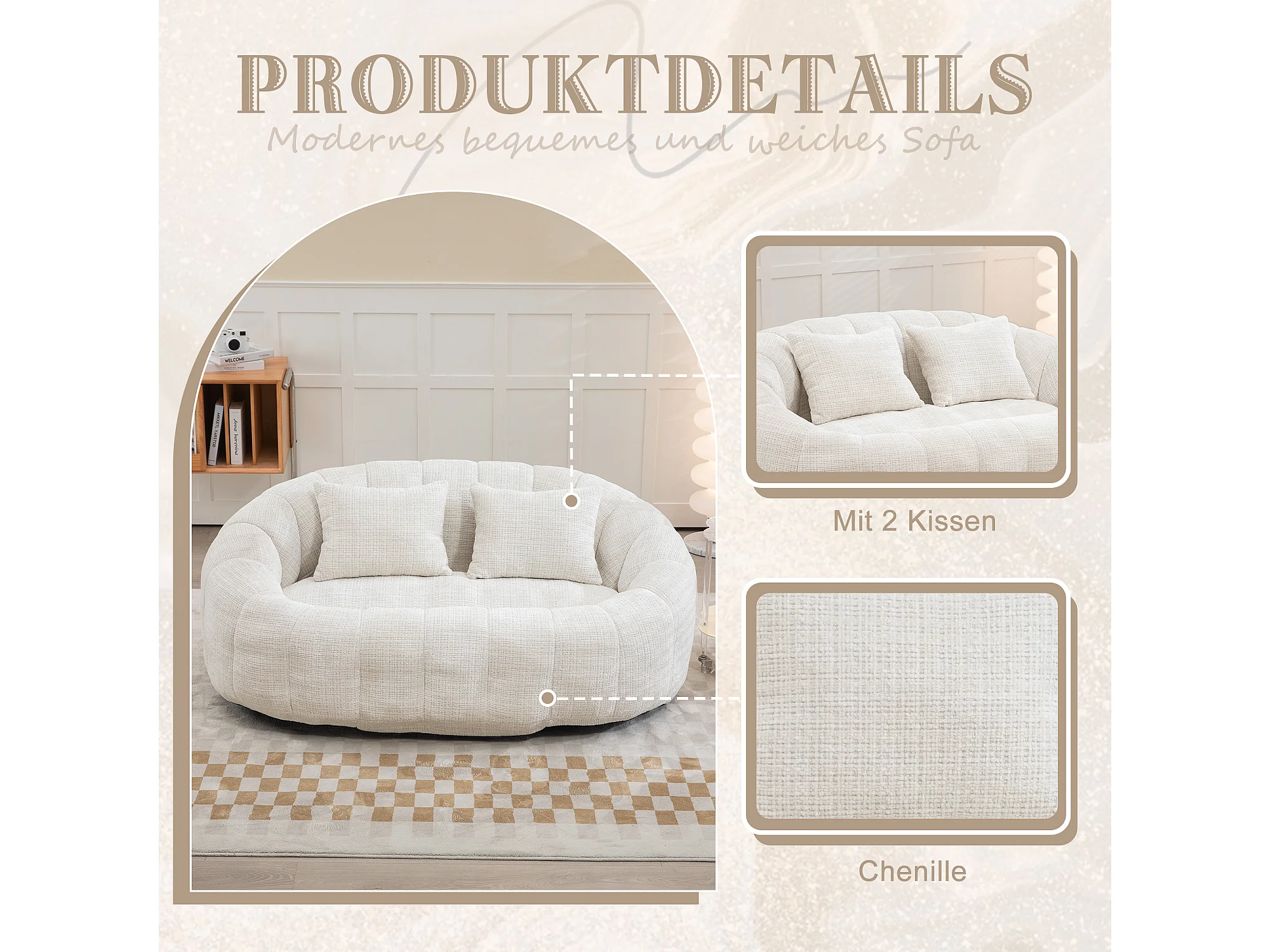 Canapé pouf 2 places beige en chenille – avec deux coussins confortables - fauteuil pouf haut dossier – ultra durable et confortable