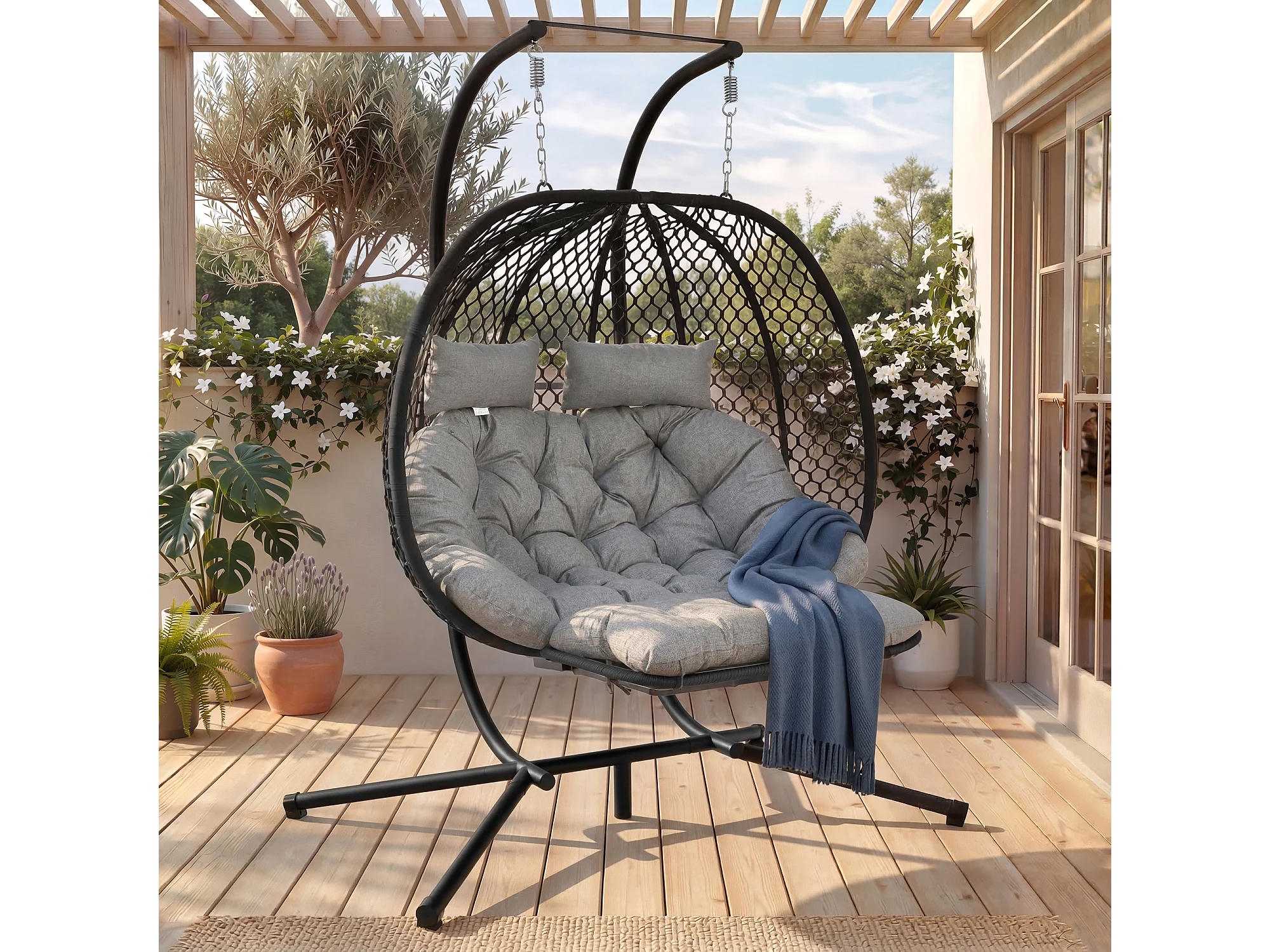 Fauteuil suspendu double de jardin - 140 x 94 x 197 cm - avec support + coussin d'assise + oreiller + repose-pieds - métal - gris